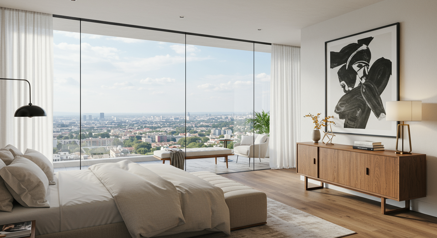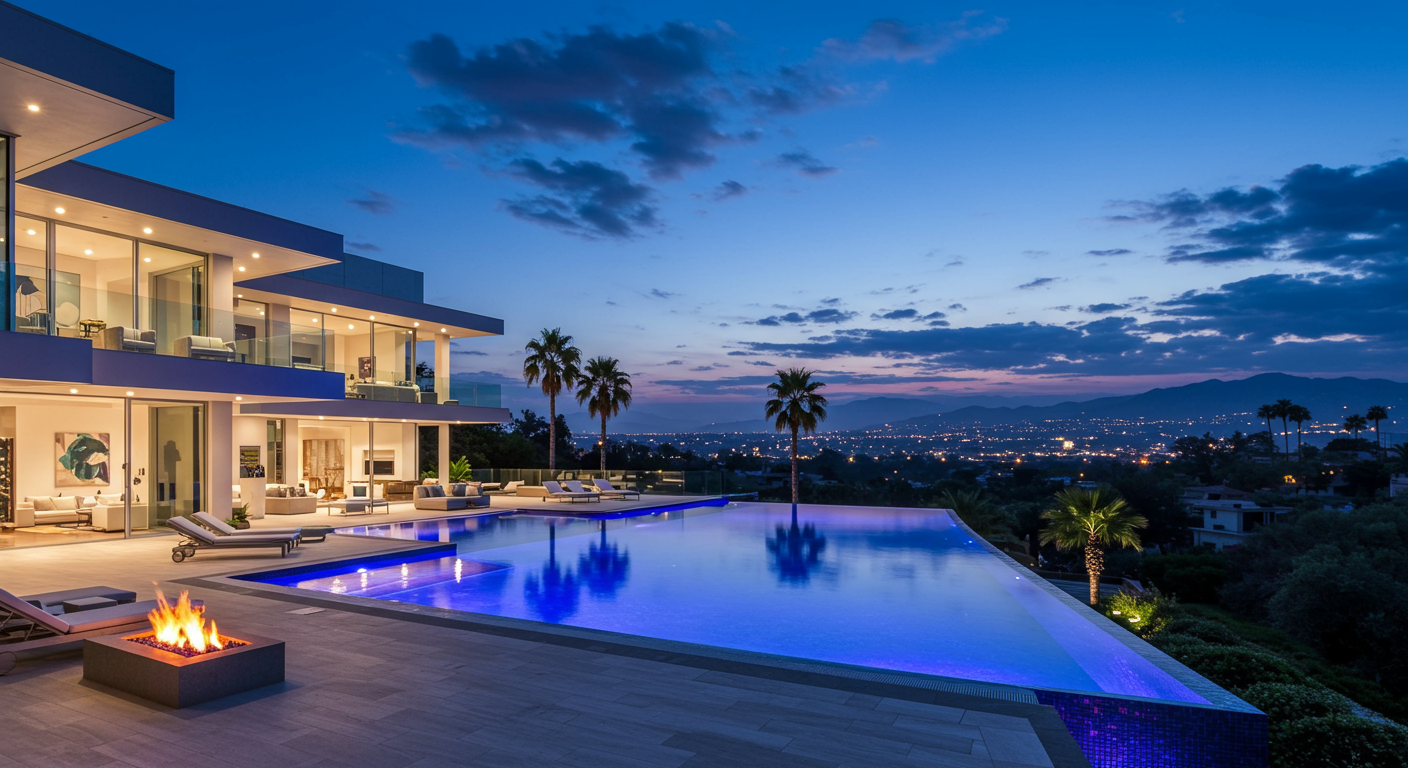 The mansion features five bedrooms, five bathrooms, two powder rooms, and an entirely hardscaped backyard with an outdoor kitchen and infinity pool. The living area is situated on the main level, featuring a vast central space with a fireplace and kitchen sporting black granite countertops. The walls of glass offer a seamless connection to the backyard, providing stunning views of the entire L.A. city skyline, from Downtown skyscrapers to Century City, the Pacific Ocean, and Catalina Island.