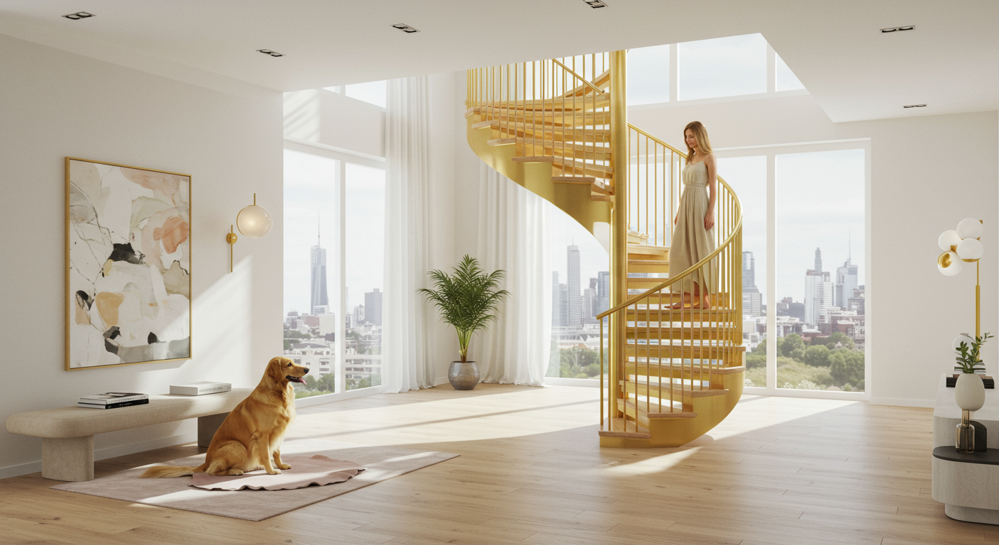 The apartment is 2400 square-foot and includes custom brass detailing, light oak floorboards, and a floating staircase that curls between the two floors. Venetian plaster walls enclosed the structure, and there is a multitude of windows and walls of glass that help to illuminate the penthouse in a spectacular display.