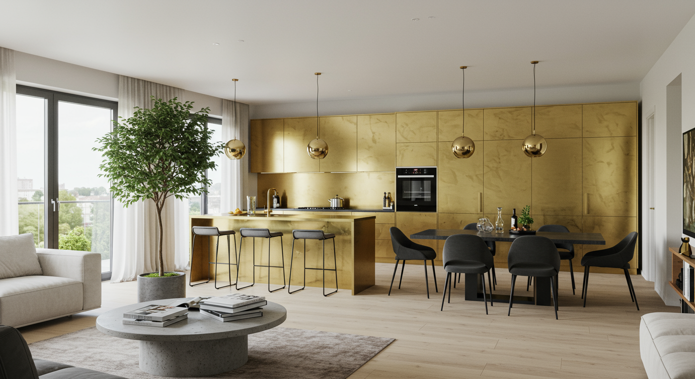 The kitchen cabinets are built with brass, giving a luxurious yet warm look. It is an open plan for the living/dining room space, and there are four terraces that include a lush set of foliage for each terrace. In addition, there are two more terraces, one of which consists of a spa located directly off the main bedroom and on the upper floor.