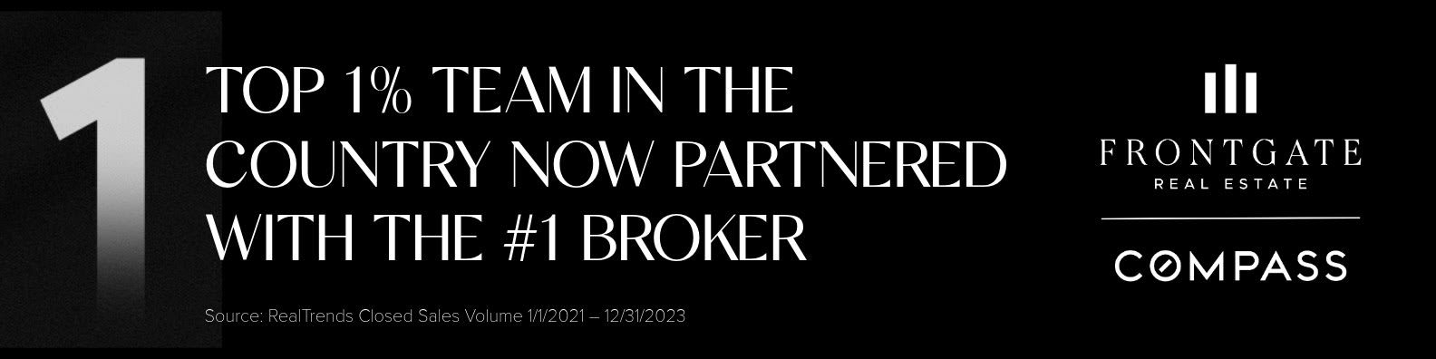 This week, Frontgate Real Estate announces its new partnership with Compass! This partnership not only allows us to operate and grow our brand at Frontgate as a top 1% team in the country, per the Wall Street Journal, but also to partner with Compass, the #1 brokerage in the US. Frontgate is ranked No. 4 in Los Angeles and No. 20 in California on the prestigious 2023 Real Trends' The Thousand list of top medium teams, and boasting impressive lifetime sales totaling $2 billion, the Frontgate team has established itself as a premier agent team in the country.