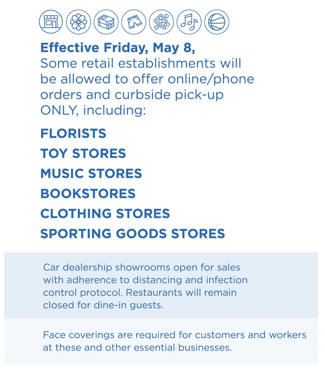 Effective Friday, May 8, some retail establishments will be allowed to offer online/phone orders and curbside pick-up ONLY, including: florists, toy stores, music stores, bookstores, clothing stores, and sporting goods stores. Car dealership showrooms open for sales with adherence to distancing and cleaning and infection control protocol. Restaurants will remain closed for dine-in guests.