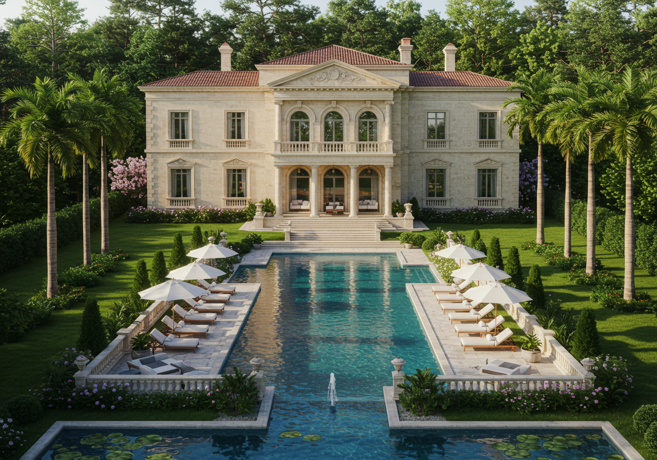 The architecture of Venice and Byzantium is brought to life in this palatial home. With an opulent design, La Palais Vénitien offers luxurious features such as a private lake with tennis courts and a large outdoor pool that make it one-of-a-kind on our list!