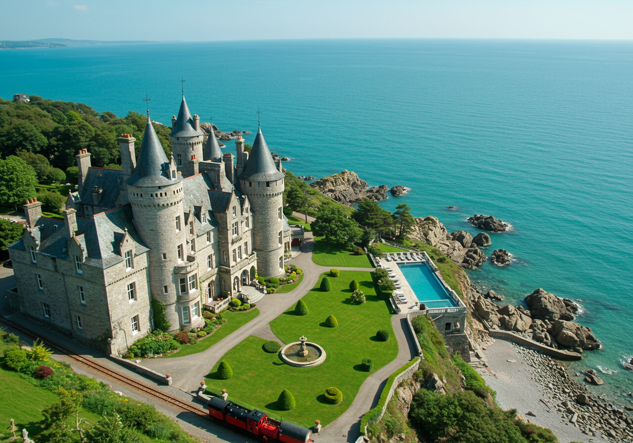 The grandeur of this 43,056 square foot living space property is set on a ten-acre lot and stands tall over surrounding landscapes. A traditional medieval castle has been transformed into an elegant hotel with many individual buildings including church houses that are sure to impress any guest!