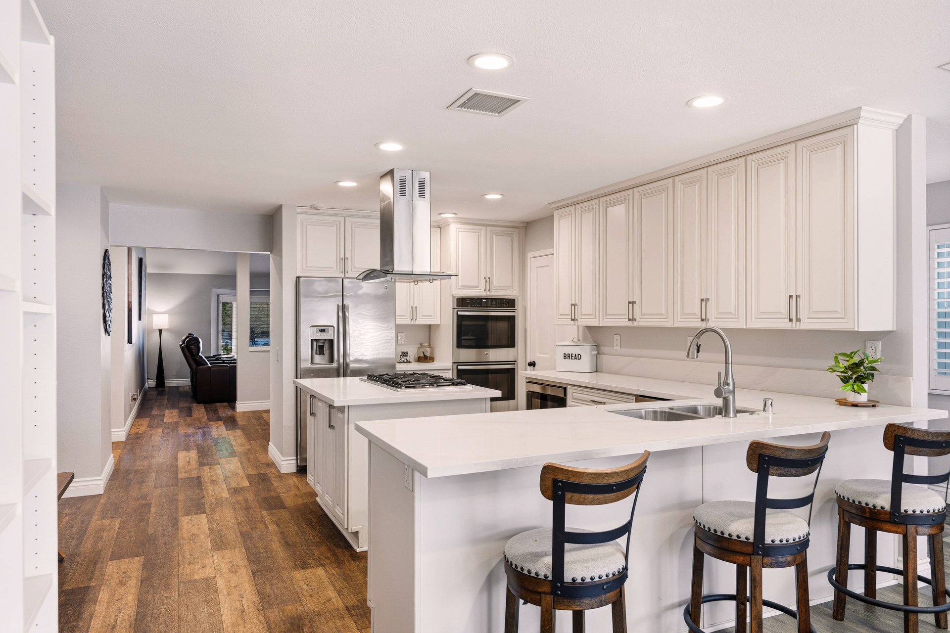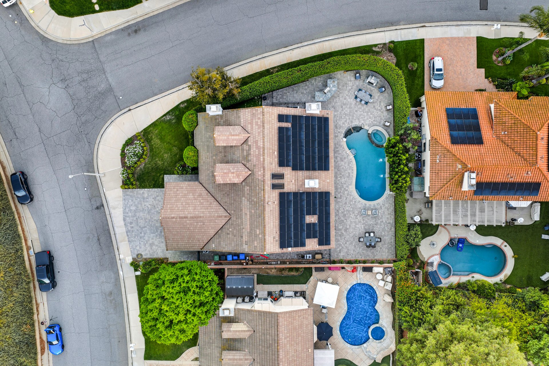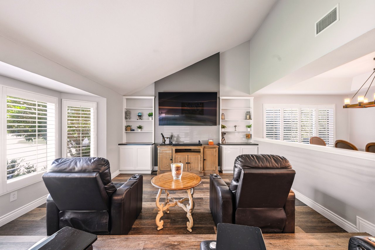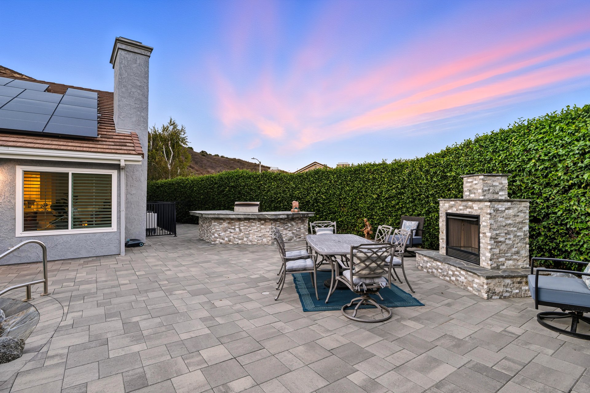 Resort-Style Backyard: Step through dual-pane sliding glass doors into a private oasis. The redesigned backyard features a sparkling pool and spa with swim jets, a built-in BBQ station, and an outdoor fireplace for cool California evenings.