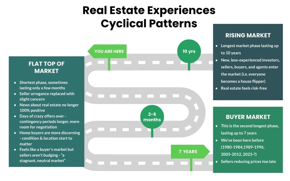 Real estate experiences cyclical patterns that can be characterized as up, flat, down, flat, up, flat, down. While this cycle can provide an overview of past trends, it may not always accurately predict future market conditions.