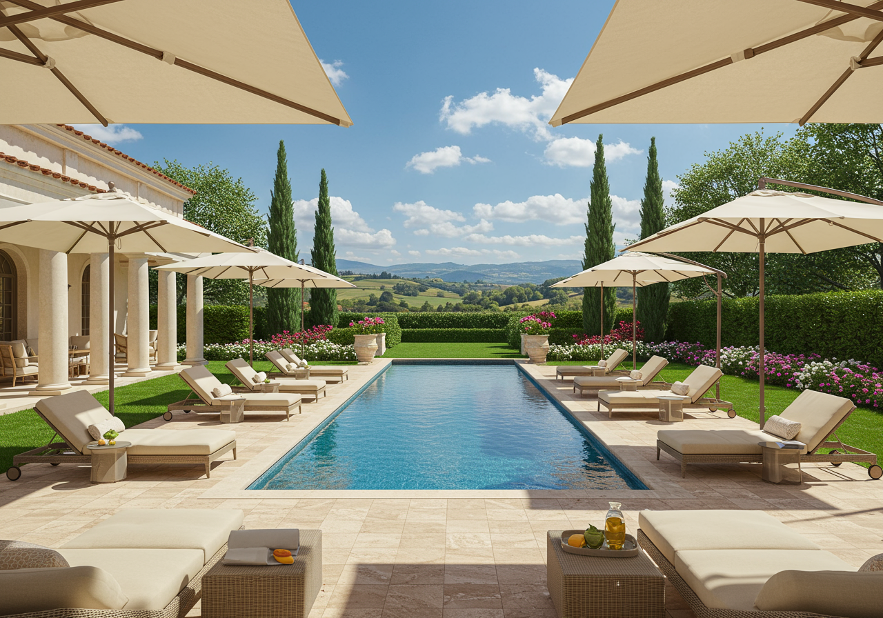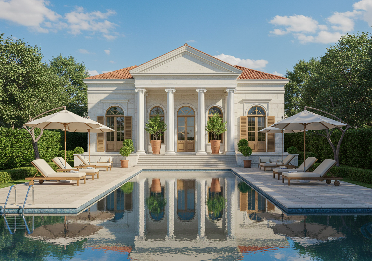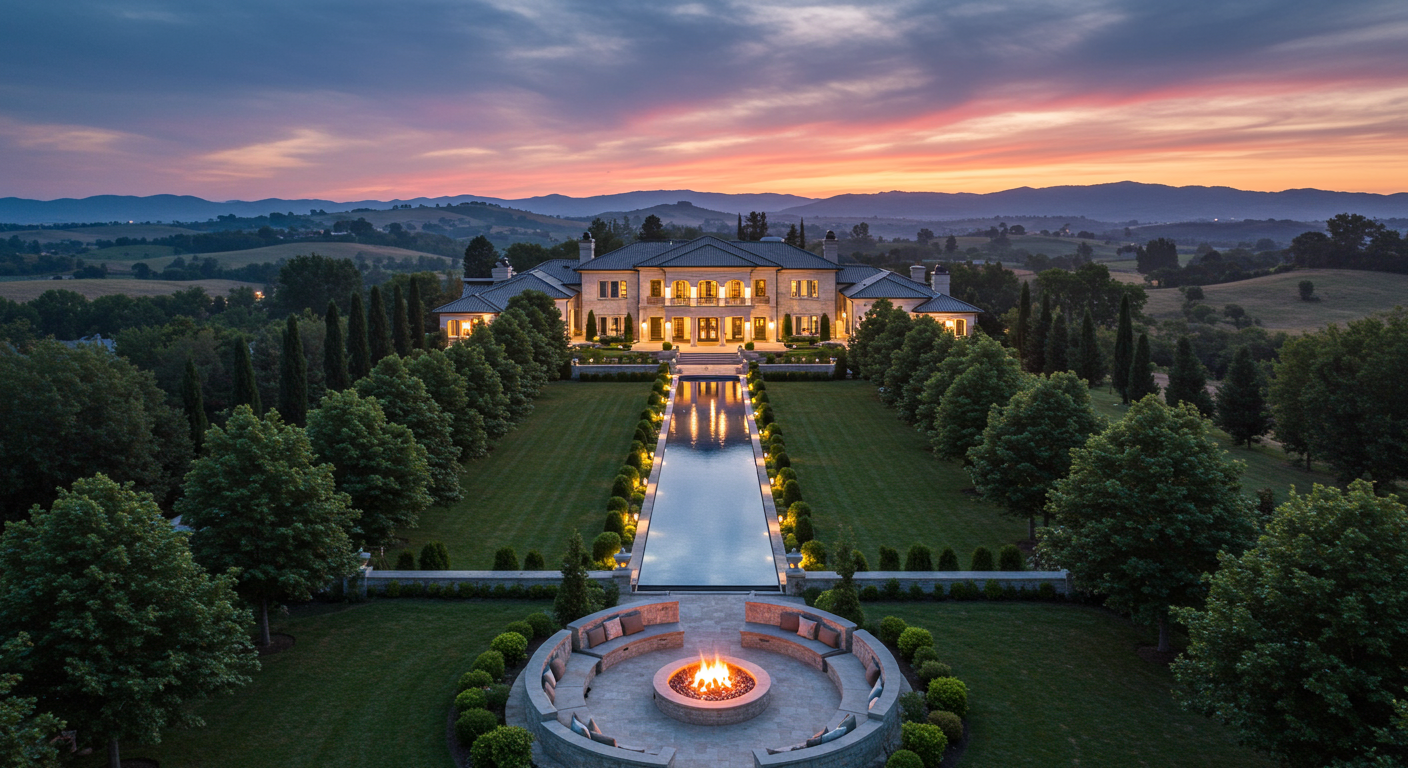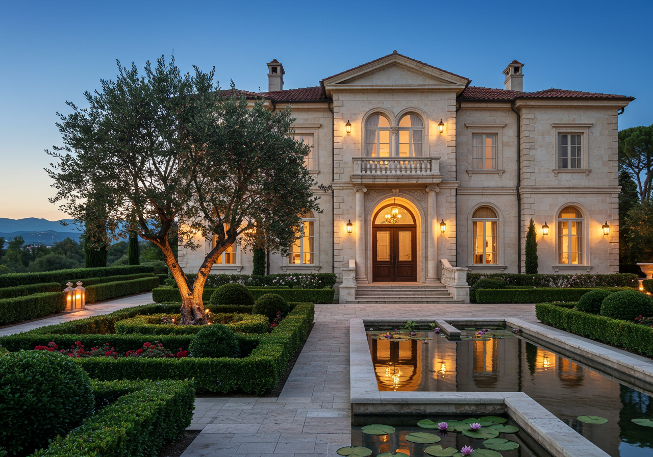 The entire estate was created by combining four massive adjacent lots, three of them located on a cul-de-sac that Tull was able to privatize and gate. Within those gates, Tull built a chateau in the style of 18th-century French architecture, and surrounded it with formal gardens, stone bridges, and four cascading pools, inspired by the gardens of the Impressionist painter Claude Monet at Giverny in France.