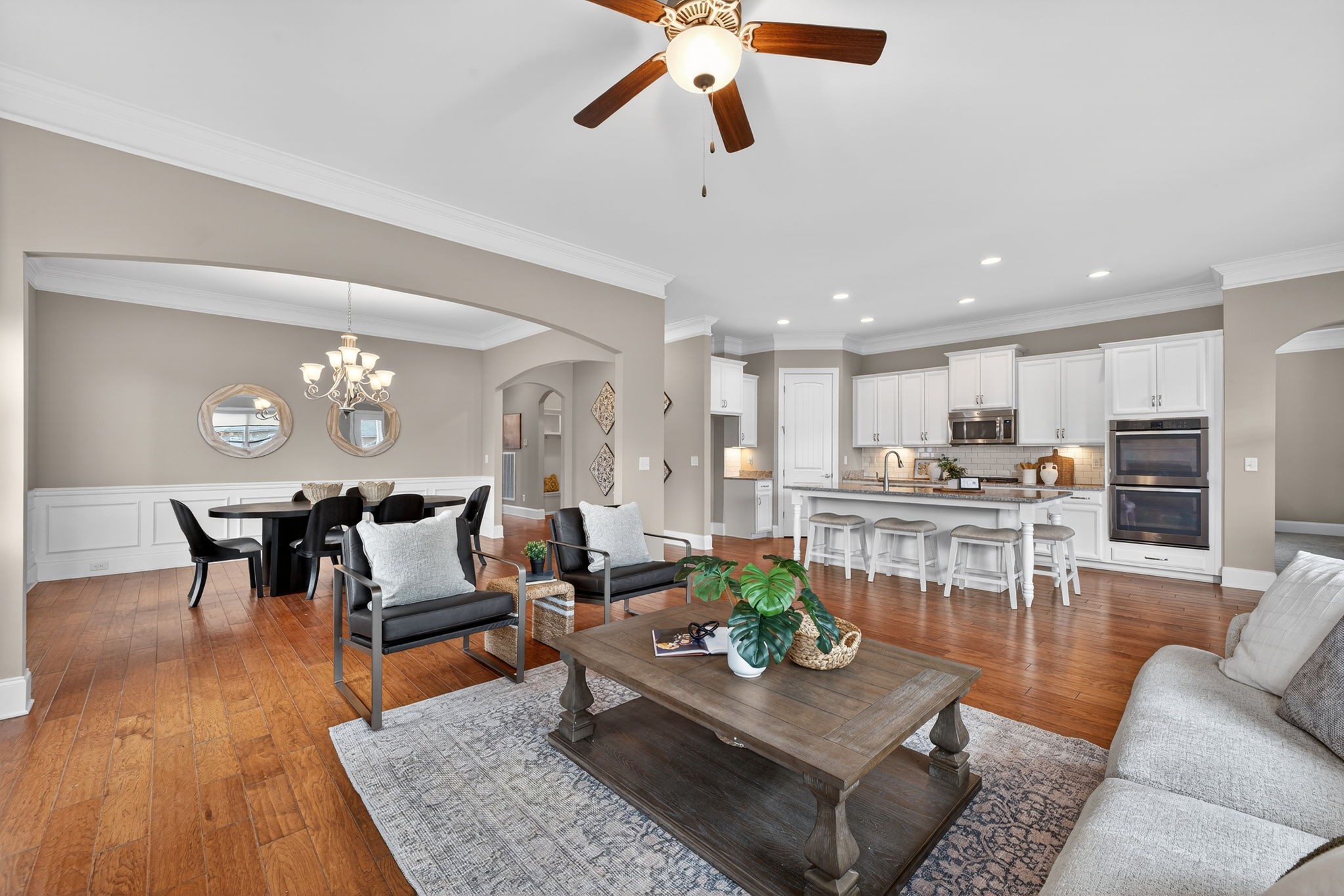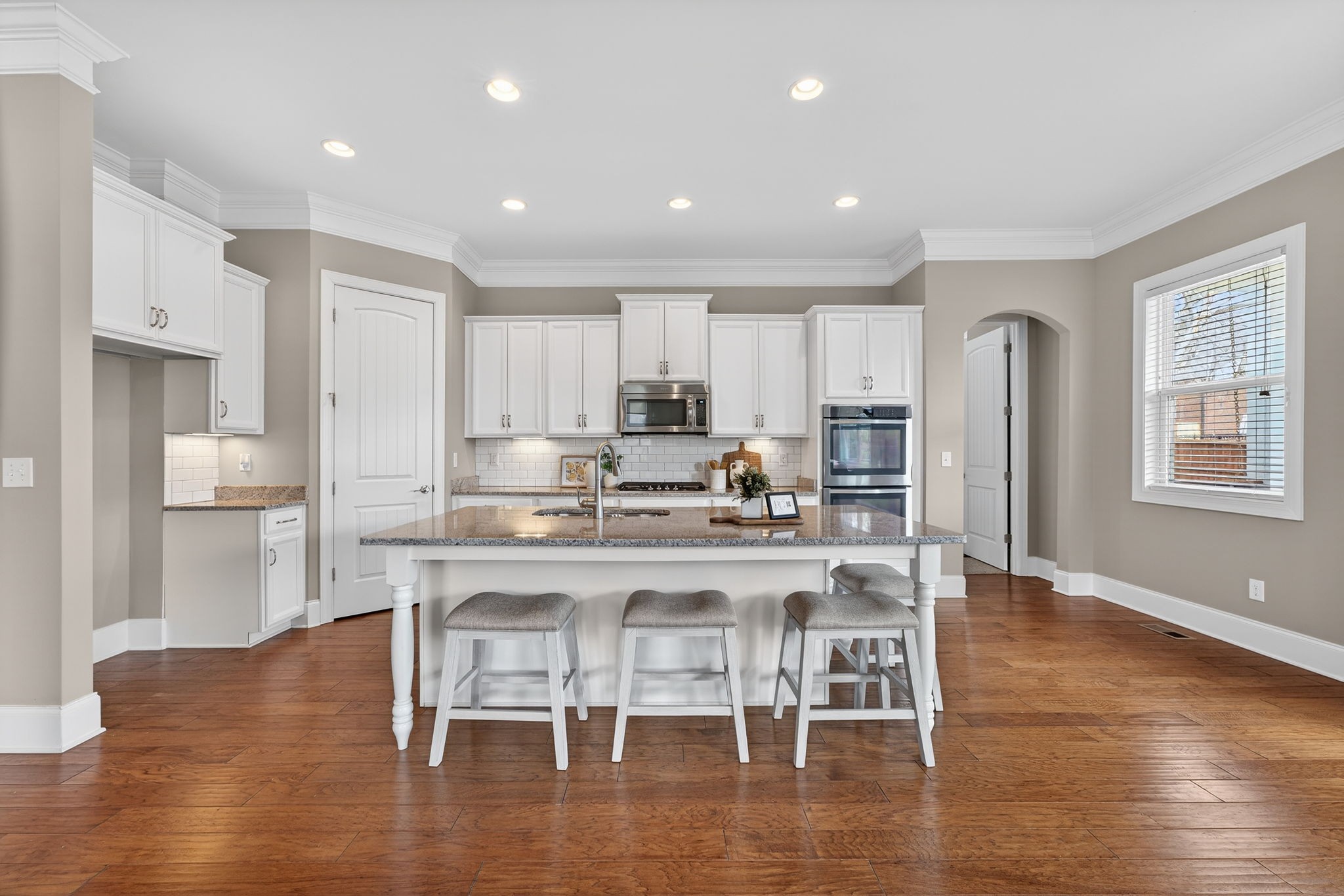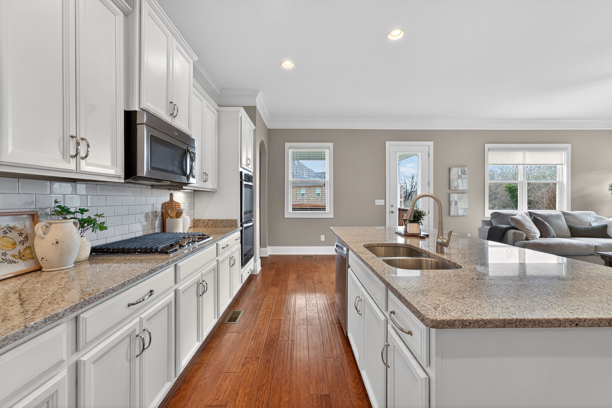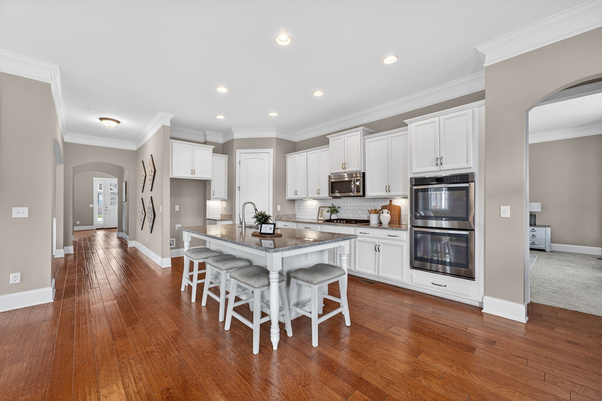 Set within the established Saint Blaise Retreat community, the main level features 10-foot ceilings, hardwood flooring in primary living areas, and an open layout connecting the living room, kitchen, and dining spaces. The kitchen is equipped with granite countertops, double ovens, ample cabinetry, and generous prep space--ideal for both everyday living and entertaining.