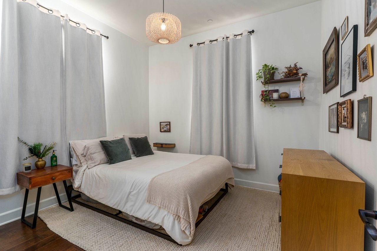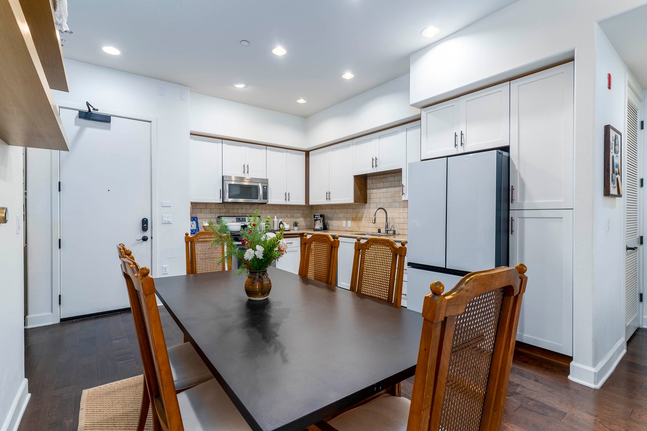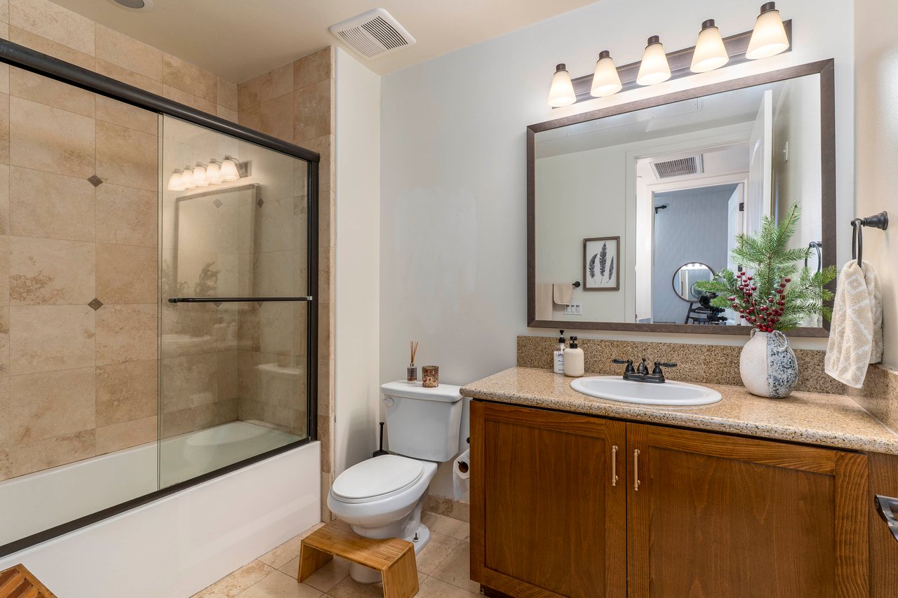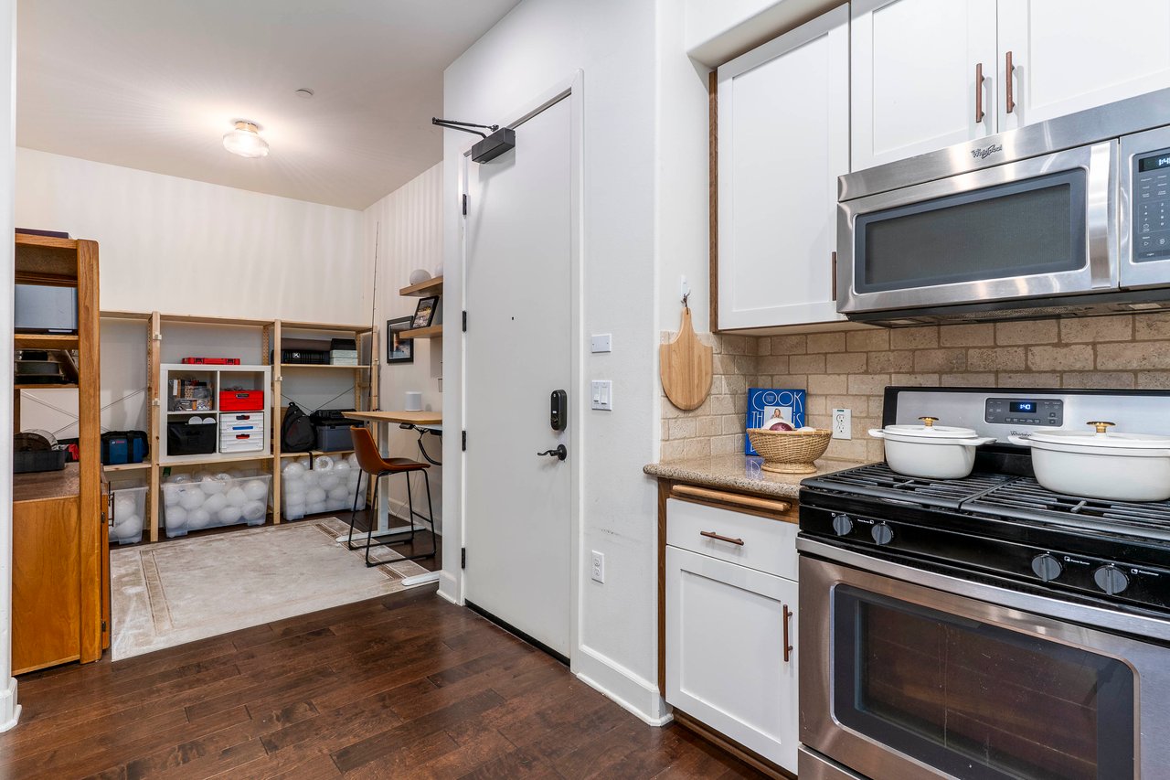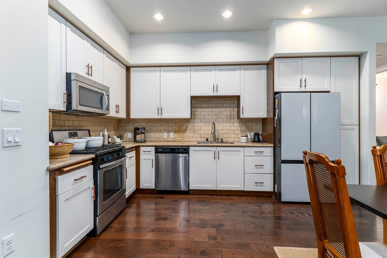 The kitchen is designed with functionality in mind, featuring ample counter space and storage options. The condo's layout includes a cozy nook perfect for a home office. The main living space is flanked by two well-sized bedrooms. The primary suite boasts a walk-in closet, providing generous storage space for your wardrobe and personal items.