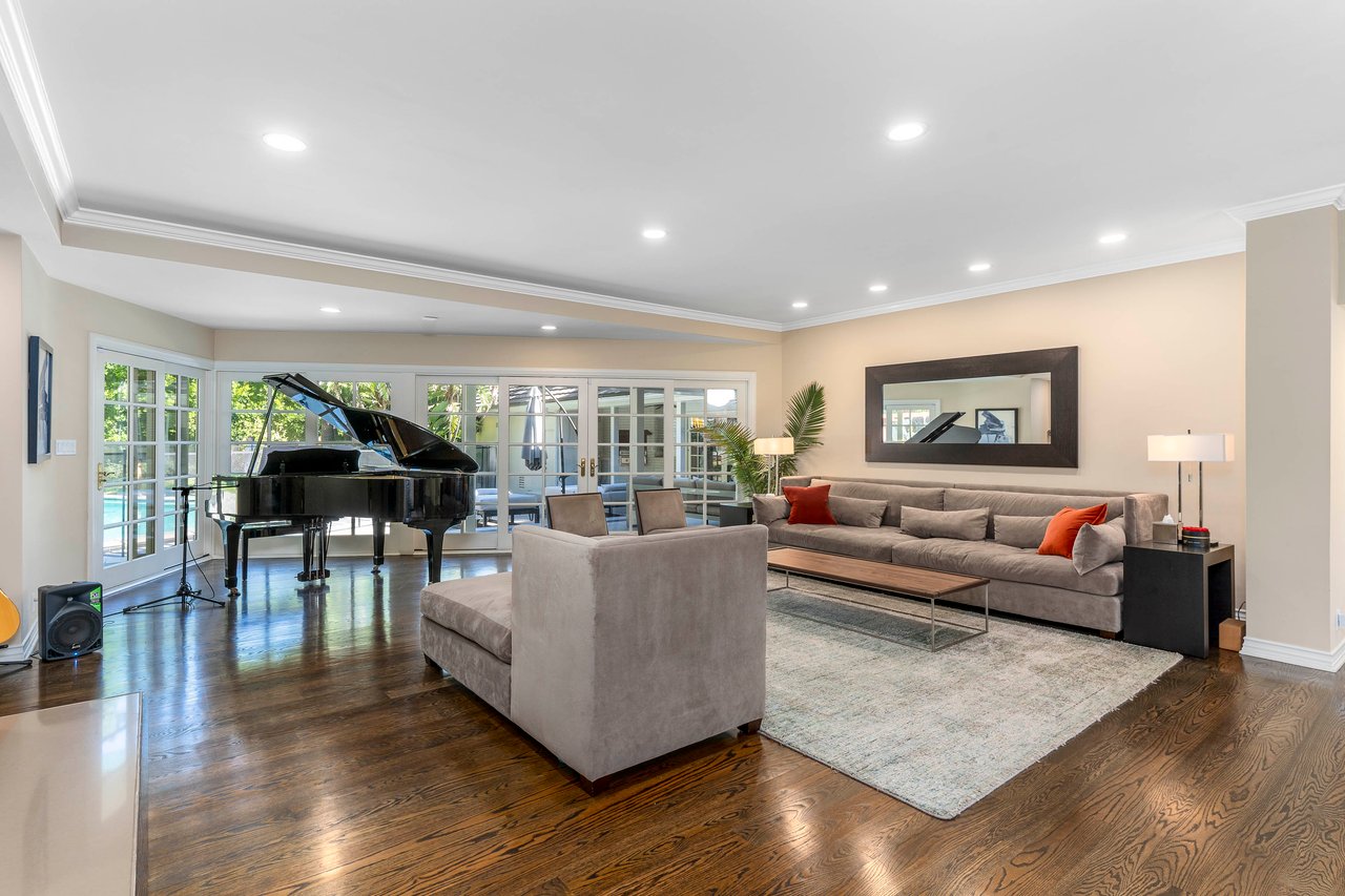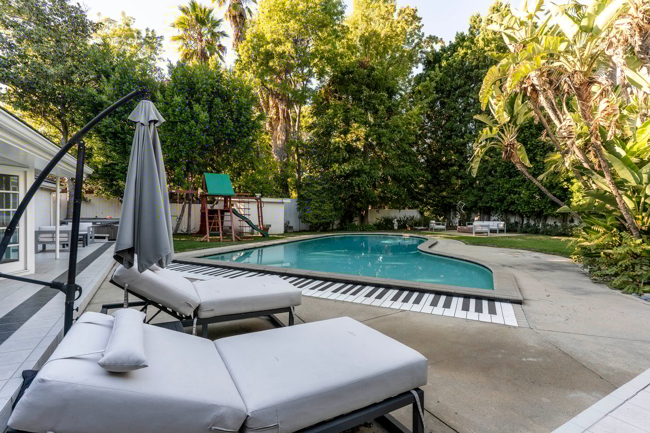Outdoors, the legendary piano pool takes center stage, surrounded by lush landscaping, multiple patios, and generous areas for lounging and dining an entertainer's dream and a perfect backdrop for unforgettable gatherings.