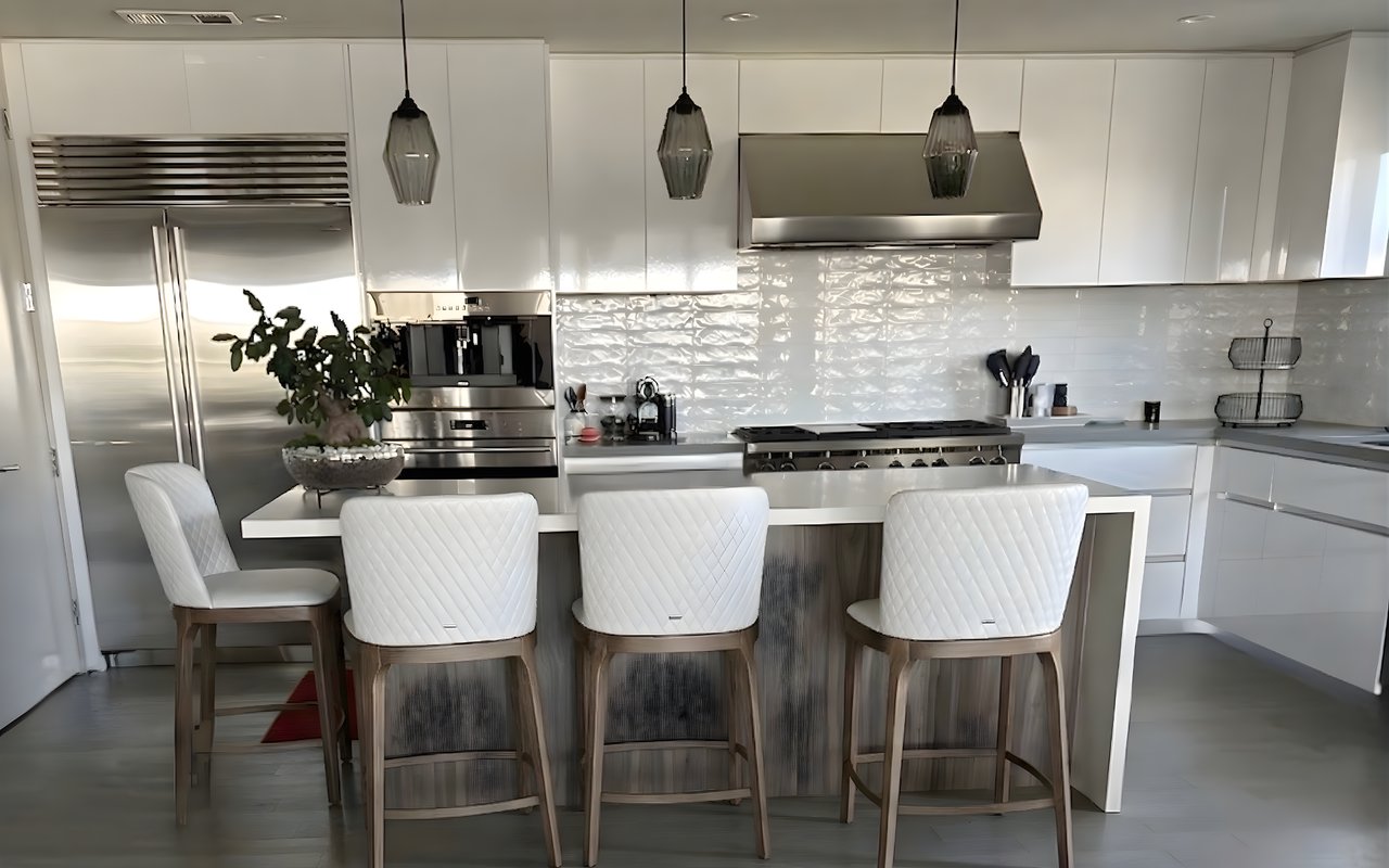 The chef's center island kitchen is designed for both function and style, showcasing premium Wolfe & SubZero appliances, stone countertops, and upgraded cabinetry. It connects naturally to the dining area and living room, creating a simple, elegant setting where gathering feels effortless.