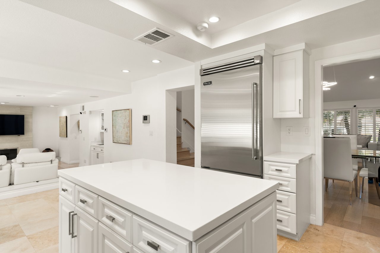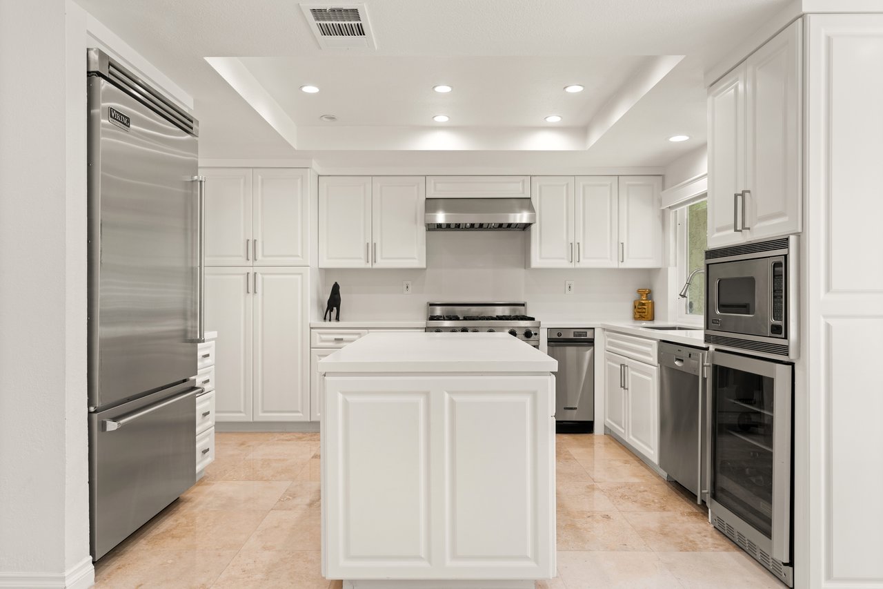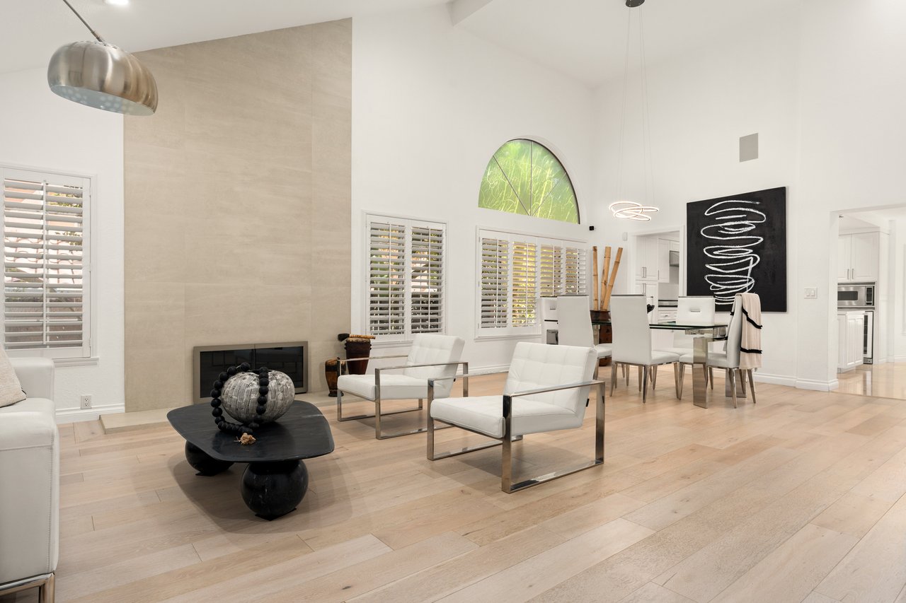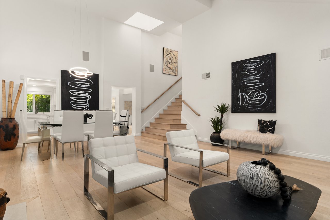 Upon entry, you're welcomed into a dramatic two-story living room with soaring ceilings, expansive picture windows, a gorgeous fireplace, and beautiful wood flooring that flows throughout. A stunning staircase serves as the home's centerpiece, while skylights throughout fill the space with soft, natural light. The bright kitchen features Viking appliances, sleek cabinetry, and a large island perfect for both everyday living and entertaining.