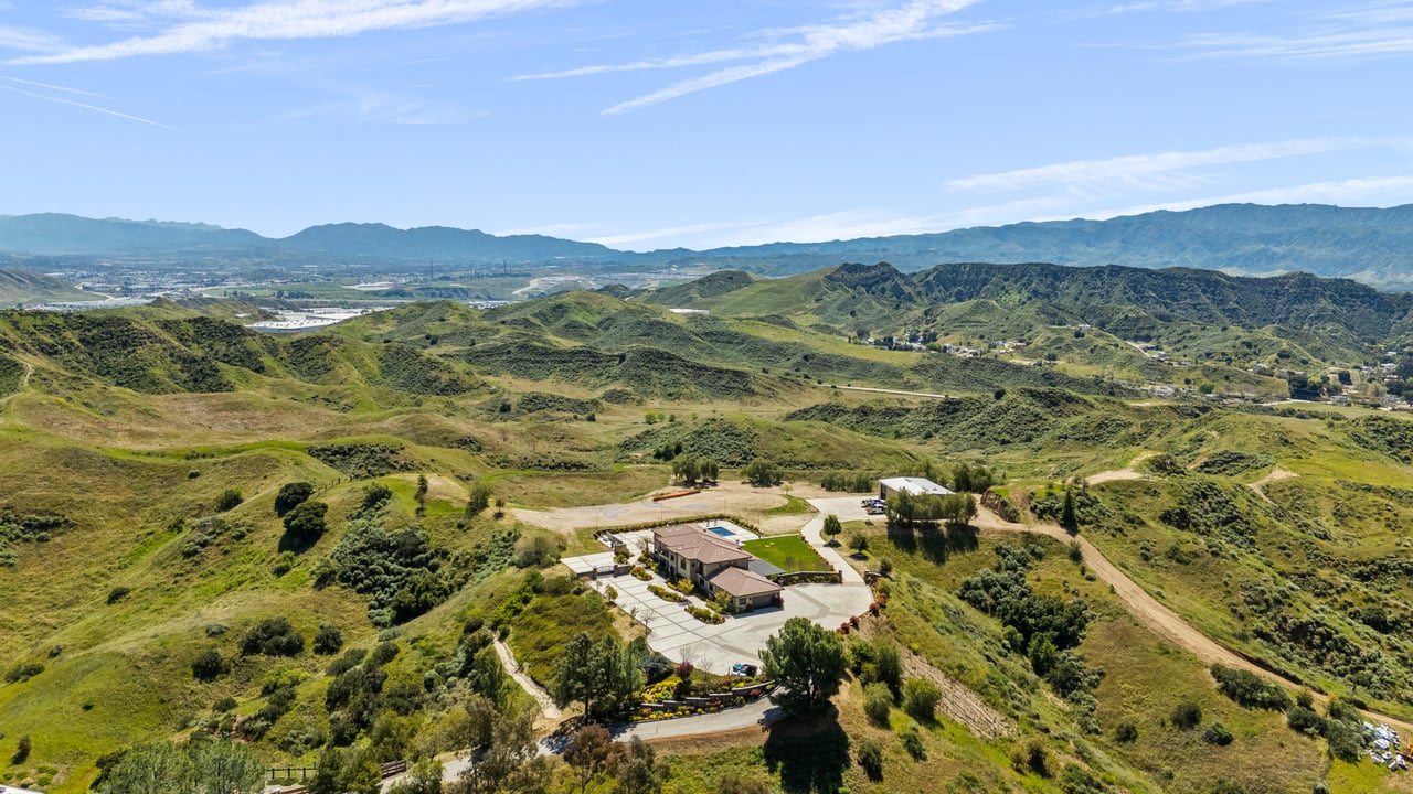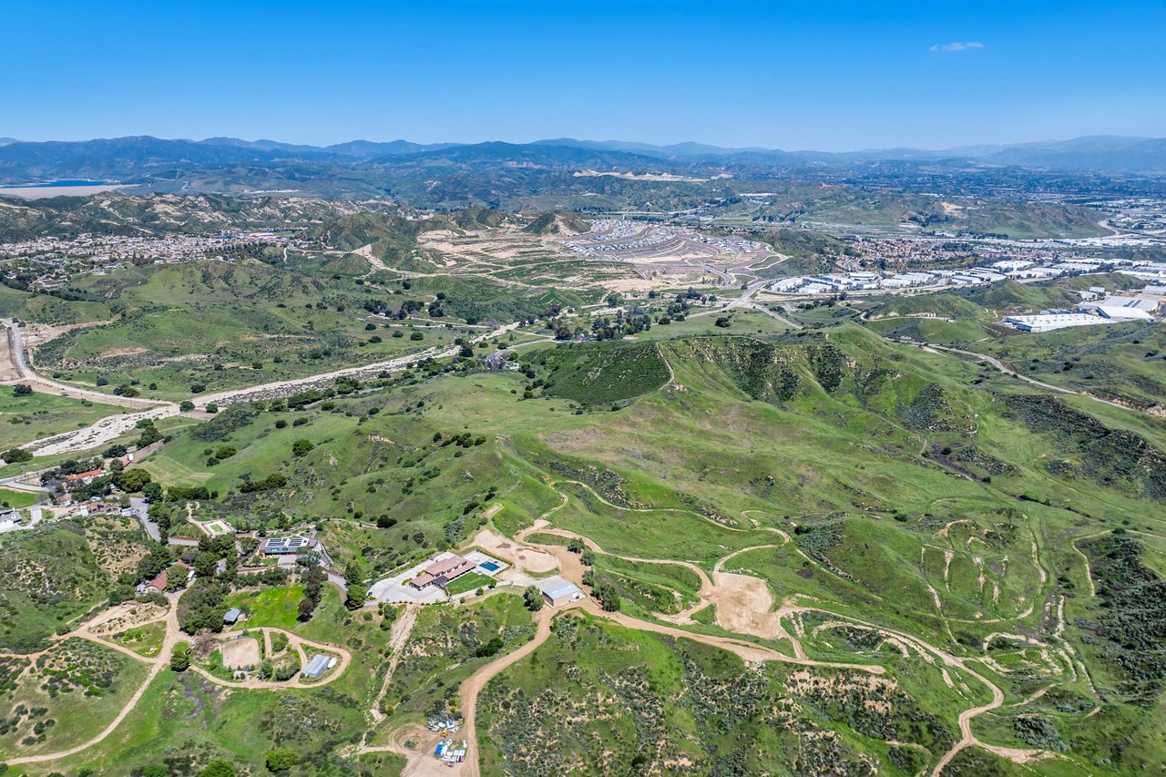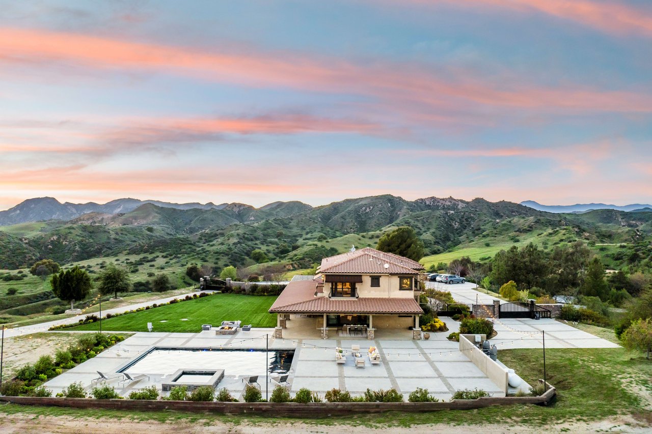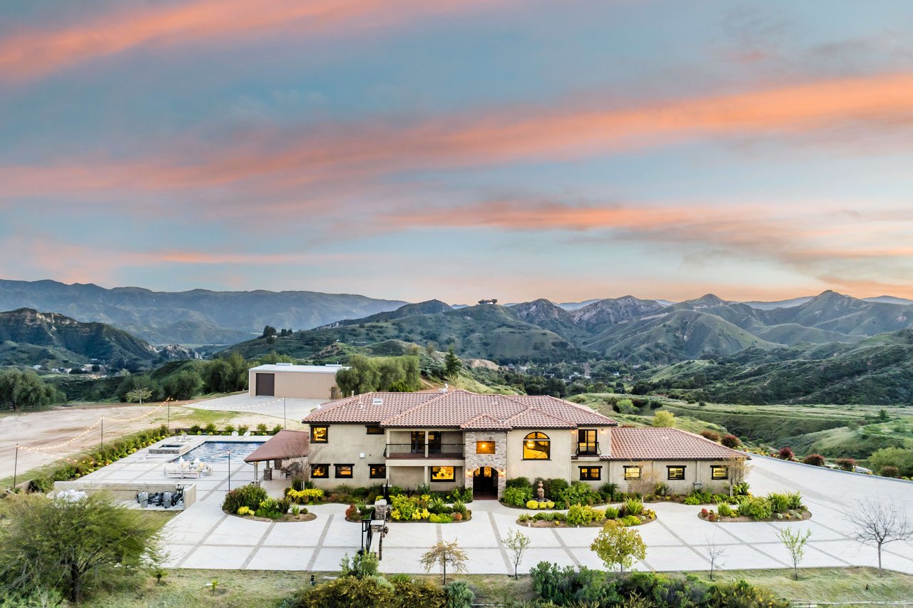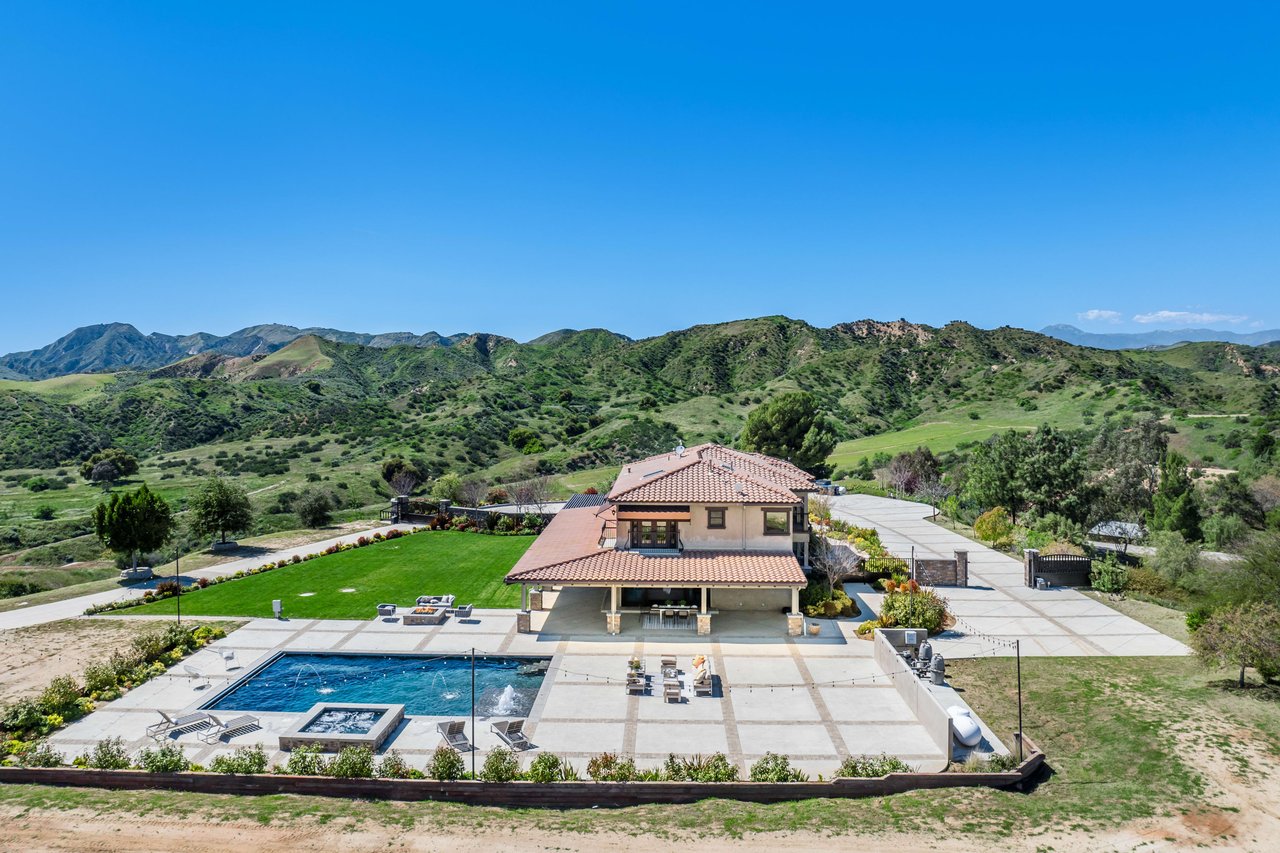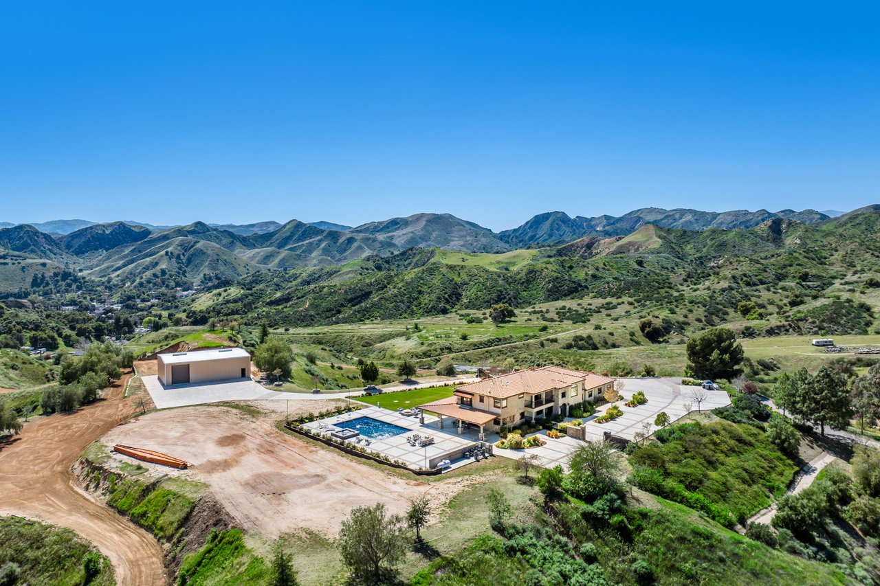 Rare opportunity to own 22-acre ridgetop luxury residence. A pristine 5-bedroom, 5-bath, + office home is positioned on a 3.5-acre pad, combining residential luxury with the spirit of adventurous living. Located atop a private road, this flag-lot estate offers tranquility and panoramic views. Private, double-gated entry. The estate includes 3-car finished garage w/laundry room, separate 2400 sf workshop with space for RVs, boats, motorcycles; motocross rally track; secluded location has been used for feature films and Emmy award-winning tv shows. Grand foyer, arched stone hallway leads to the family room, with panoramic views, fireside living space. Oversized sliding glass doors seamlessly integrate indoors/outdoors, open to patio dining, entertaining space. Rich mahogany windows and doors throughout. Chef s kitchen provides ultra-premium Wolf and Sub-Zero appliances, custom cabinetry, walk-in pantry. Huge main floor primary suite featuring walk-in closets, luxury bathroom with Italian Noce tile, and French doors that lead out to the patio. Also on the main floor: stylish office with custom built-ins, French doors to the wrap-around patio. Majestic staircase ascends to the 2nd floor mezzanine. 700+ sf loft area w/built-in cabinetry provides ample room for a media room, library, +/or home gym. Primary suite is replete with lavish bathroom, whirlpool bath, separate glassed-in double shower, walk-in closets, W/D, and French doors to dual balconies, overlooking sunsets, pool, and city lights. Three additional upstairs bedrooms and 2 baths provide privacy, comfort. Outdoors, a sparkling saltwater pool awaits, built-in fire pit, and 1200+ sf covered patio. An idyllic retreat for relaxation or entertaining. Located in LA County entertainment industry location zone, minutes to Santa Clarita s town center or Castaic Lake, half-hour to Ventura beach. Freeway access to Los Angeles. Abutting 42-acre parcel available for purchase separately, which could bring the total acreage 60+ acres.