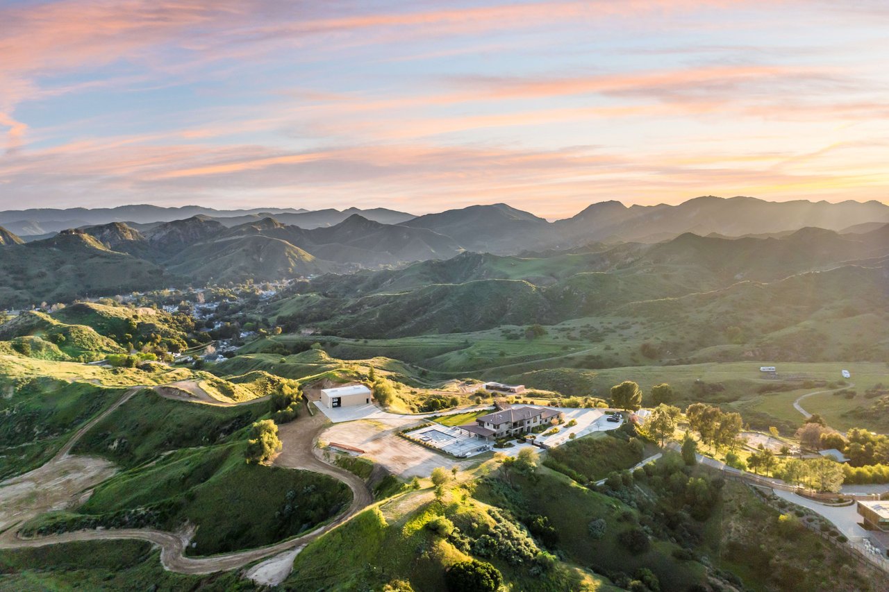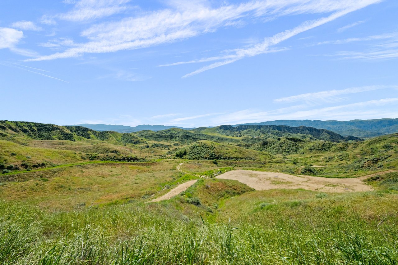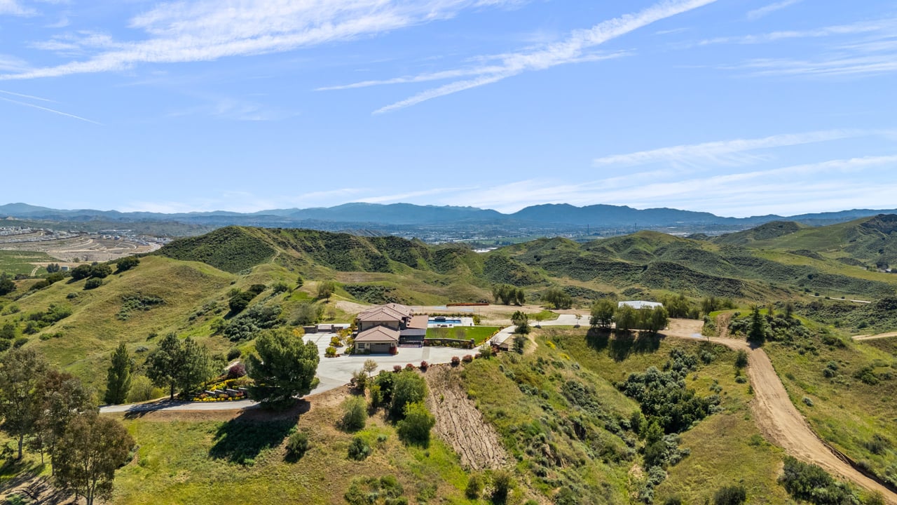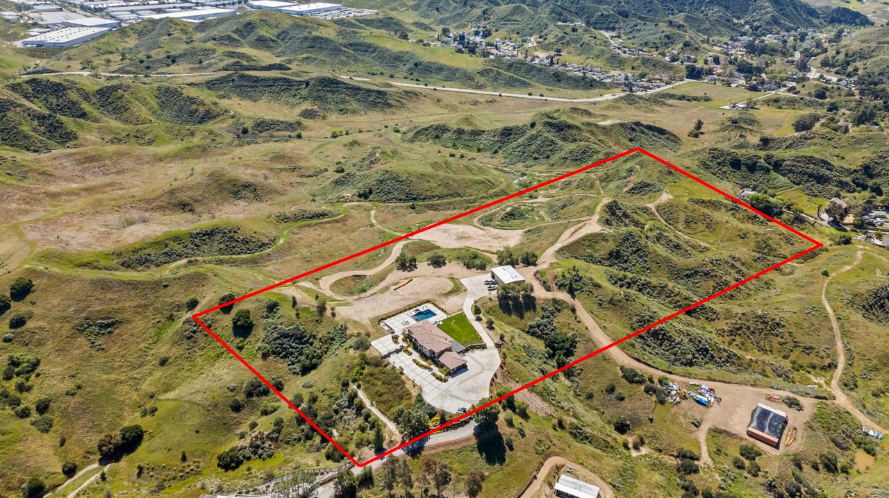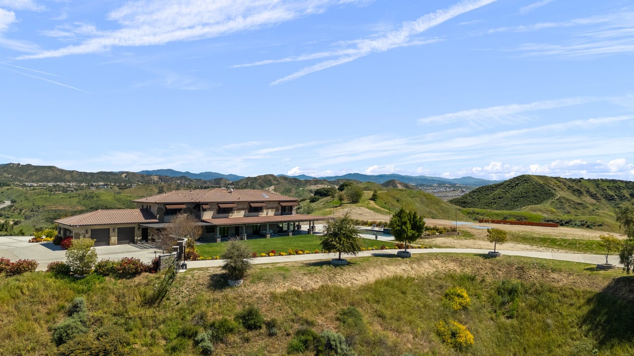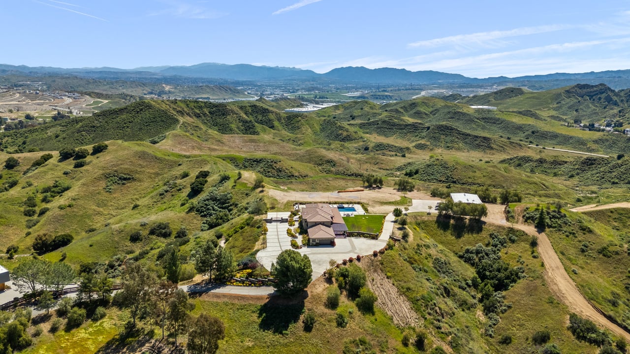 Rare opportunity to own 22-acre ridgetop luxury residence. A pristine 5-bedroom, 5-bath, + office home is positioned on a 3.5-acre pad, combining residential luxury with the spirit of adventurous living. Located atop a private road, this flag-lot estate offers tranquility and panoramic views. Private, double-gated entry. The estate includes 3-car finished garage w/laundry room, separate 2400 sf workshop with space for RVs, boats, motorcycles; motocross rally track; secluded location has been used for feature films and Emmy award-winning tv shows. Grand foyer, arched stone hallway leads to the family room, with panoramic views, fireside living space. Oversized sliding glass doors seamlessly integrate indoors/outdoors, open to patio dining, entertaining space. Rich mahogany windows and doors throughout. Chef s kitchen provides ultra-premium Wolf and Sub-Zero appliances, custom cabinetry, walk-in pantry. Huge main floor primary suite featuring walk-in closets, luxury bathroom with Italian Noce tile, and French doors that lead out to the patio. Also on the main floor: stylish office with custom built-ins, French doors to the wrap-around patio. Majestic staircase ascends to the 2nd floor mezzanine. 700+ sf loft area w/built-in cabinetry provides ample room for a media room, library, +/or home gym. Primary suite is replete with lavish bathroom, whirlpool bath, separate glassed-in double shower, walk-in closets, W/D, and French doors to dual balconies, overlooking sunsets, pool, and city lights. Three additional upstairs bedrooms and 2 baths provide privacy, comfort. Outdoors, a sparkling saltwater pool awaits, built-in fire pit, and 1200+ sf covered patio. An idyllic retreat for relaxation or entertaining. Located in LA County entertainment industry location zone, minutes to Santa Clarita s town center or Castaic Lake, half-hour to Ventura beach. Freeway access to Los Angeles. Abutting 42-acre parcel available for purchase separately, which could bring the total acreage 60+ acres.
