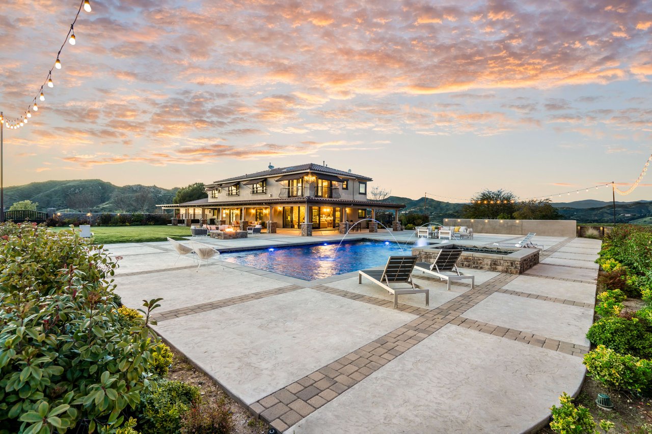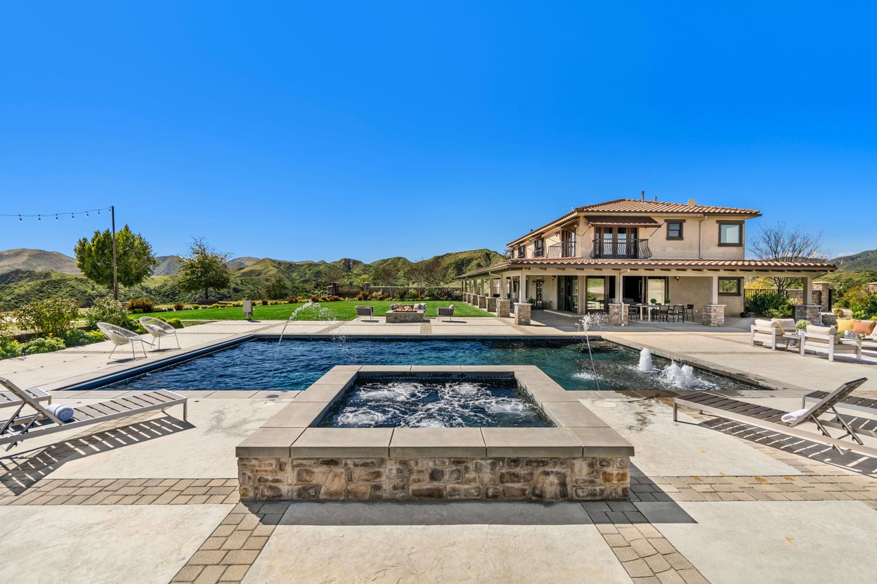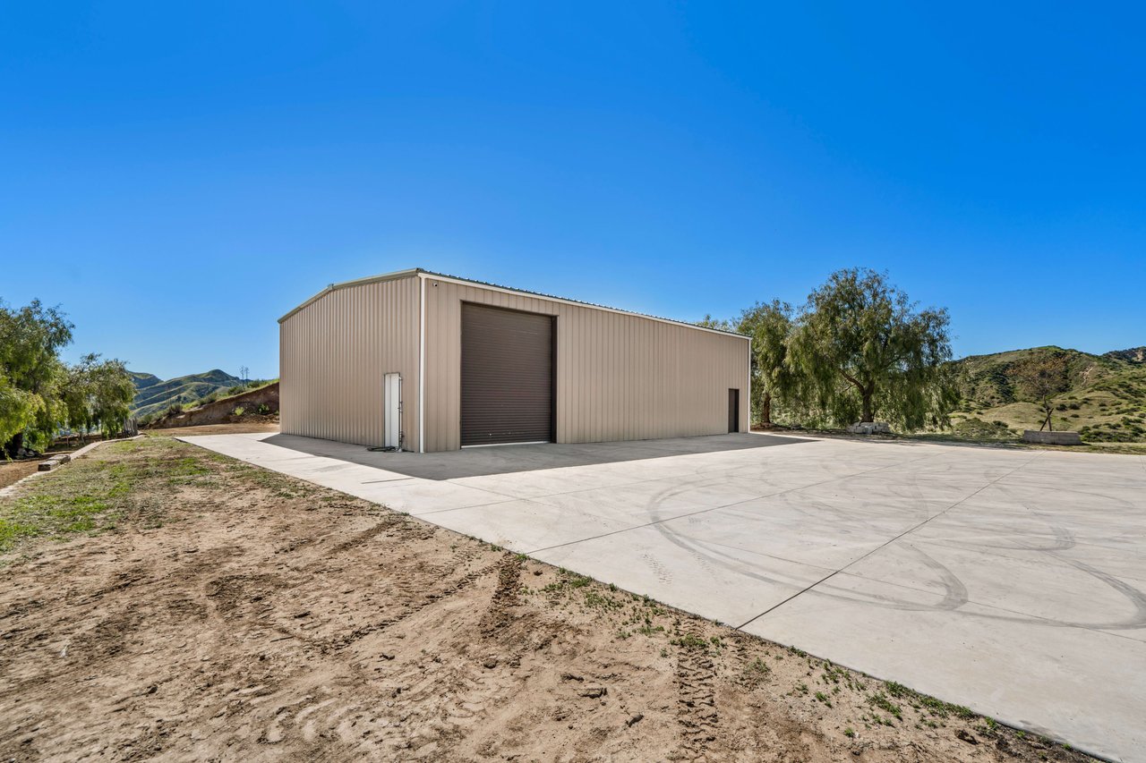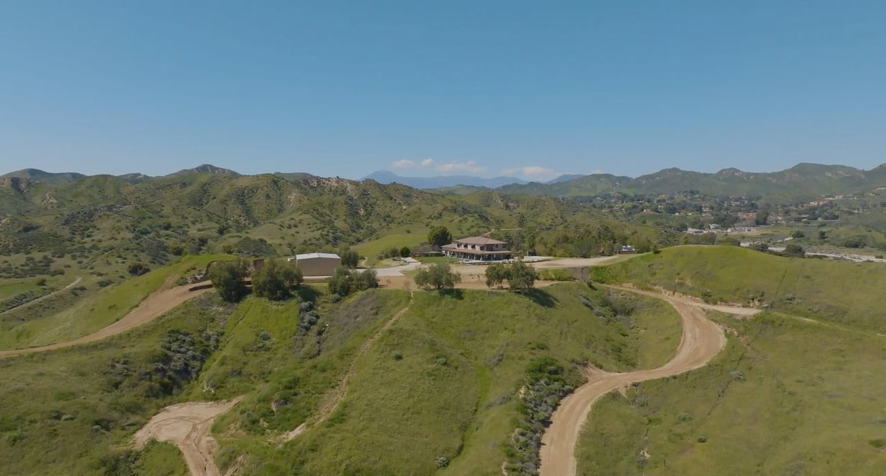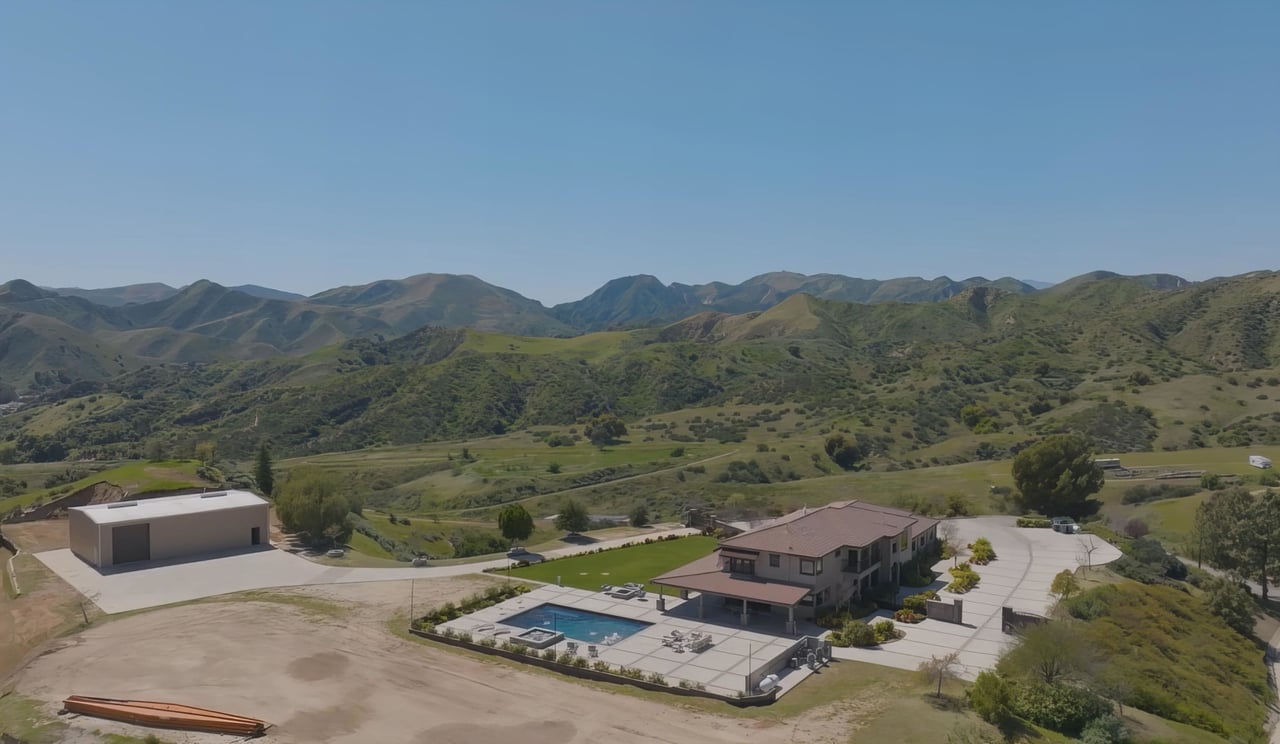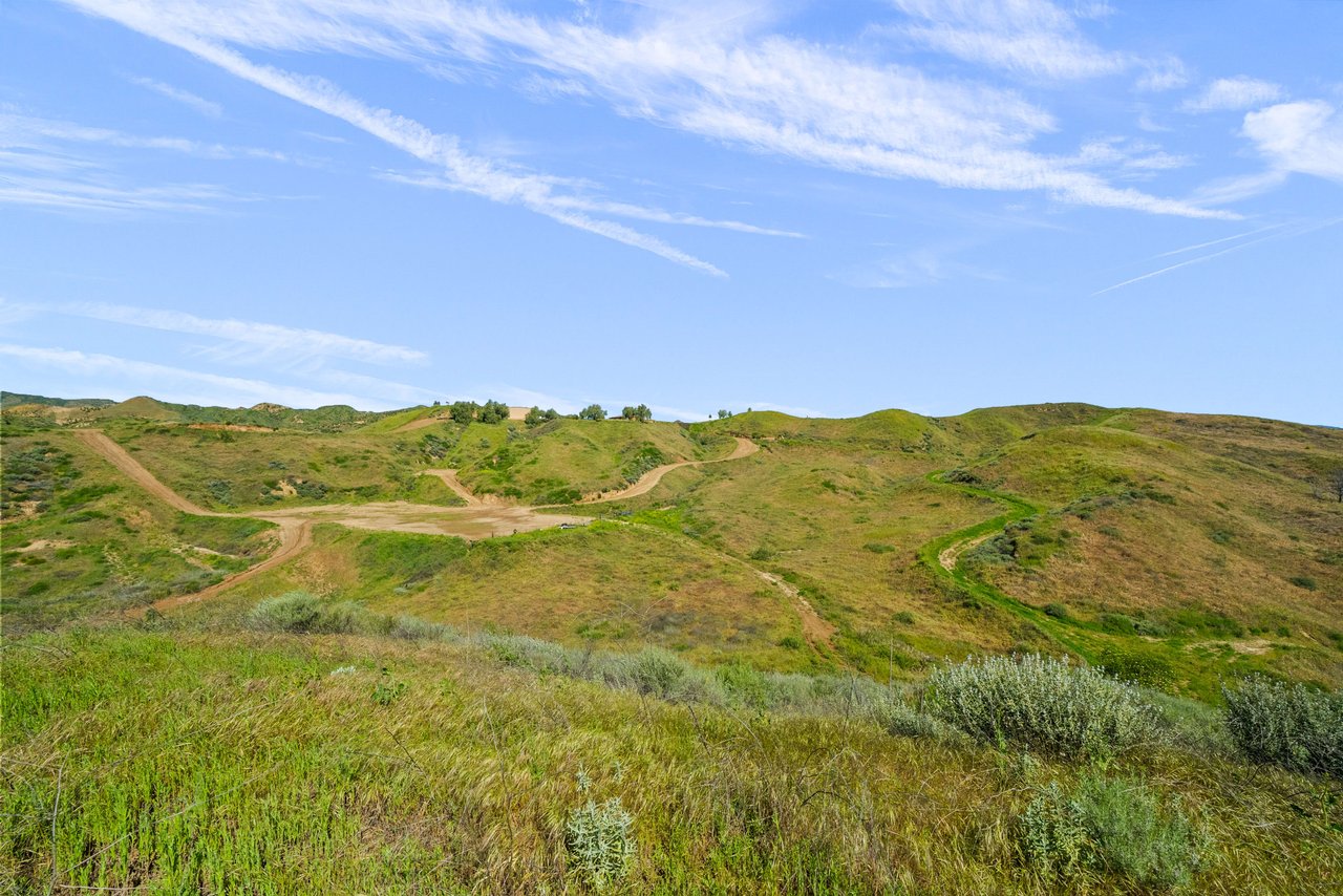 Rare opportunity to own 22-acre ridgetop luxury residence. A pristine 5-bedroom, 5-bath, + office home is positioned on a 3.5-acre pad, combining residential luxury with the spirit of adventurous living. Located atop a private road, this flag-lot estate offers tranquility and panoramic views. Private, double-gated entry. The estate includes 3-car finished garage w/laundry room, separate 2400 sf workshop with space for RVs, boats, motorcycles; motocross rally track; secluded location has been used for feature films and Emmy award-winning tv shows. Grand foyer, arched stone hallway leads to the family room, with panoramic views, fireside living space. Oversized sliding glass doors seamlessly integrate indoors/outdoors, open to patio dining, entertaining space. Rich mahogany windows and doors throughout. Chef s kitchen provides ultra-premium Wolf and Sub-Zero appliances, custom cabinetry, walk-in pantry. Huge main floor primary suite featuring walk-in closets, luxury bathroom with Italian Noce tile, and French doors that lead out to the patio. Also on the main floor: stylish office with custom built-ins, French doors to the wrap-around patio. Majestic staircase ascends to the 2nd floor mezzanine. 700+ sf loft area w/built-in cabinetry provides ample room for a media room, library, +/or home gym. Primary suite is replete with lavish bathroom, whirlpool bath, separate glassed-in double shower, walk-in closets, W/D, and French doors to dual balconies, overlooking sunsets, pool, and city lights. Three additional upstairs bedrooms and 2 baths provide privacy, comfort. Outdoors, a sparkling saltwater pool awaits, built-in fire pit, and 1200+ sf covered patio. An idyllic retreat for relaxation or entertaining. Located in LA County entertainment industry location zone, minutes to Santa Clarita s town center or Castaic Lake, half-hour to Ventura beach. Freeway access to Los Angeles. Abutting 42-acre parcel available for purchase separately, which could bring the total acreage 60+ acres.