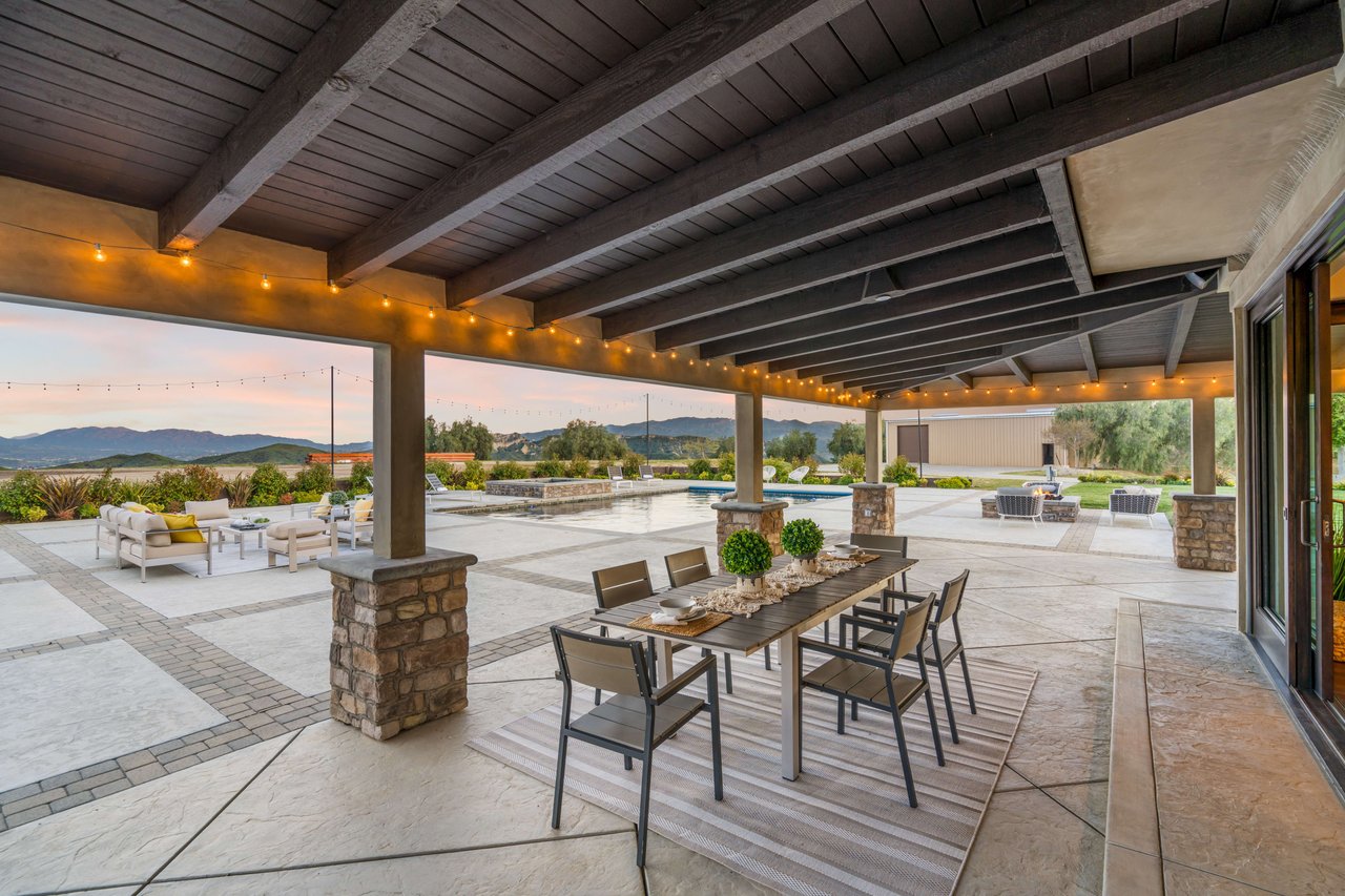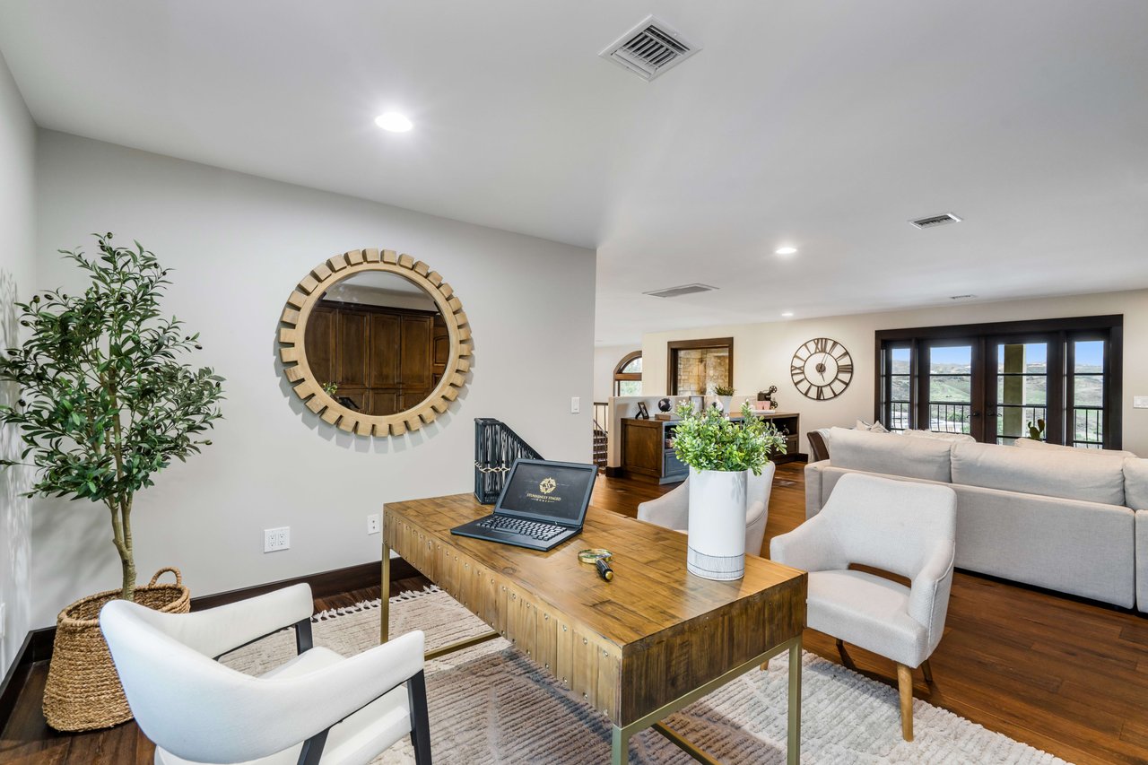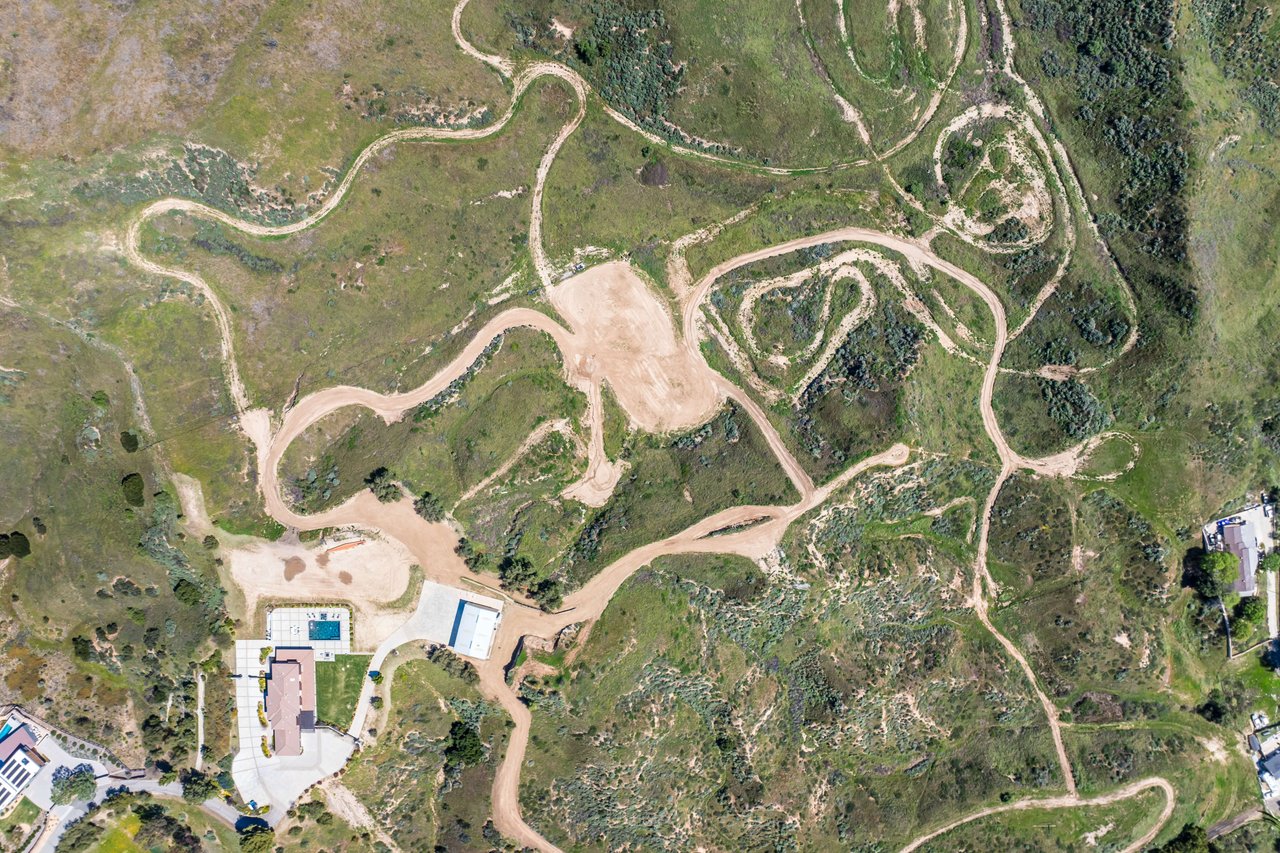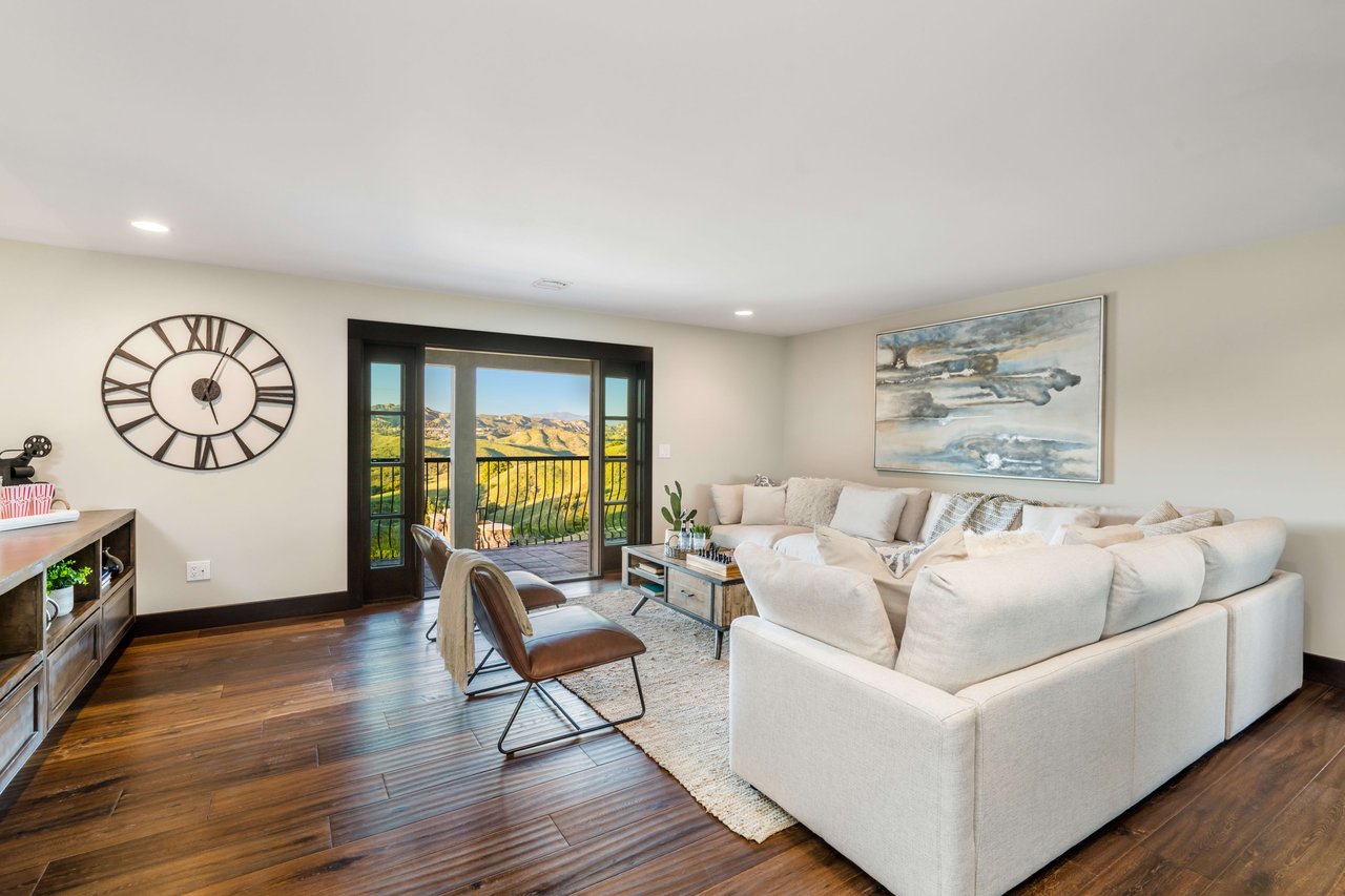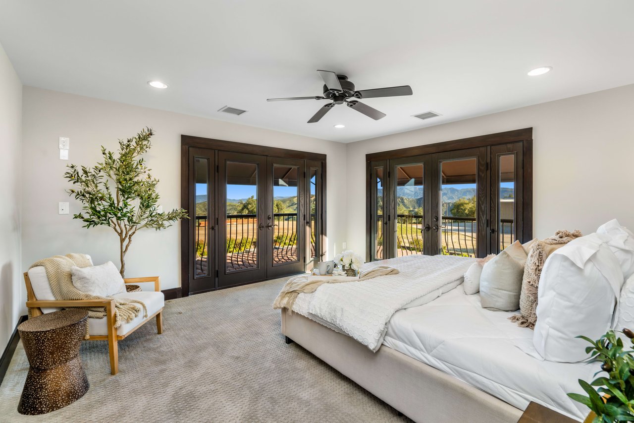 Rare opportunity to own 22-acre ridgetop luxury residence. A pristine 5-bedroom, 5-bath, + office home is positioned on a 3.5-acre pad, combining residential luxury with the spirit of adventurous living. Located atop a private road, this flag-lot estate offers tranquility and panoramic views. Private, double-gated entry. The estate includes 3-car finished garage w/laundry room, separate 2400 sf workshop with space for RVs, boats, motorcycles; motocross rally track; secluded location has been used for feature films and Emmy award-winning tv shows. Grand foyer, arched stone hallway leads to the family room, with panoramic views, fireside living space. Oversized sliding glass doors seamlessly integrate indoors/outdoors, open to patio dining, entertaining space. Rich mahogany windows and doors throughout. Chef s kitchen provides ultra-premium Wolf and Sub-Zero appliances, custom cabinetry, walk-in pantry. Huge main floor primary suite featuring walk-in closets, luxury bathroom with Italian Noce tile, and French doors that lead out to the patio. Also on the main floor: stylish office with custom built-ins, French doors to the wrap-around patio. Majestic staircase ascends to the 2nd floor mezzanine. 700+ sf loft area w/built-in cabinetry provides ample room for a media room, library, +/or home gym. Primary suite is replete with lavish bathroom, whirlpool bath, separate glassed-in double shower, walk-in closets, W/D, and French doors to dual balconies, overlooking sunsets, pool, and city lights. Three additional upstairs bedrooms and 2 baths provide privacy, comfort. Outdoors, a sparkling saltwater pool awaits, built-in fire pit, and 1200+ sf covered patio. An idyllic retreat for relaxation or entertaining. Located in LA County entertainment industry location zone, minutes to Santa Clarita s town center or Castaic Lake, half-hour to Ventura beach. Freeway access to Los Angeles. Abutting 42-acre parcel available for purchase separately, which could bring the total acreage 60+ acres.