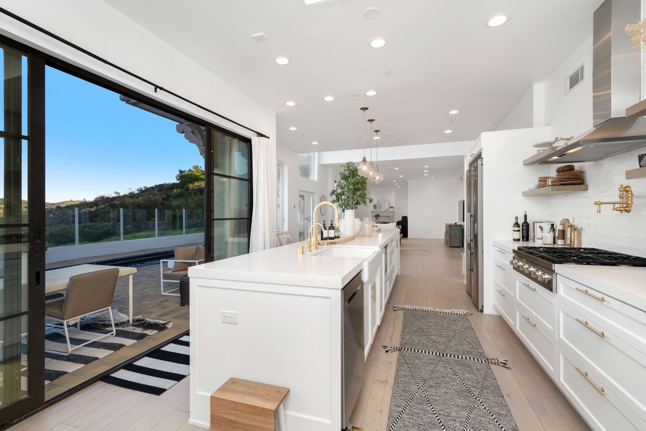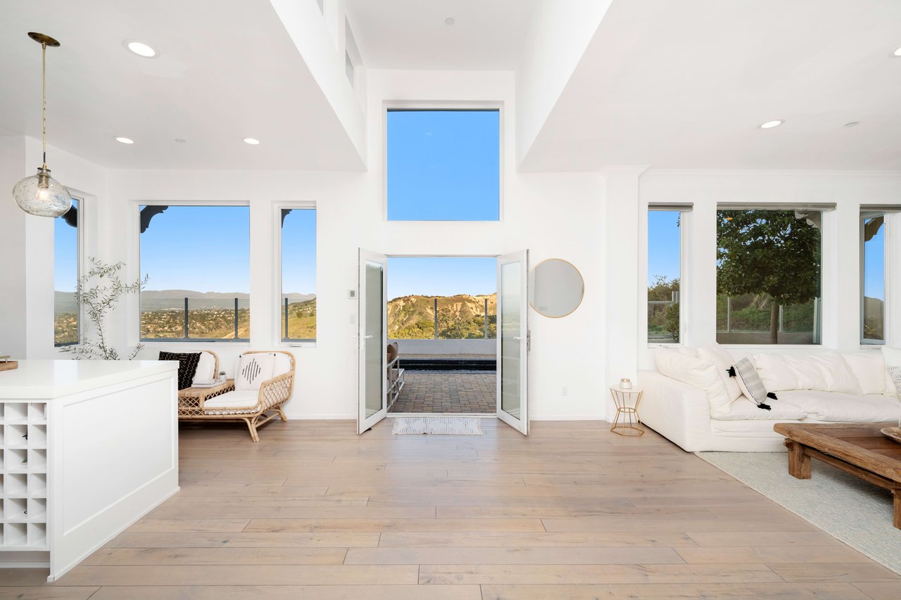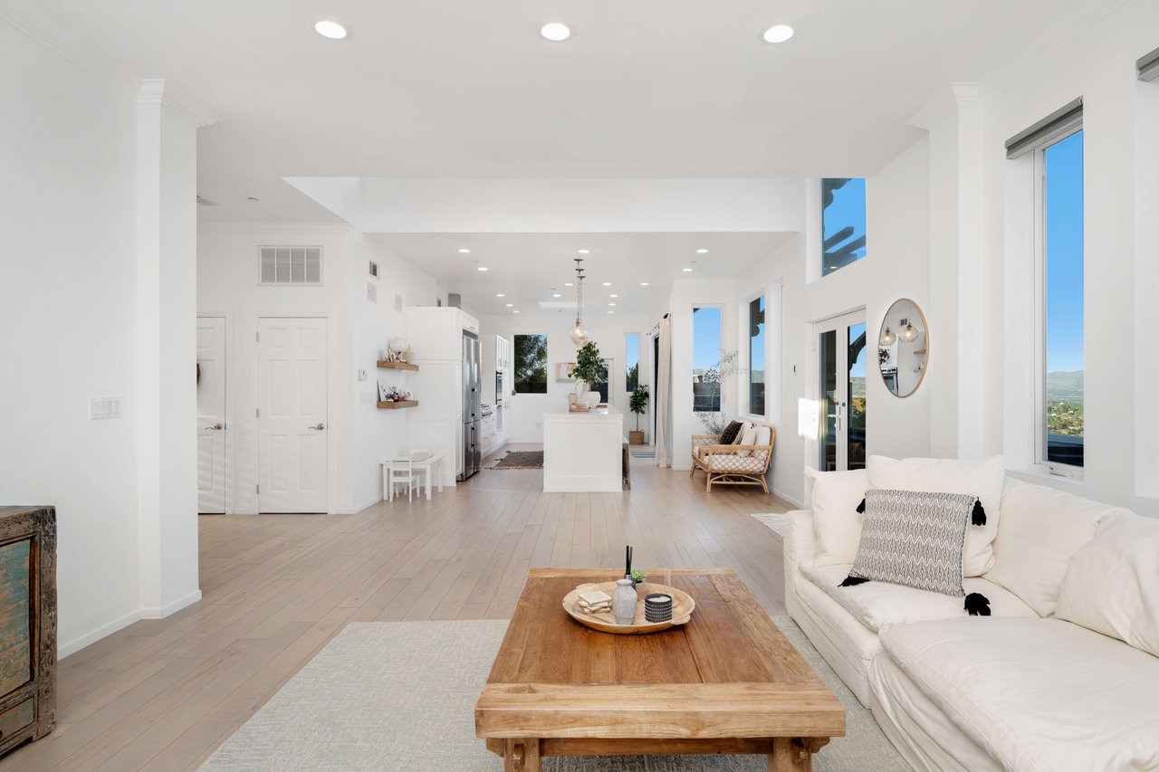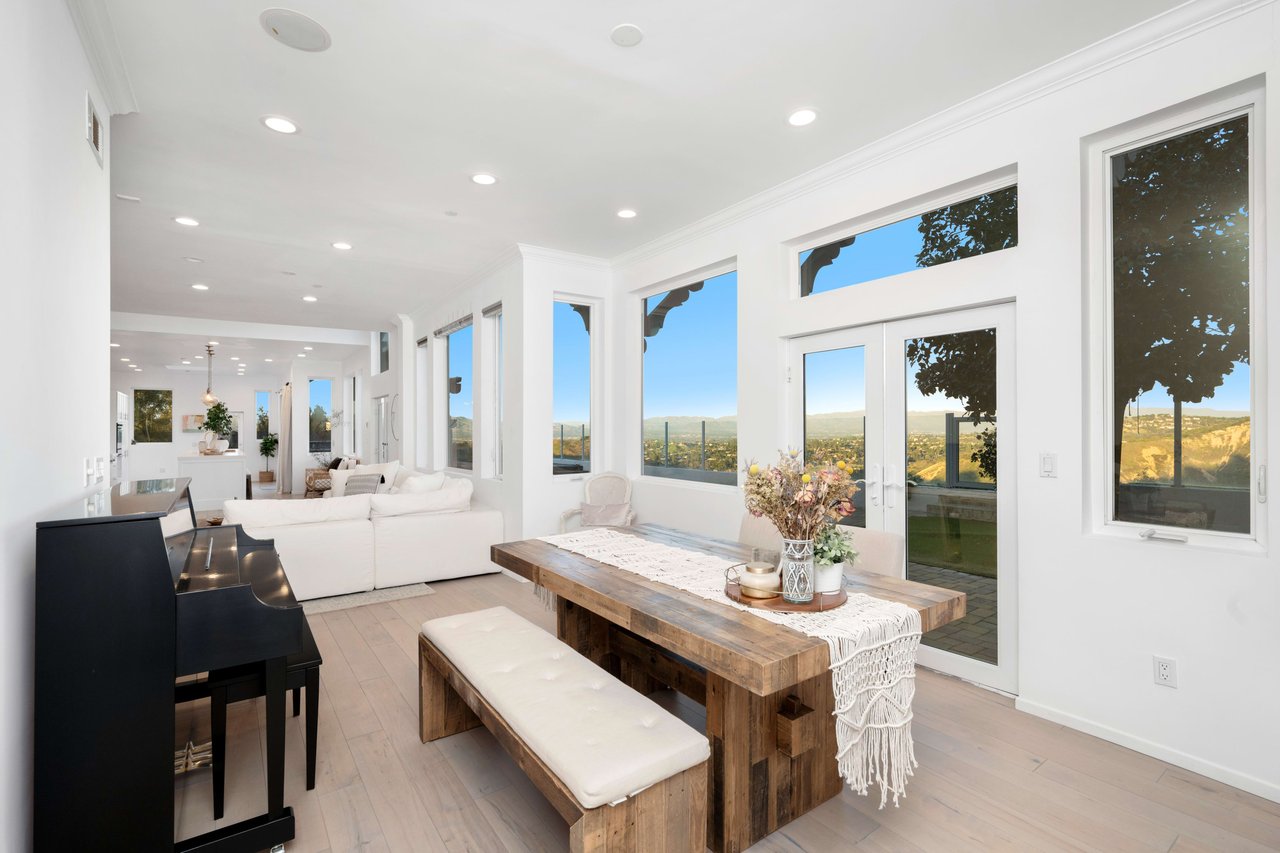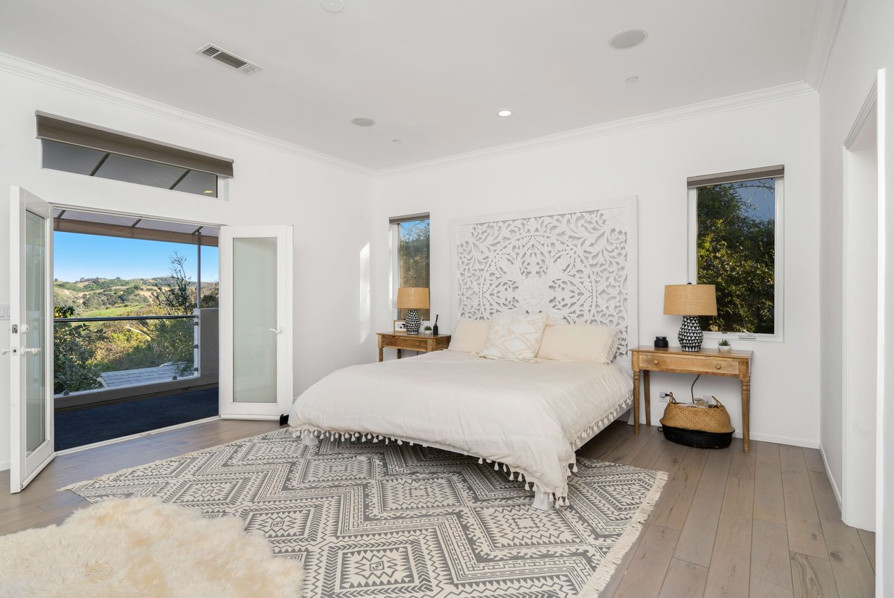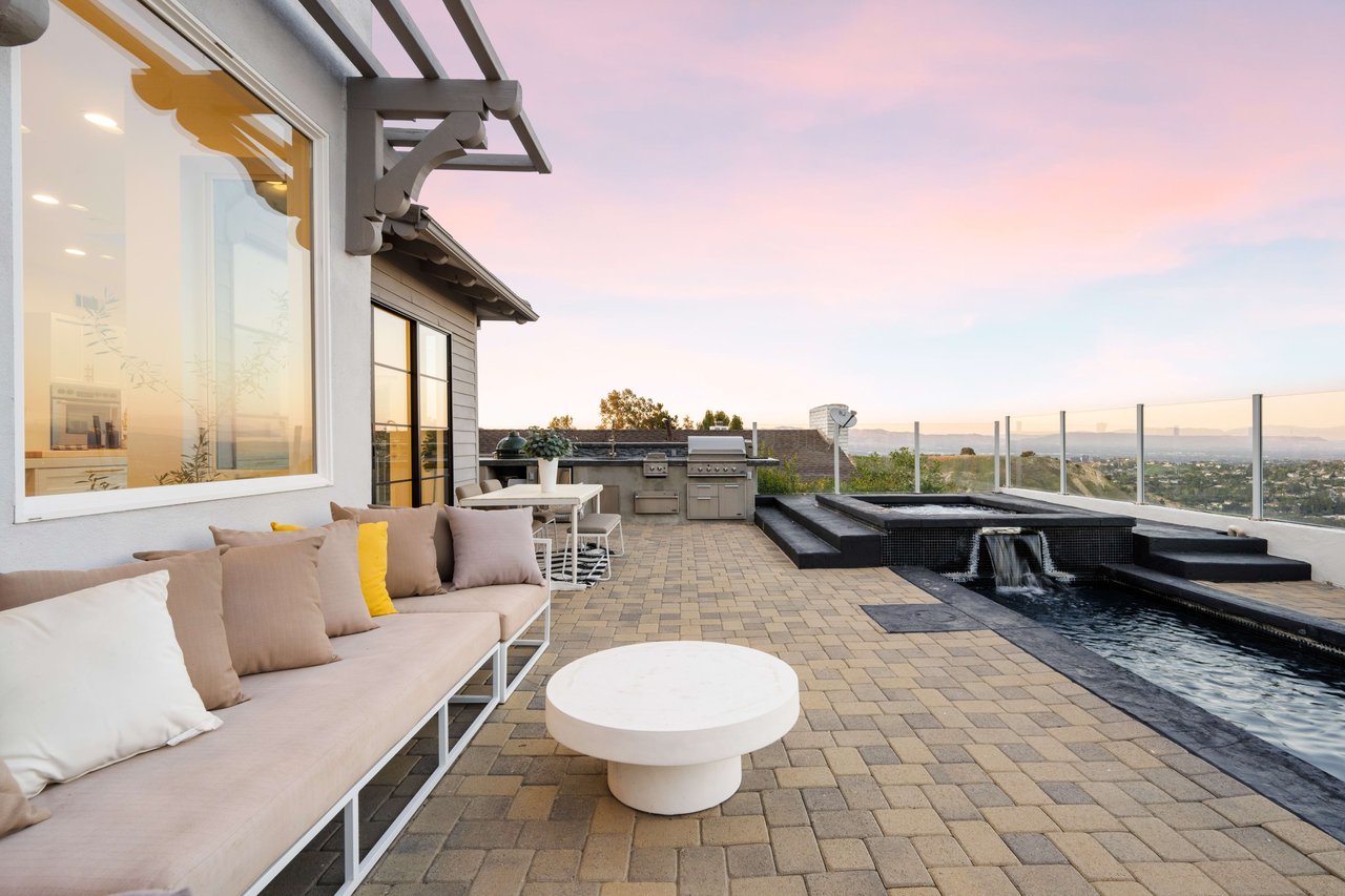 Captivating canyon and city light views. Sited within the bucolic community this Calabasas Highlands home is tastefully appointed with high ceiling and wood floors throughout.The generous open concept living area is bathed in natural light and boasts a comfortable contemporary design. The Chef's gourmet kitchen, complete with top of the line professional appliances offers direct access to the spacious great room and dining nook with a warming fireplace. The second level is dedicated to the luxurious primary suite with a generous walk-in closet, spa-like bath, two viewing balconies and a private retreat, office or sleeping area. The main floor is complete with two en-suite bedrooms and a guest bath. The rear yard reveals a lap pool, spa, BBQ center and expansive viewing deck perfect for family and guest alfresco dining and star gazing. Additional features include a generous bonus room above the garage, putting green, dog run and multiple fruit trees.