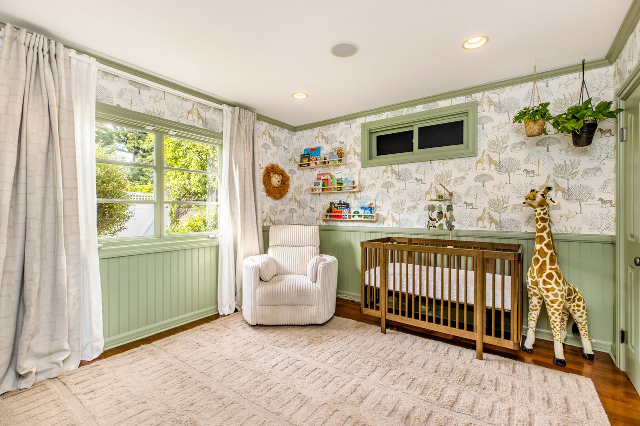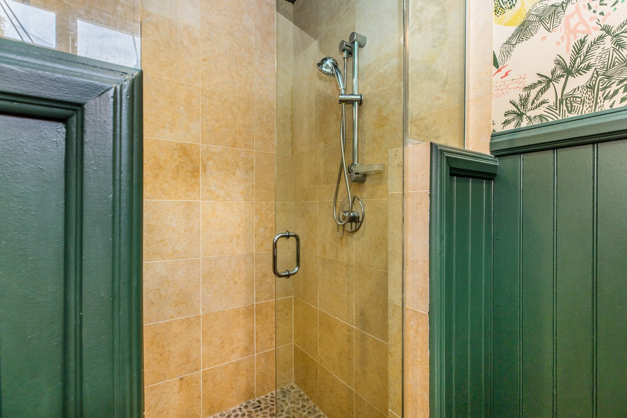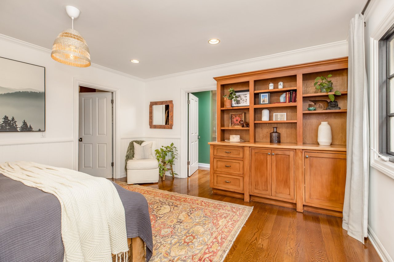 The guest suite feels like its own private haven, with a pocket door creating separation from the main living area. A mini foyer with built-in storage leads to a beautifully tiled bath with a luxurious shower, and the bedroom overlooks the gardens and fruit trees. A custom built-in desk and shelving make this space equally ideal for guests or remote work.