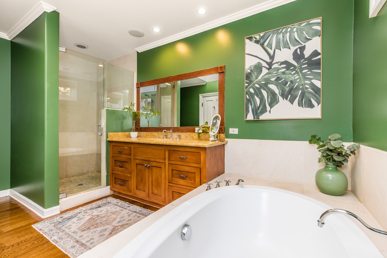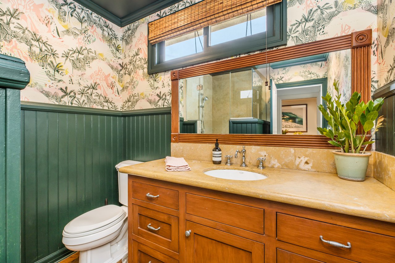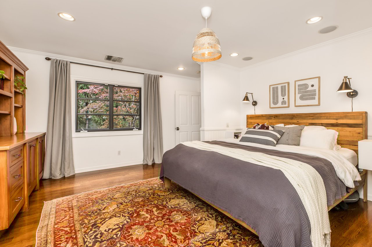 The primary suite is a tranquil retreat featuring a cozy sitting nook and a large single-pane picture window framing the lush greenery and a graceful Japanese maple. The inviting bed alcove enhances the feeling of serenity, while the spa-inspired bathroom offers a deep soaking tub, separate shower with river rock flooring, and a spacious custom walk-in closet with laundry discreetly tucked inside. A second skylight in the primary bathroom brings in soft, natural light to complete the spa experience.