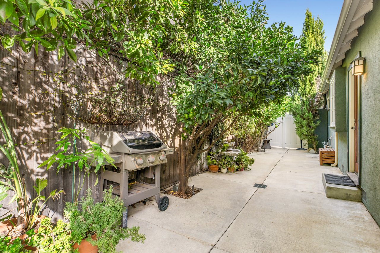 From the light-filled living room, French doors open to a private stone patio — the heart of the outdoor sanctuary. Dine al fresco beneath the stars or relax to the soothing sound of three serene fountains scattered among winding stone pathways. The grounds are framed by towering ficus hedges and romantic flowering vines, creating a secluded, storybook atmosphere. Mature lime, lemon, and mandarin trees provide color, fragrance, and a touch of orchard charm year-round.