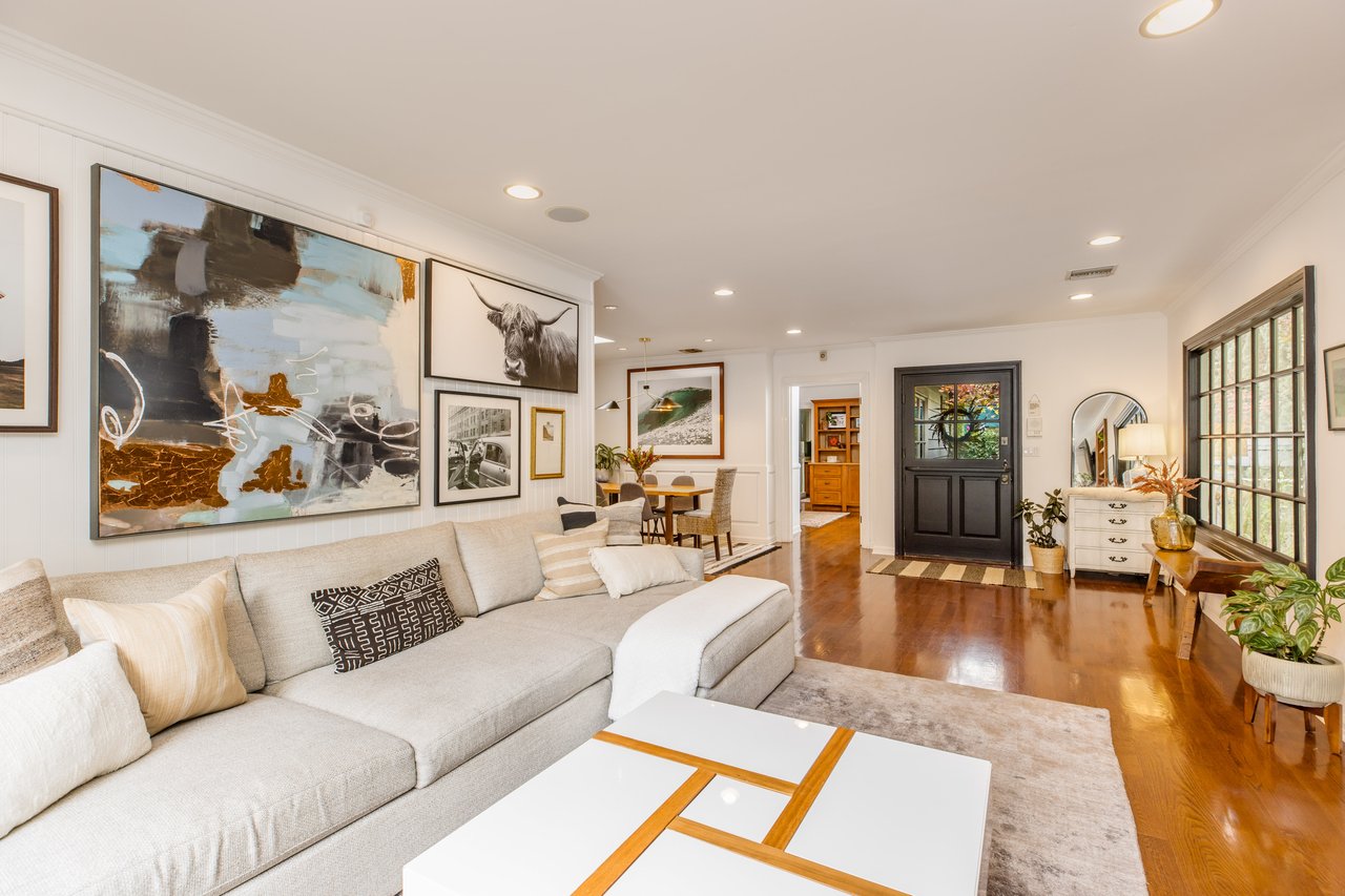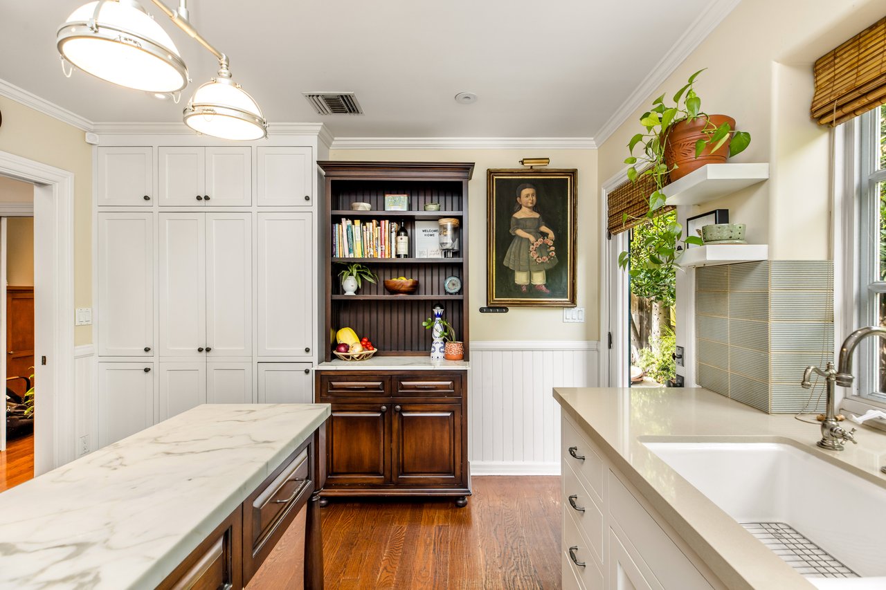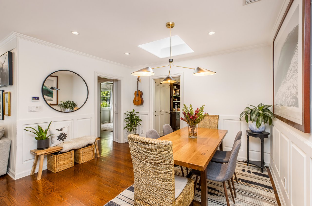 Inside, sunlit rooms flow effortlessly across stunning hardwood floors, anchored by a massive picture window and charming stone fireplace. Custom built-ins create endless function, storage and charm in every space while the in ceiling surround sound system helps to create atmosphere throughout the entire home, bathrooms included. The thoughtfully designed chef’s kitchen is both elegant and functional, boasting new high-end appliances, a walk-in pantry with a powered appliance bar, generous countertop outlets, and a hidden ice maker behind custom paneling. Designer tile, upscale fixtures, and warm lighting add layers of sophistication. A skylight over the dining area fills the home with natural light, enhancing the open, airy feel.