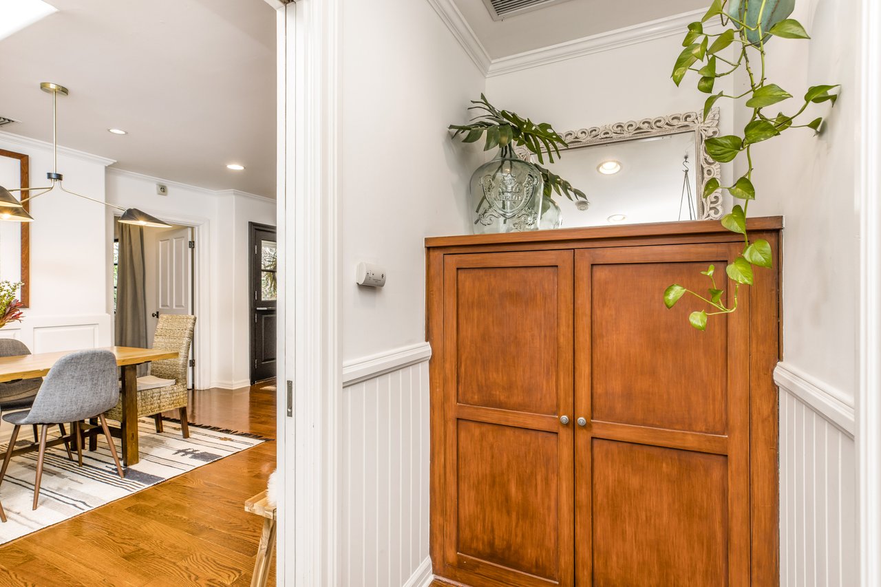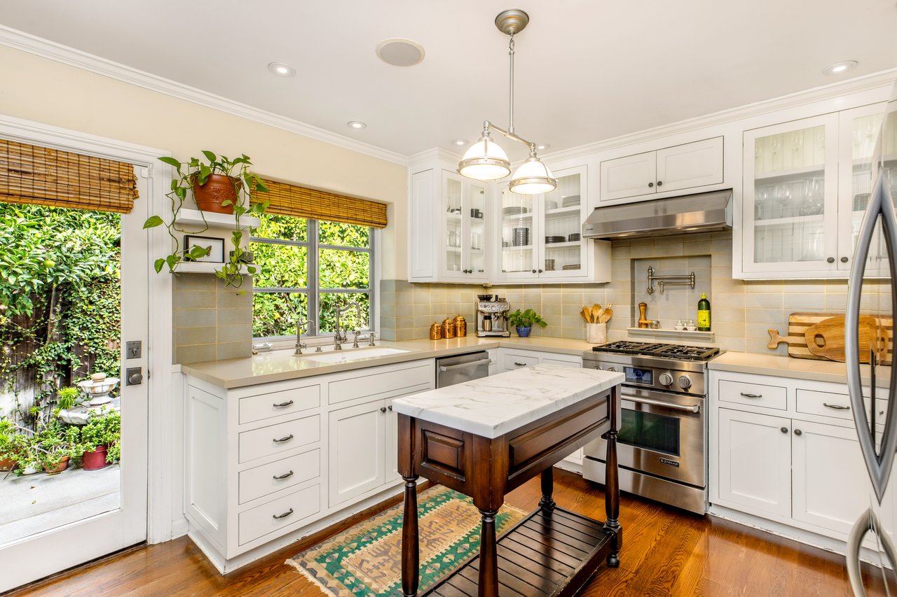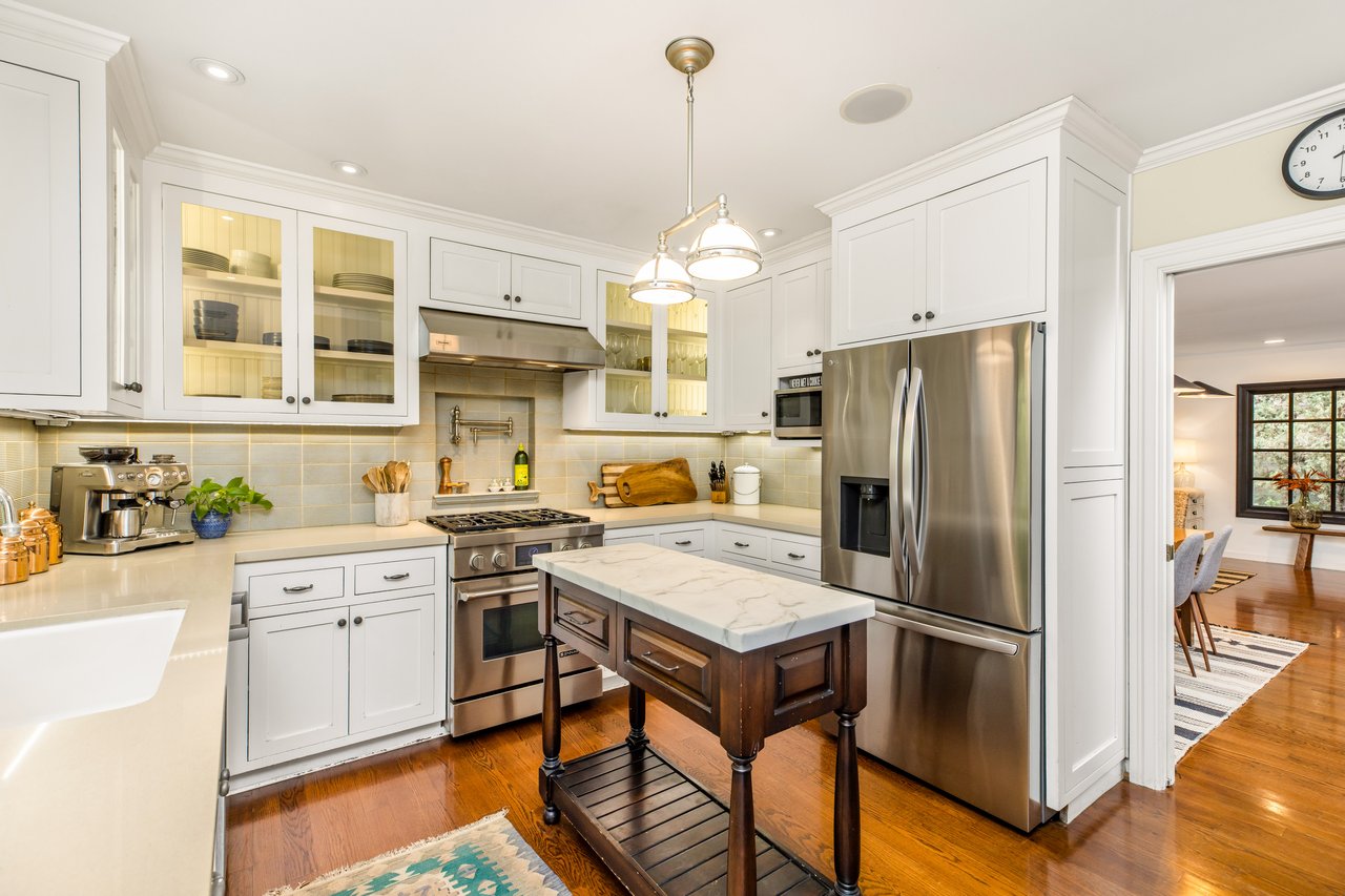 Inside, sunlit rooms flow effortlessly across stunning hardwood floors, anchored by a massive picture window and charming stone fireplace. Custom built-ins create endless function, storage and charm in every space while the in ceiling surround sound system helps to create atmosphere throughout the entire home, bathrooms included. The thoughtfully designed chef’s kitchen is both elegant and functional, boasting new high-end appliances, a walk-in pantry with a powered appliance bar, generous countertop outlets, and a hidden ice maker behind custom paneling. Designer tile, upscale fixtures, and warm lighting add layers of sophistication. A skylight over the dining area fills the home with natural light, enhancing the open, airy feel.