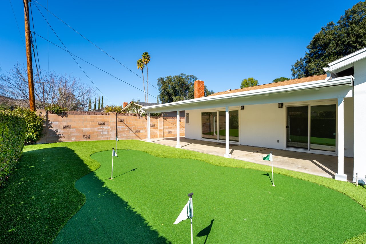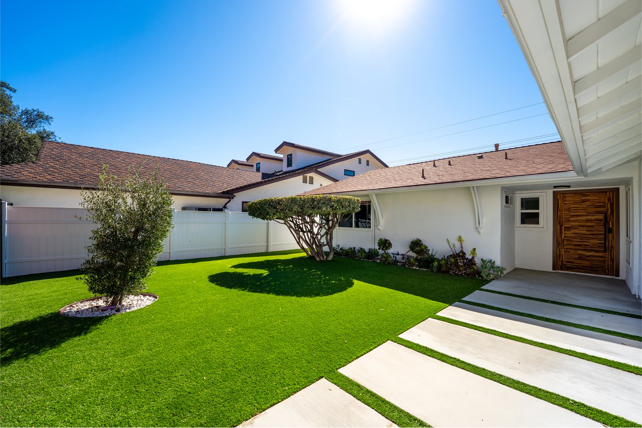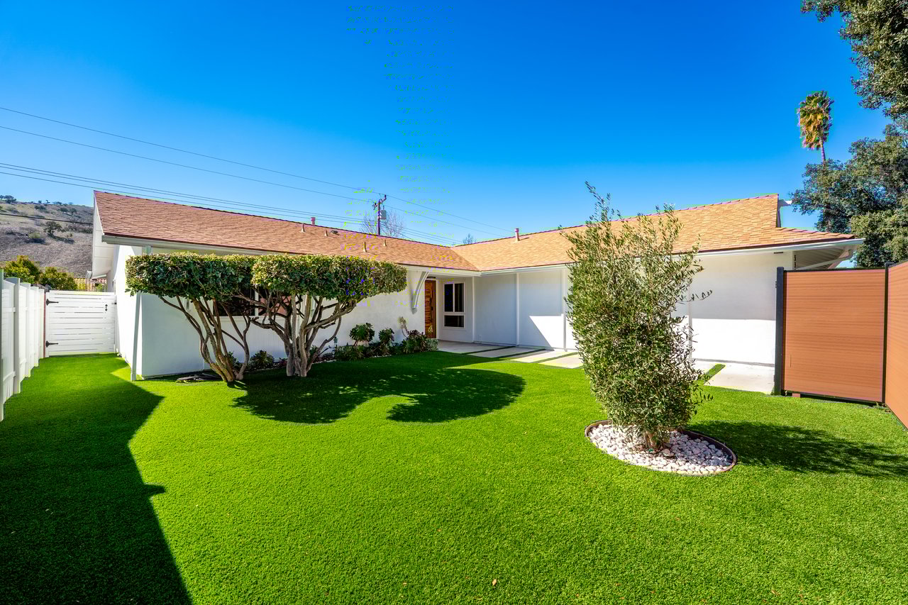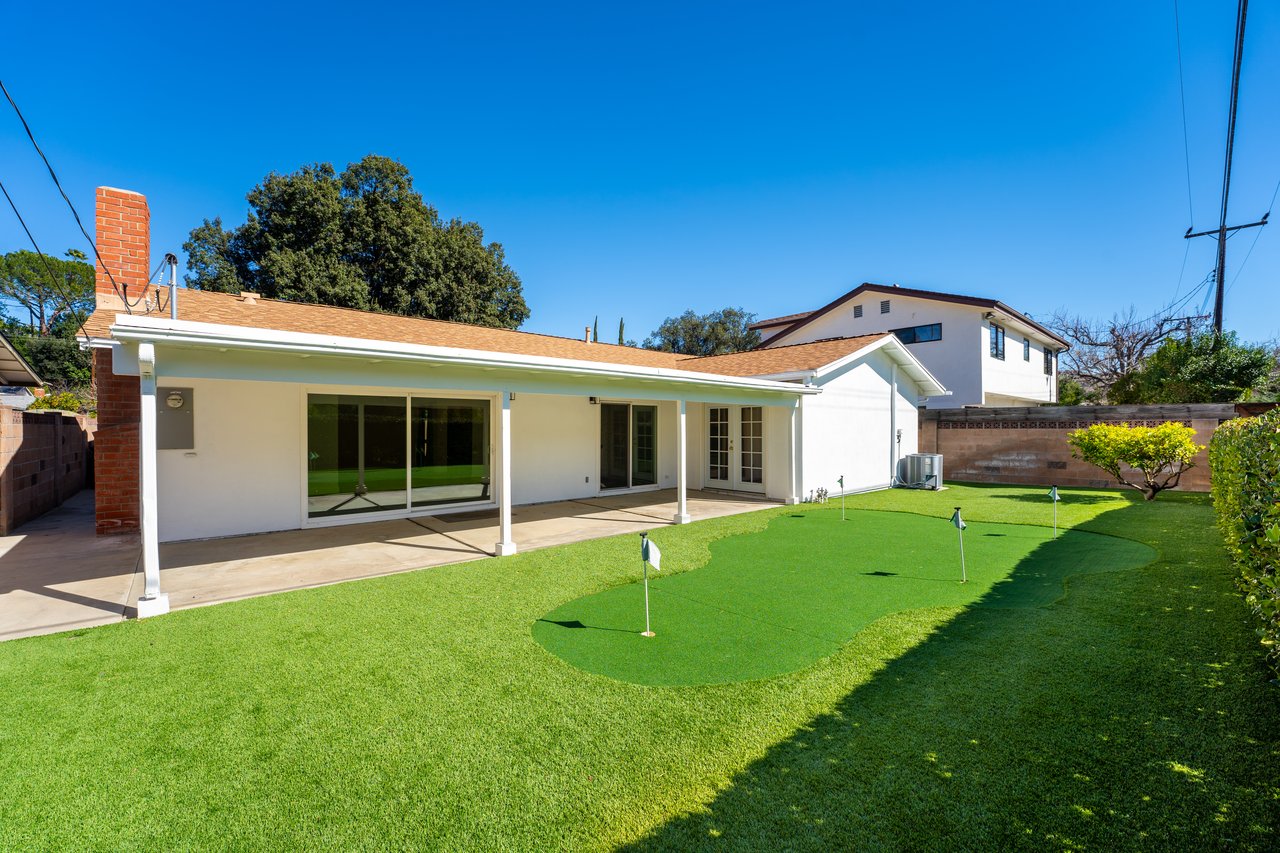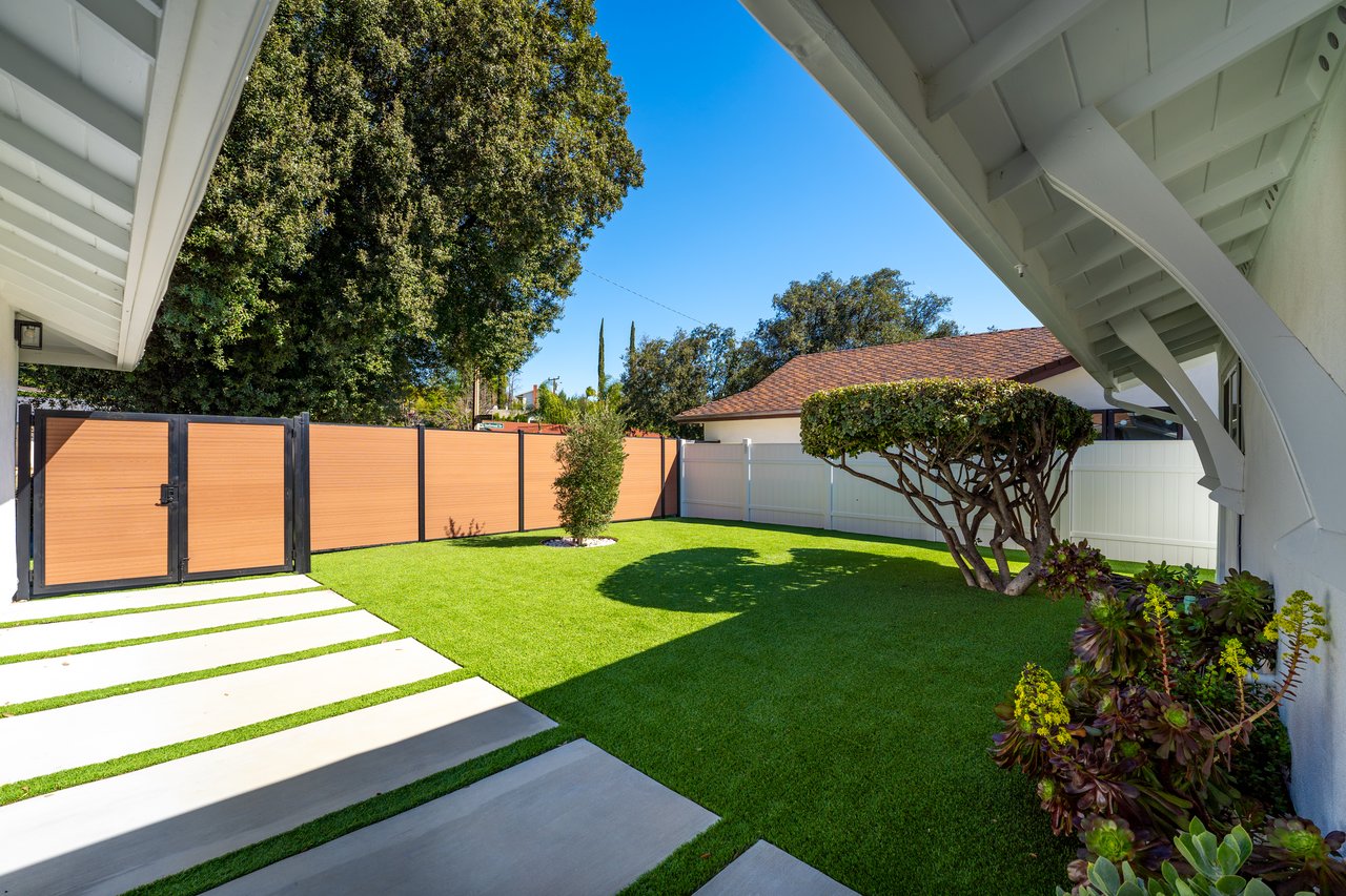 Modern elegance meets thoughtful design in this beautifully updated 4-bedroom, 3-bathroom home. Featuring recessed lighting, double-paned windows and sliders, and stylish wood-like flooring throughout, this home offers a bright and contemporary atmosphere. The front and back yards are wrapped in low-maintenance artificial turf, complementing the brick-inlaid driveway and sleek concrete pavers for impressive curb appeal. Step through the custom artistic wood front door with a modern black keypad lock into a light-filled interior. The open layout flows effortlessly from the dining room to the spacious living room, where a sleek modern fireplace creates a cozy ambiance. The contemporary kitchen showcases white shaker cabinets, quartz countertops, and stainless-steel appliances. Designed for seamless indoor-outdoor living, the covered patio extends the entertainment space while providing shade. The backyard is a true retreat, complete with a putting green and a lower-level area brimming with potential, surrounded by sun-dappled trees. The bathrooms continue the modern aesthetic with black accents, quartz countertops, and LED-lit mirrors are perfect for makeup application. Two bathrooms feature walk-in showers with rain shower heads, handheld sprayers, and sleek, full-length shampoo ledges, while the third offers a shower/tub combo with a handheld shower head. A gleaming white laundry room with washer and dryer hookups is conveniently located off the large 2-car garage, which provides ample storage space. This home is a perfect blend of style, comfort, and functionality don't miss the opportunity to make it yours.