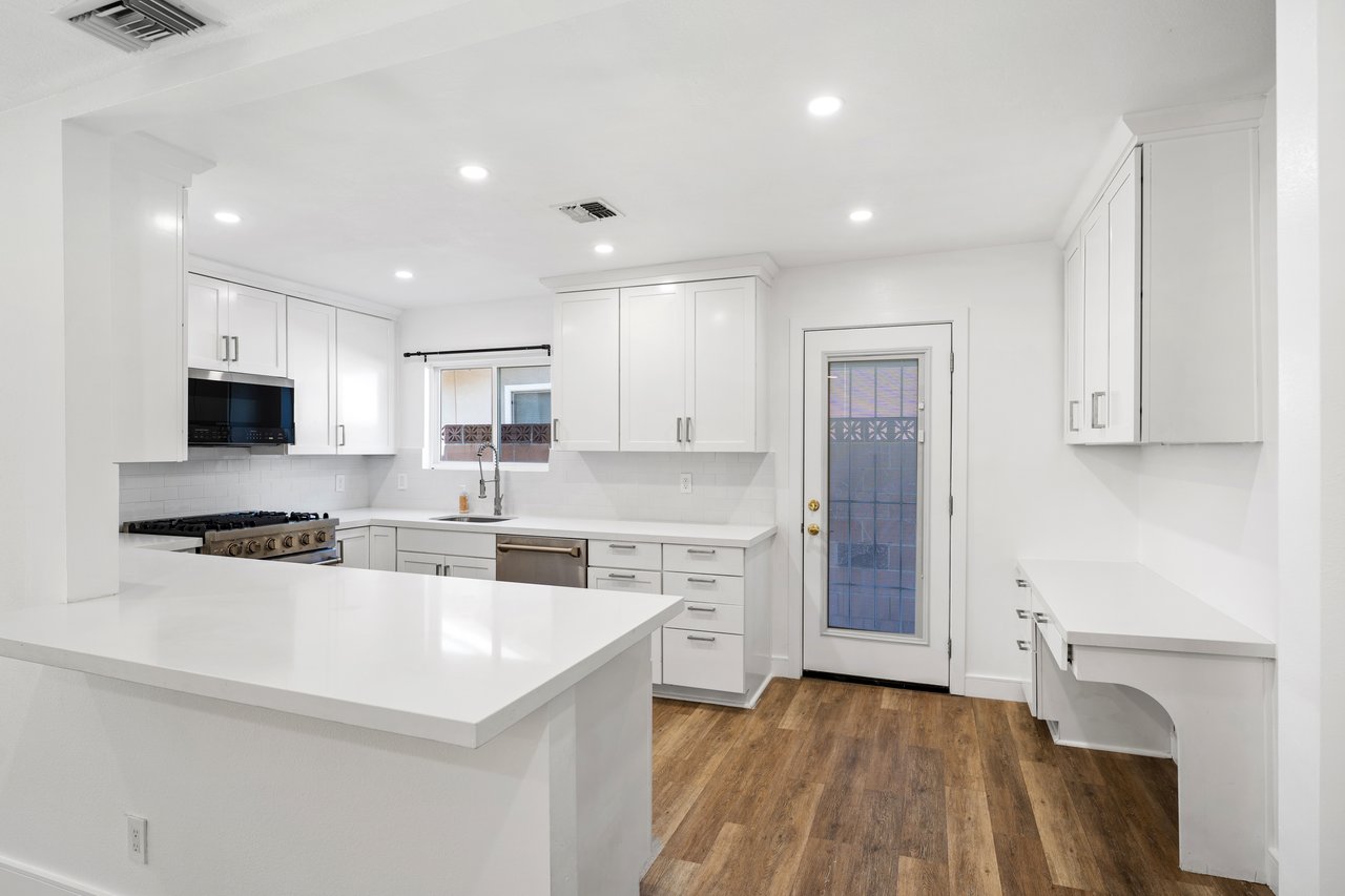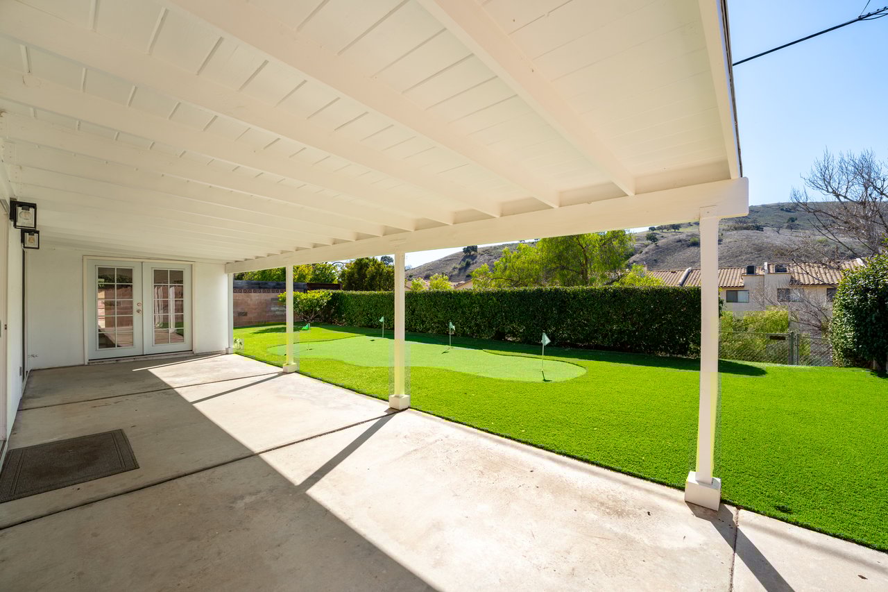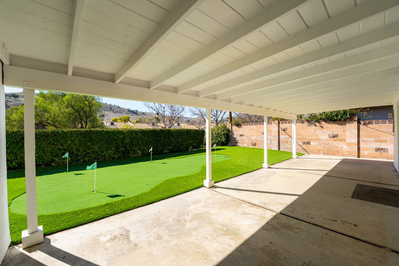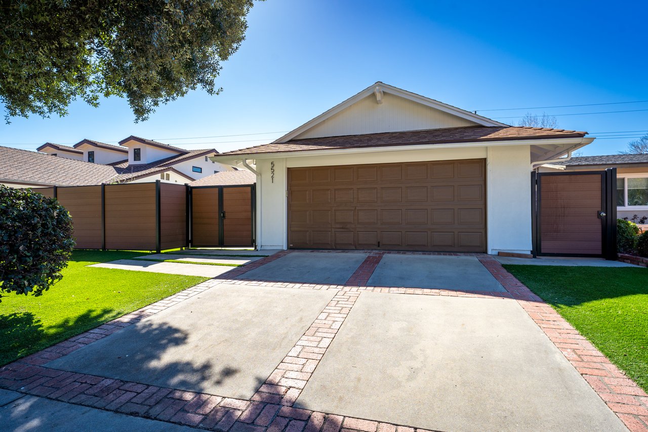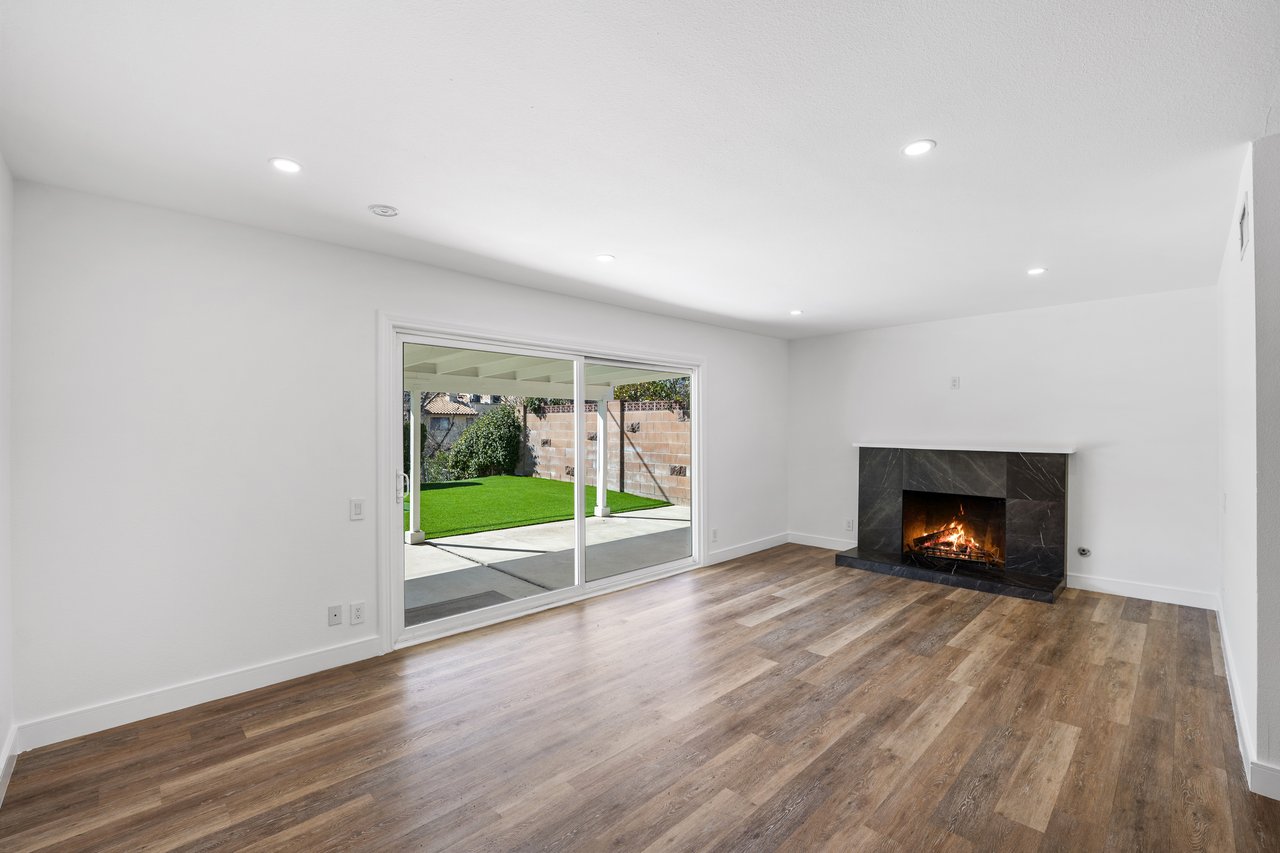 Modern elegance meets thoughtful design in this beautifully updated 4-bedroom, 3-bathroom home. Featuring recessed lighting, double-paned windows and sliders, and stylish wood-like flooring throughout, this home offers a bright and contemporary atmosphere. The front and back yards are wrapped in low-maintenance artificial turf, complementing the brick-inlaid driveway and sleek concrete pavers for impressive curb appeal. Step through the custom artistic wood front door with a modern black keypad lock into a light-filled interior. The open layout flows effortlessly from the dining room to the spacious living room, where a sleek modern fireplace creates a cozy ambiance. The contemporary kitchen showcases white shaker cabinets, quartz countertops, and stainless-steel appliances. Designed for seamless indoor-outdoor living, the covered patio extends the entertainment space while providing shade. The backyard is a true retreat, complete with a putting green and a lower-level area brimming with potential, surrounded by sun-dappled trees. The bathrooms continue the modern aesthetic with black accents, quartz countertops, and LED-lit mirrors are perfect for makeup application. Two bathrooms feature walk-in showers with rain shower heads, handheld sprayers, and sleek, full-length shampoo ledges, while the third offers a shower/tub combo with a handheld shower head. A gleaming white laundry room with washer and dryer hookups is conveniently located off the large 2-car garage, which provides ample storage space. This home is a perfect blend of style, comfort, and functionality don't miss the opportunity to make it yours.