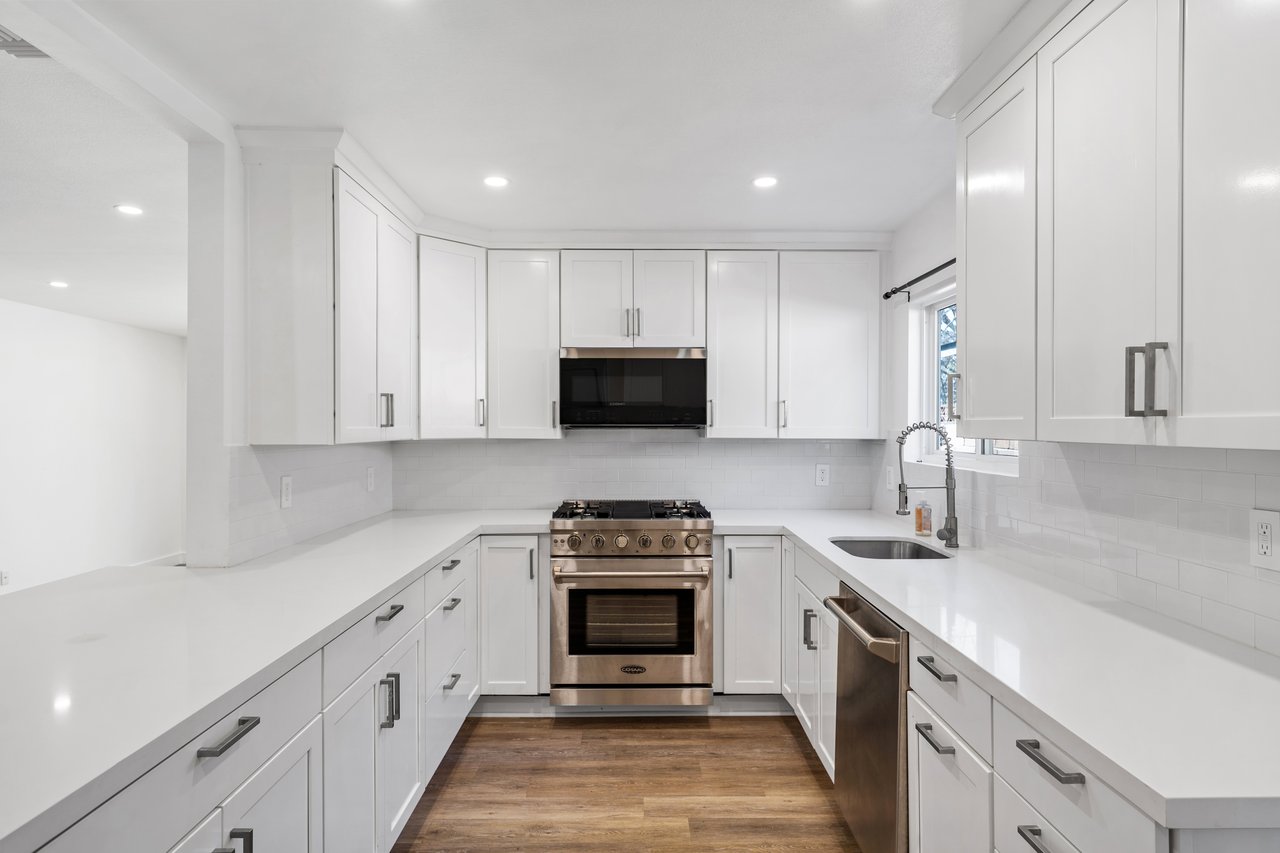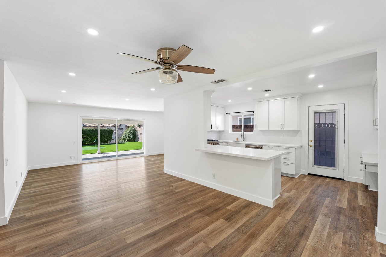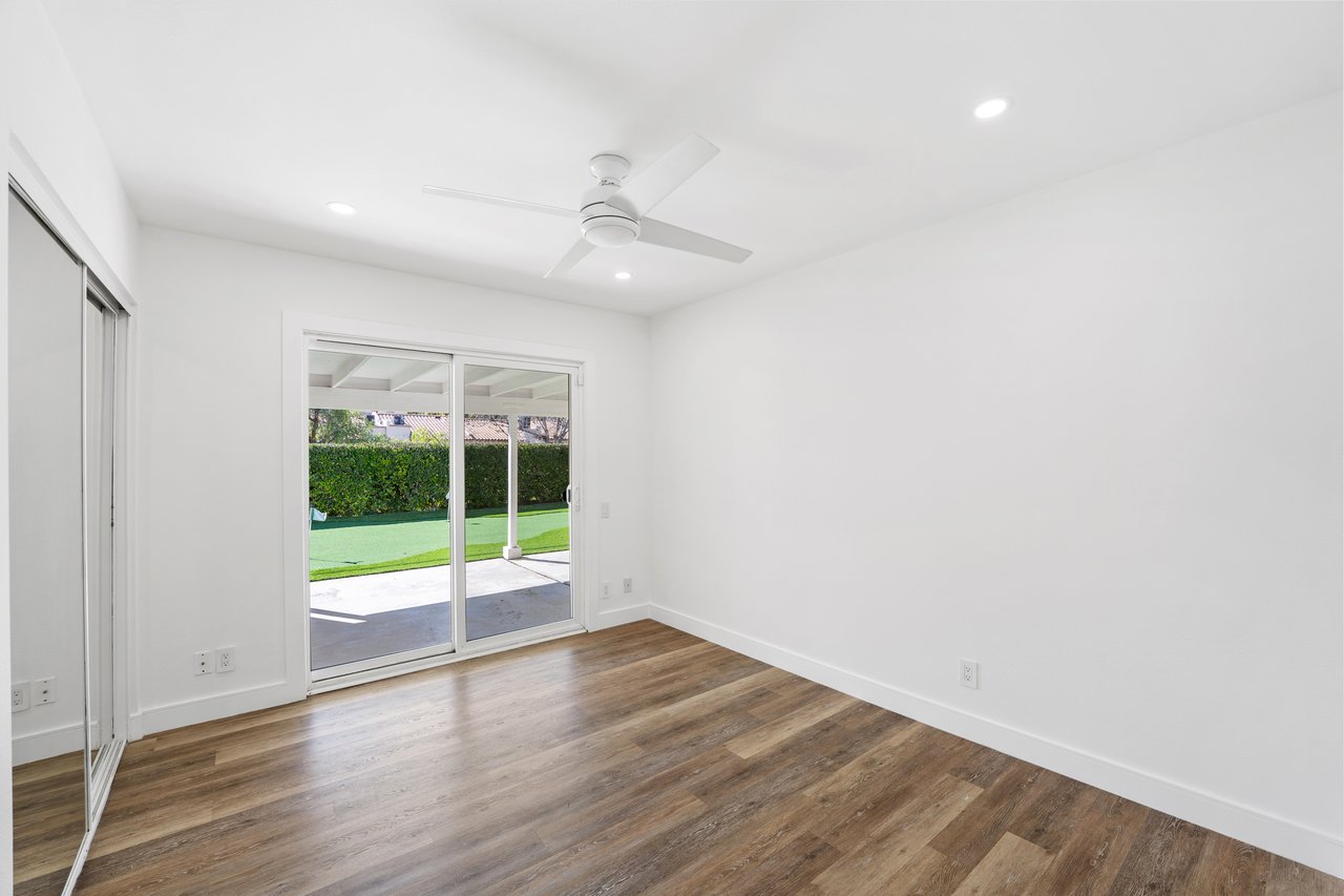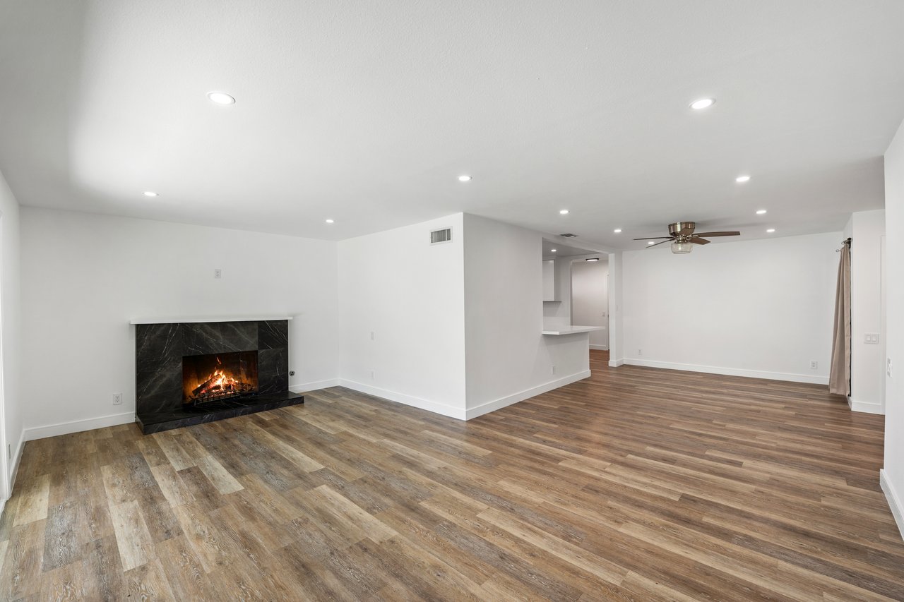 Modern elegance meets thoughtful design in this beautifully updated 4-bedroom, 3-bathroom home. Featuring recessed lighting, double-paned windows and sliders, and stylish wood-like flooring throughout, this home offers a bright and contemporary atmosphere. The front and back yards are wrapped in low-maintenance artificial turf, complementing the brick-inlaid driveway and sleek concrete pavers for impressive curb appeal. Step through the custom artistic wood front door with a modern black keypad lock into a light-filled interior. The open layout flows effortlessly from the dining room to the spacious living room, where a sleek modern fireplace creates a cozy ambiance. The contemporary kitchen showcases white shaker cabinets, quartz countertops, and stainless-steel appliances. Designed for seamless indoor-outdoor living, the covered patio extends the entertainment space while providing shade. The backyard is a true retreat, complete with a putting green and a lower-level area brimming with potential, surrounded by sun-dappled trees. The bathrooms continue the modern aesthetic with black accents, quartz countertops, and LED-lit mirrors are perfect for makeup application. Two bathrooms feature walk-in showers with rain shower heads, handheld sprayers, and sleek, full-length shampoo ledges, while the third offers a shower/tub combo with a handheld shower head. A gleaming white laundry room with washer and dryer hookups is conveniently located off the large 2-car garage, which provides ample storage space. This home is a perfect blend of style, comfort, and functionality don't miss the opportunity to make it yours.