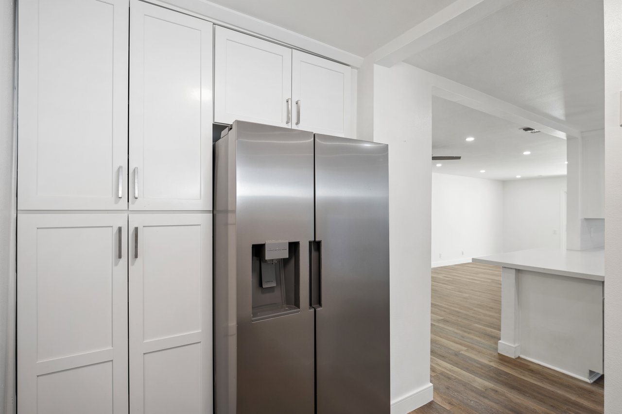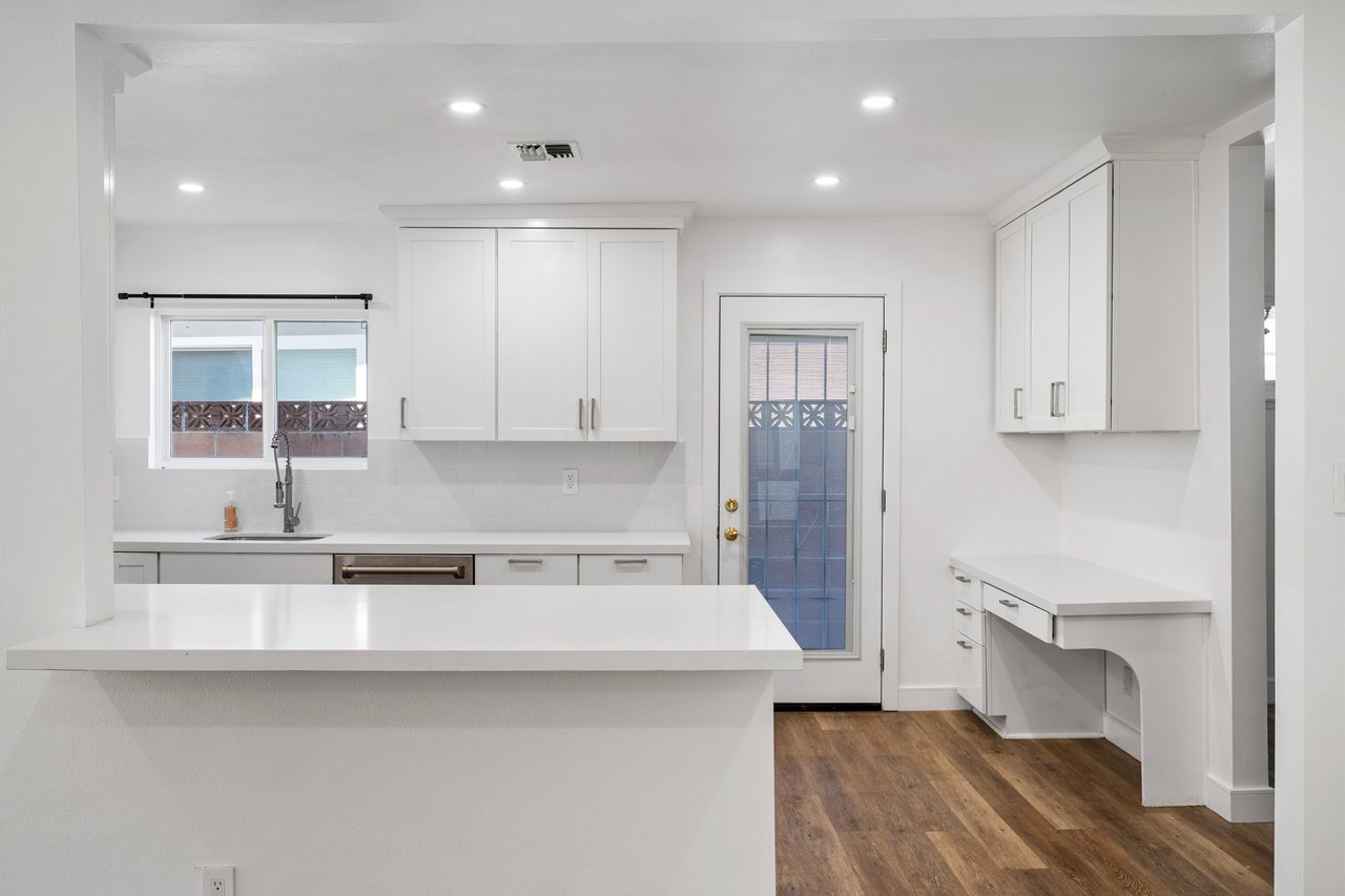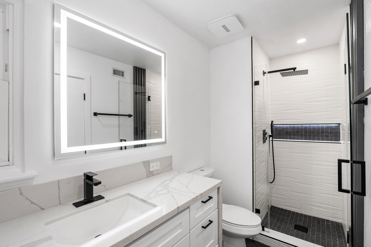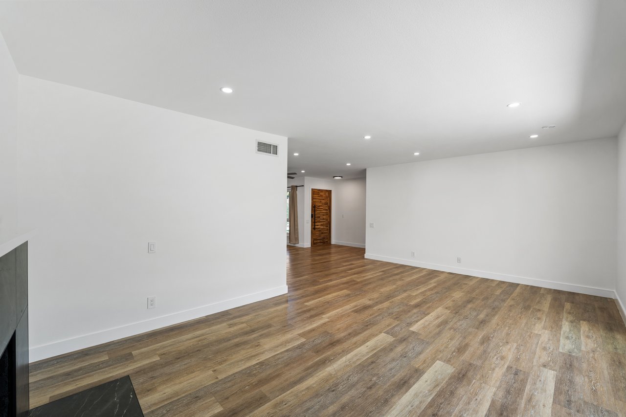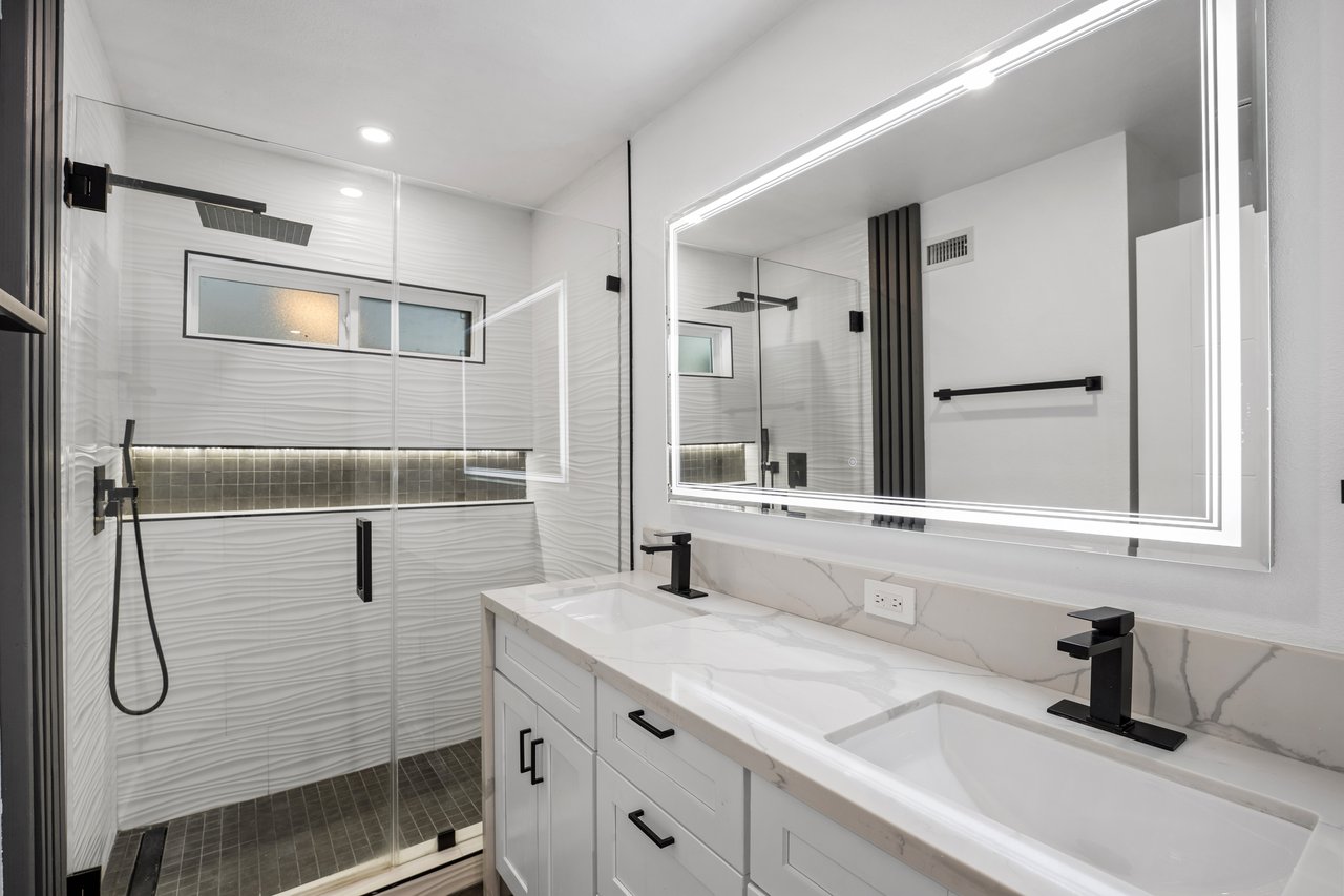 Modern elegance meets thoughtful design in this beautifully updated 4-bedroom, 3-bathroom home. Featuring recessed lighting, double-paned windows and sliders, and stylish wood-like flooring throughout, this home offers a bright and contemporary atmosphere. The front and back yards are wrapped in low-maintenance artificial turf, complementing the brick-inlaid driveway and sleek concrete pavers for impressive curb appeal. Step through the custom artistic wood front door with a modern black keypad lock into a light-filled interior. The open layout flows effortlessly from the dining room to the spacious living room, where a sleek modern fireplace creates a cozy ambiance. The contemporary kitchen showcases white shaker cabinets, quartz countertops, and stainless-steel appliances. Designed for seamless indoor-outdoor living, the covered patio extends the entertainment space while providing shade. The backyard is a true retreat, complete with a putting green and a lower-level area brimming with potential, surrounded by sun-dappled trees. The bathrooms continue the modern aesthetic with black accents, quartz countertops, and LED-lit mirrors are perfect for makeup application. Two bathrooms feature walk-in showers with rain shower heads, handheld sprayers, and sleek, full-length shampoo ledges, while the third offers a shower/tub combo with a handheld shower head. A gleaming white laundry room with washer and dryer hookups is conveniently located off the large 2-car garage, which provides ample storage space. This home is a perfect blend of style, comfort, and functionality don't miss the opportunity to make it yours.