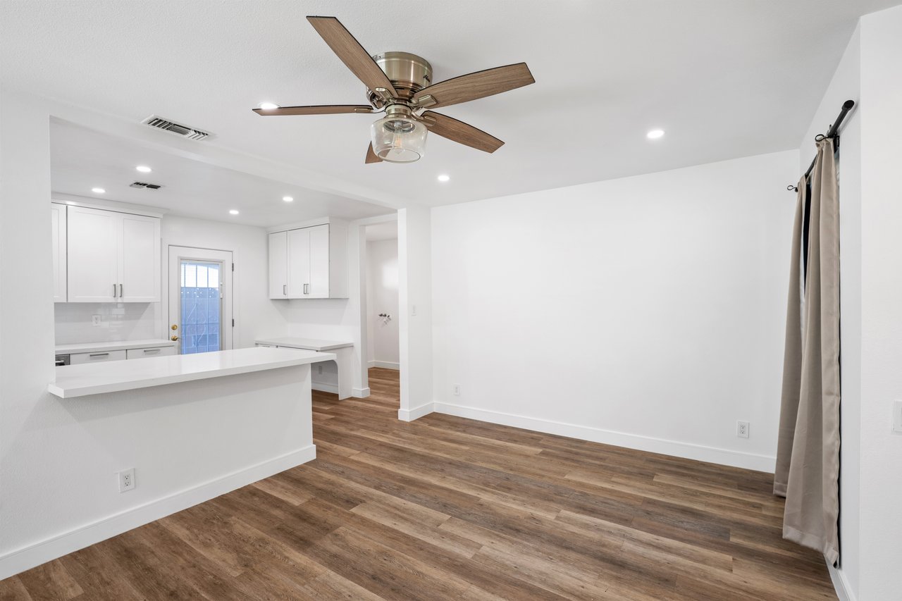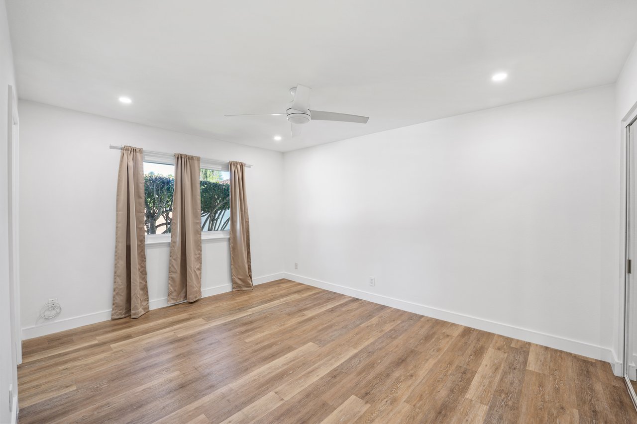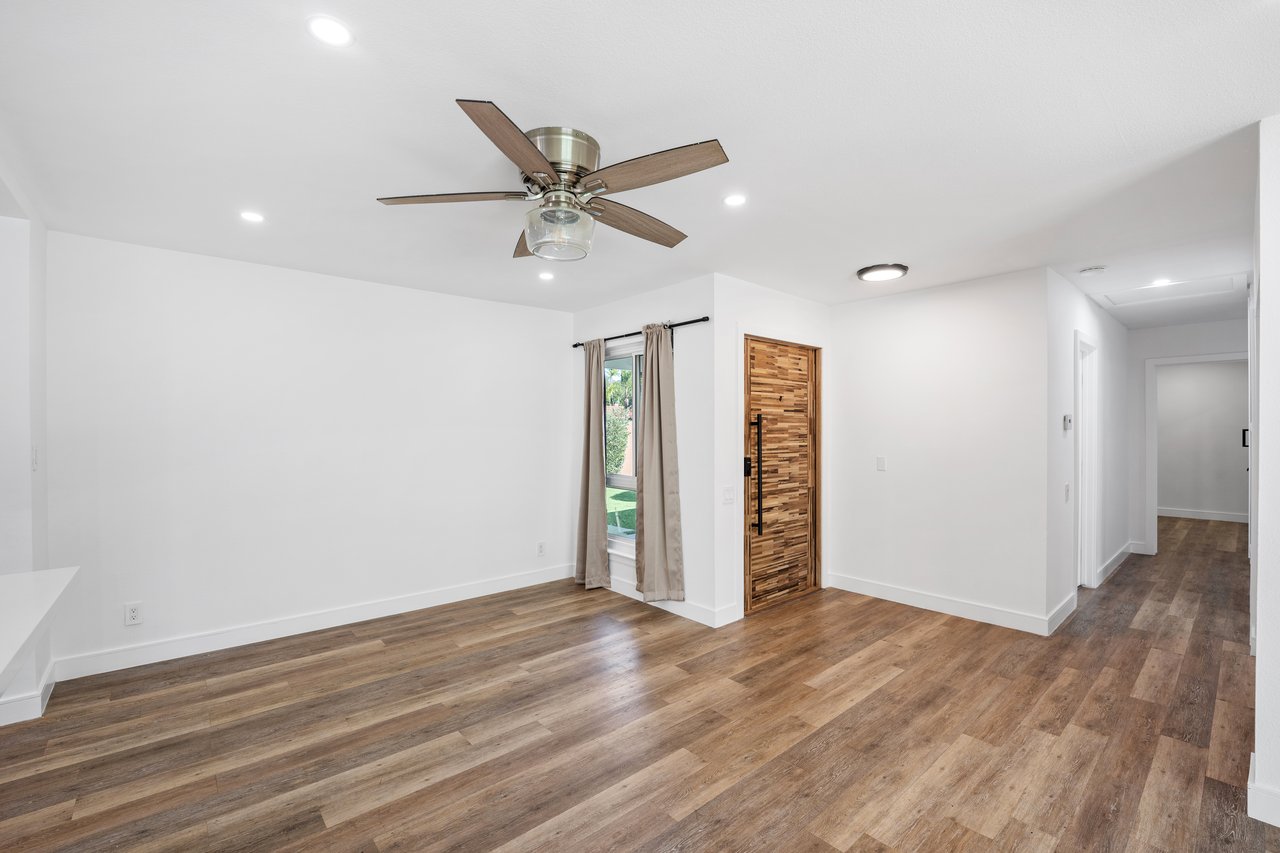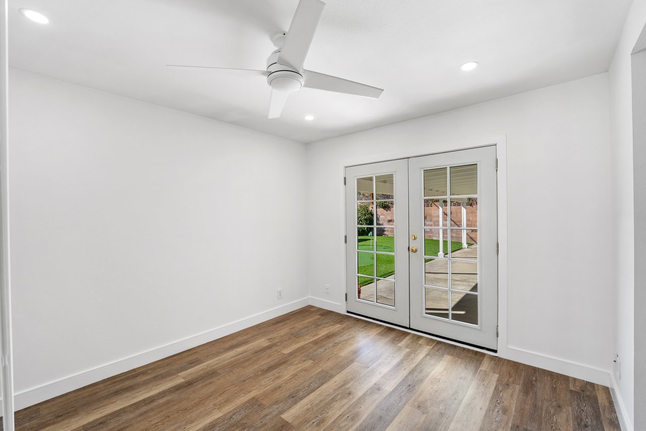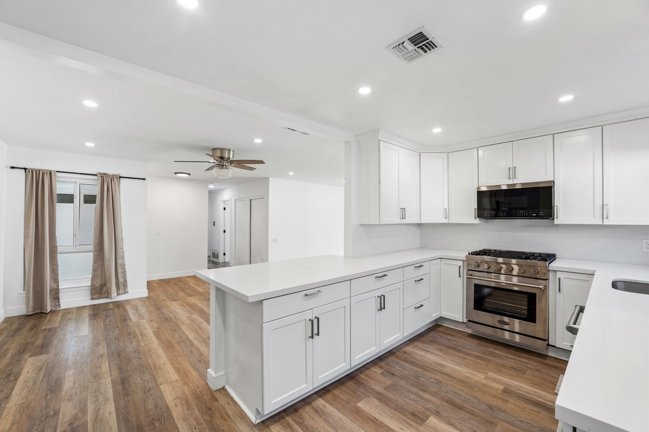Modern elegance meets thoughtful design in this beautifully updated 4-bedroom, 3-bathroom home. Featuring recessed lighting, double-paned windows and sliders, and stylish wood-like flooring throughout, this home offers a bright and contemporary atmosphere. The front and back yards are wrapped in low-maintenance artificial turf, complementing the brick-inlaid driveway and sleek concrete pavers for impressive curb appeal. Step through the custom artistic wood front door with a modern black keypad lock into a light-filled interior. The open layout flows effortlessly from the dining room to the spacious living room, where a sleek modern fireplace creates a cozy ambiance. The contemporary kitchen showcases white shaker cabinets, quartz countertops, and stainless-steel appliances. Designed for seamless indoor-outdoor living, the covered patio extends the entertainment space while providing shade. The backyard is a true retreat, complete with a putting green and a lower-level area brimming with potential, surrounded by sun-dappled trees. The bathrooms continue the modern aesthetic with black accents, quartz countertops, and LED-lit mirrors are perfect for makeup application. Two bathrooms feature walk-in showers with rain shower heads, handheld sprayers, and sleek, full-length shampoo ledges, while the third offers a shower/tub combo with a handheld shower head. A gleaming white laundry room with washer and dryer hookups is conveniently located off the large 2-car garage, which provides ample storage space. This home is a perfect blend of style, comfort, and functionality don't miss the opportunity to make it yours.