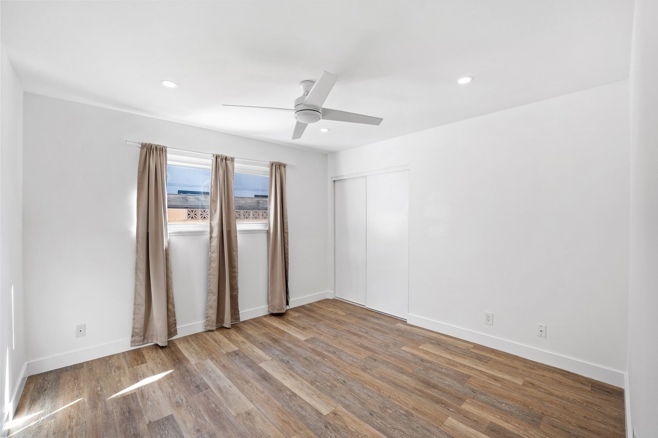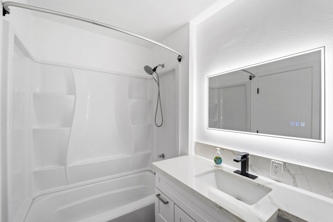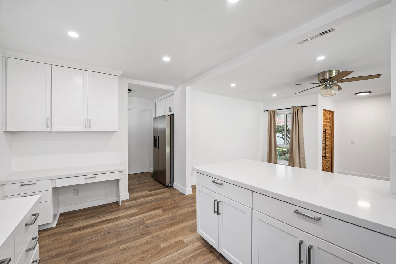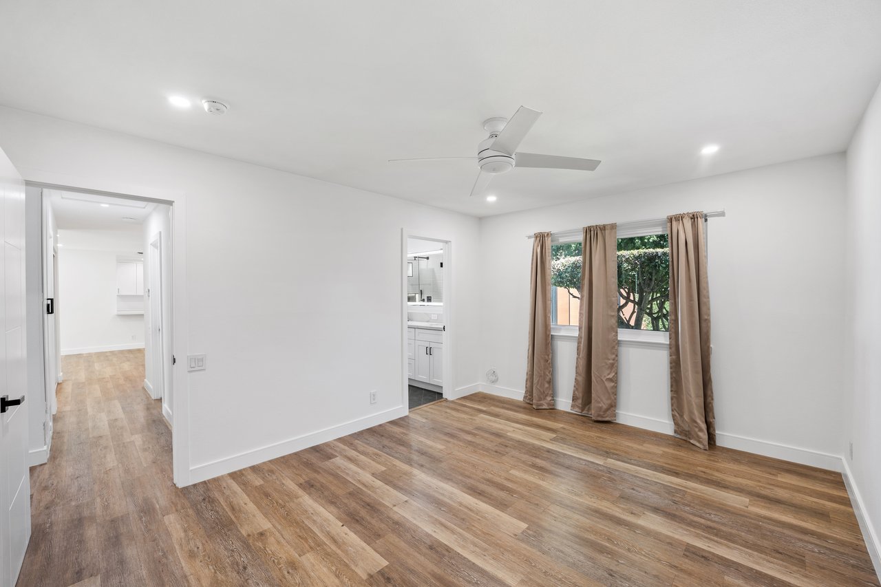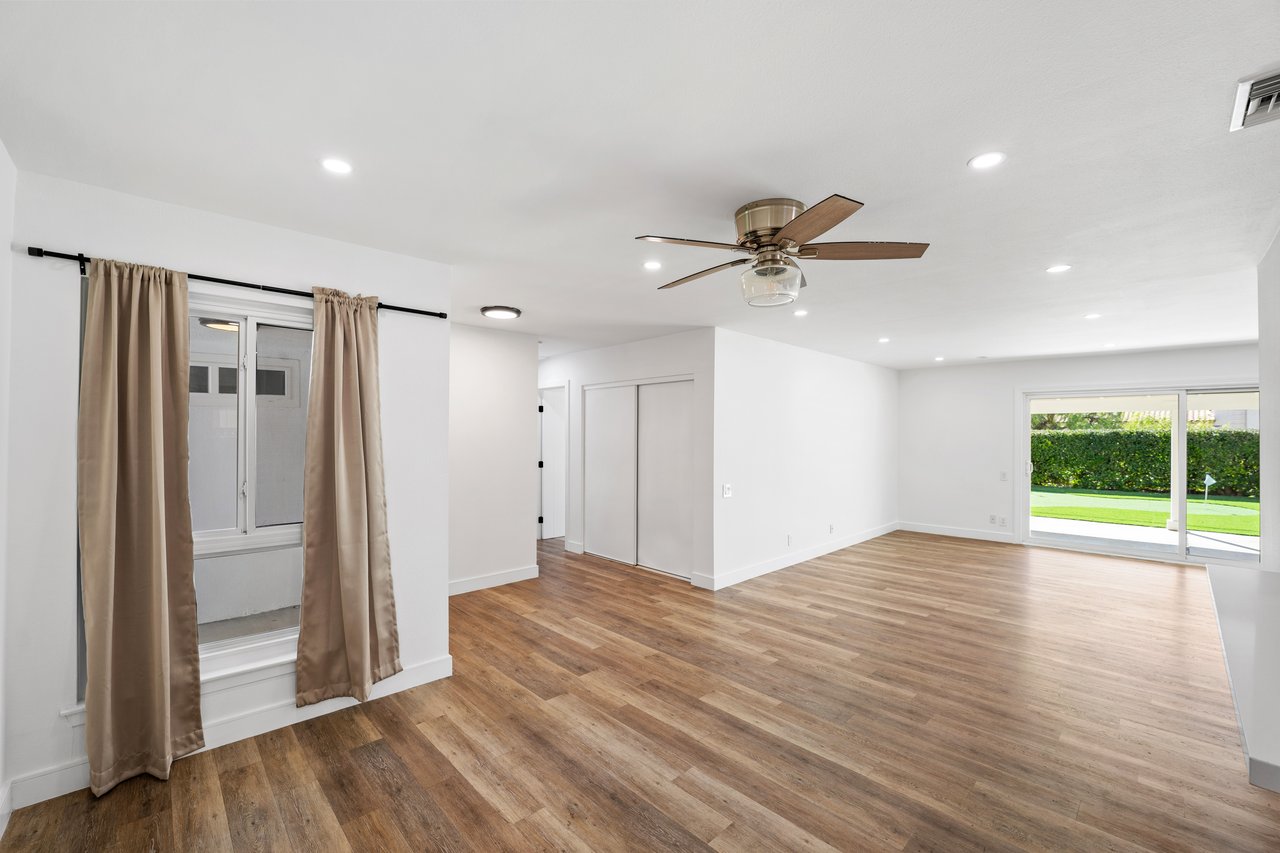Modern elegance meets thoughtful design in this beautifully updated 4-bedroom, 3-bathroom home. Featuring recessed lighting, double-paned windows and sliders, and stylish wood-like flooring throughout, this home offers a bright and contemporary atmosphere. The front and back yards are wrapped in low-maintenance artificial turf, complementing the brick-inlaid driveway and sleek concrete pavers for impressive curb appeal. Step through the custom artistic wood front door with a modern black keypad lock into a light-filled interior. The open layout flows effortlessly from the dining room to the spacious living room, where a sleek modern fireplace creates a cozy ambiance. The contemporary kitchen showcases white shaker cabinets, quartz countertops, and stainless-steel appliances. Designed for seamless indoor-outdoor living, the covered patio extends the entertainment space while providing shade. The backyard is a true retreat, complete with a putting green and a lower-level area brimming with potential, surrounded by sun-dappled trees. The bathrooms continue the modern aesthetic with black accents, quartz countertops, and LED-lit mirrors are perfect for makeup application. Two bathrooms feature walk-in showers with rain shower heads, handheld sprayers, and sleek, full-length shampoo ledges, while the third offers a shower/tub combo with a handheld shower head. A gleaming white laundry room with washer and dryer hookups is conveniently located off the large 2-car garage, which provides ample storage space. This home is a perfect blend of style, comfort, and functionality don't miss the opportunity to make it yours.