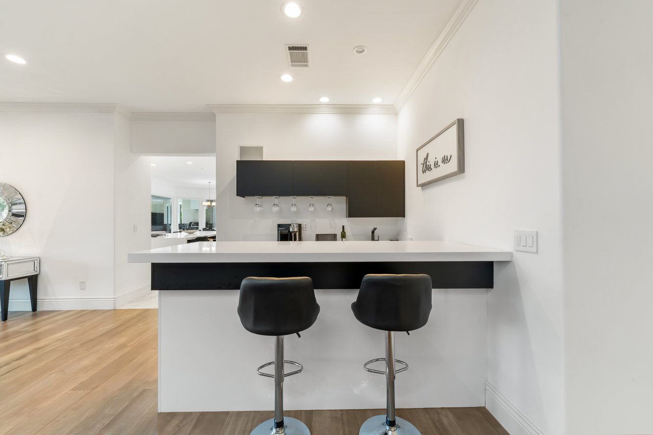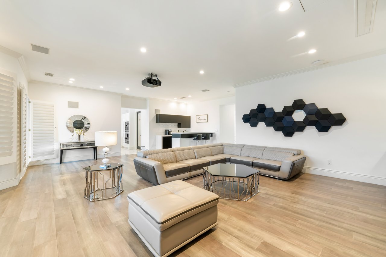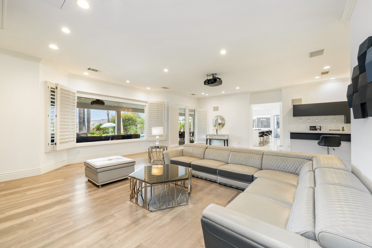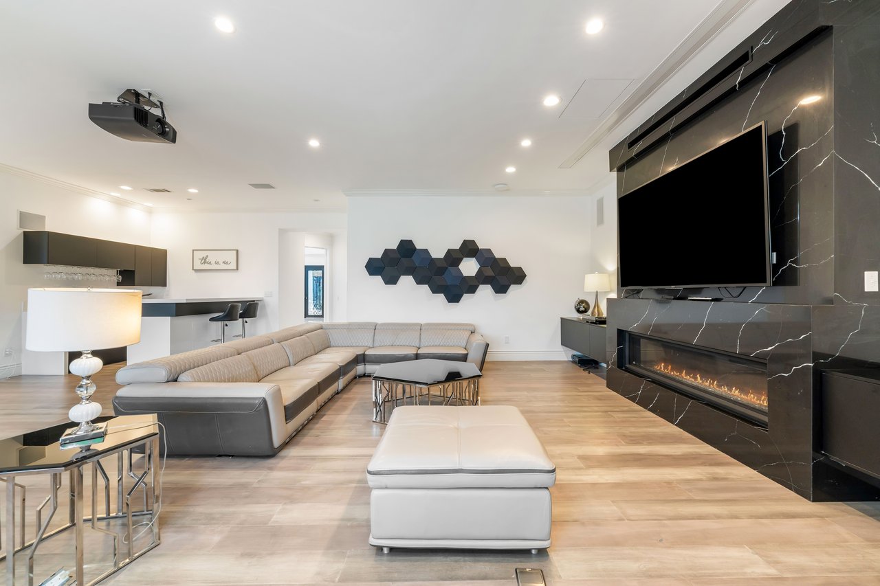 Designed for elevated modern living, the home is outfitted with Control4 home automation, LED lighting, Cat-6 wiring, and a whole-house sound system. The expansive family room is ideal for both entertaining and everyday comfort, complete with a fireplace, custom bar, built-in projector, and dual wine coolers—perfect for movie nights and gatherings. An oversized formal dining room comfortably accommodates 30+ guests.