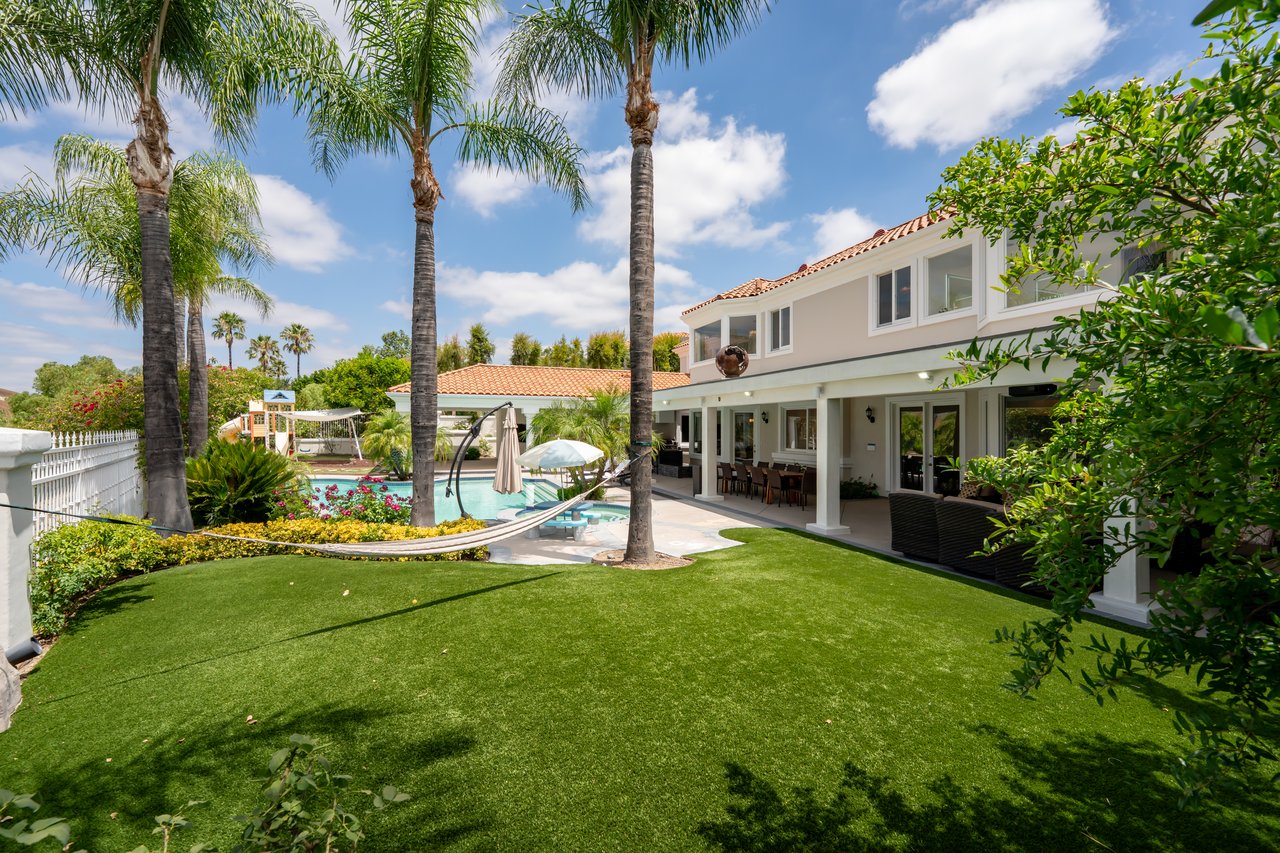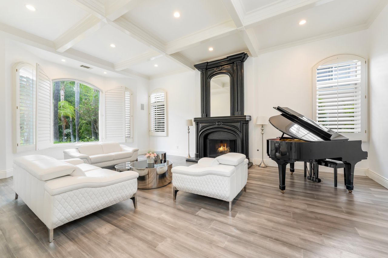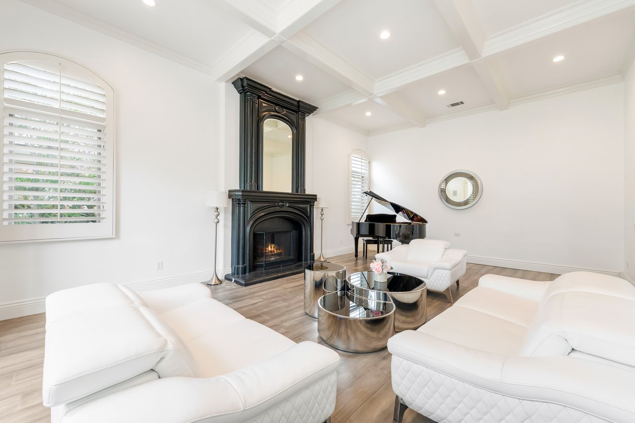 The luxurious primary suite serves as a private retreat with a sitting area, fireplace, dual walk-in closets, and a spa-inspired bath featuring a steam shower. Step outside to a resort-style backyard offering a saltwater pool, outdoor kitchen with BBQ, refrigerator, stove, and warming drawer, multiple covered seating areas, and an outdoor projector—creating the ultimate indoor-outdoor lifestyle.