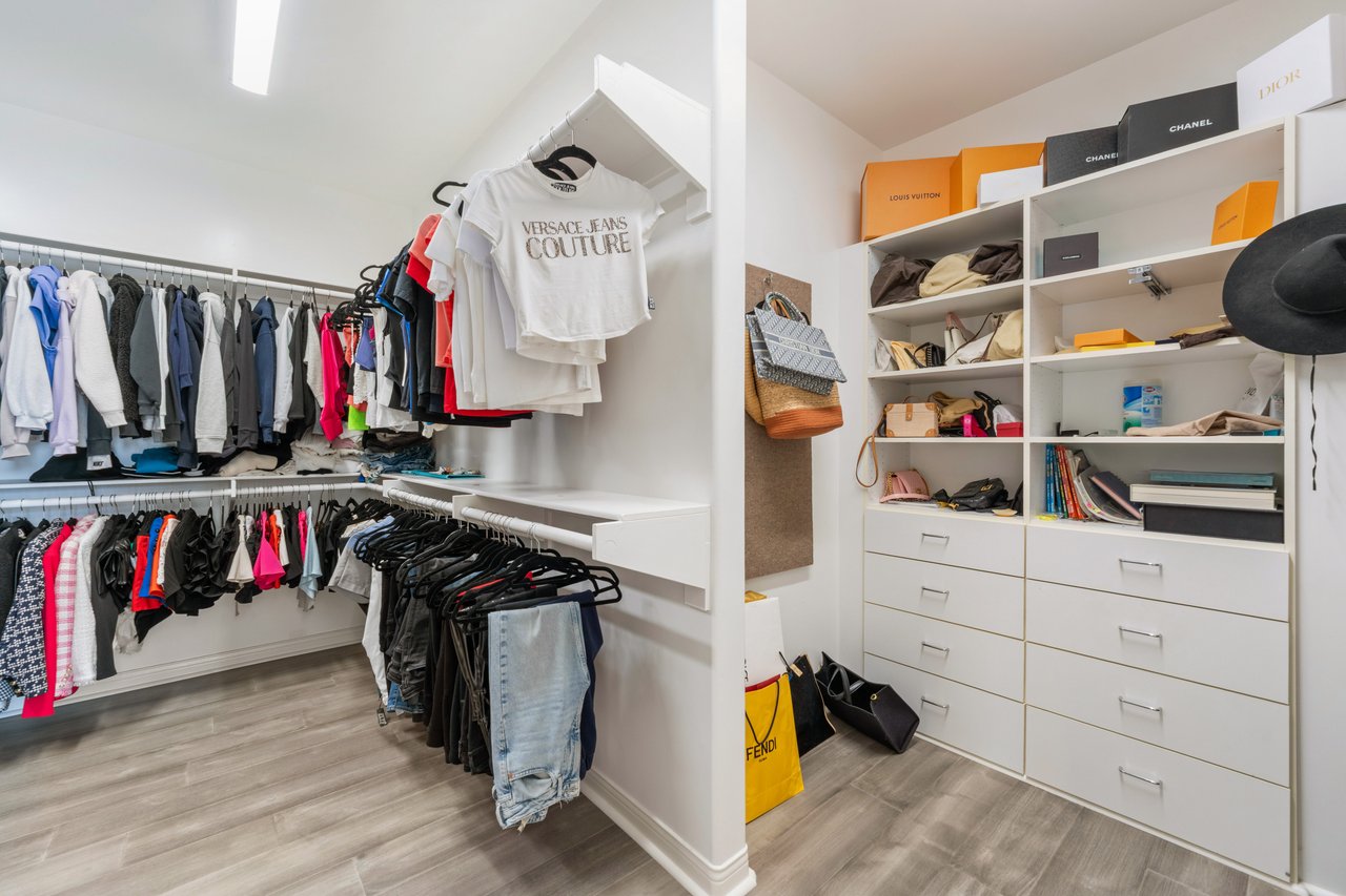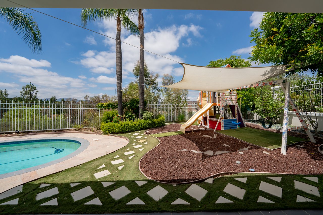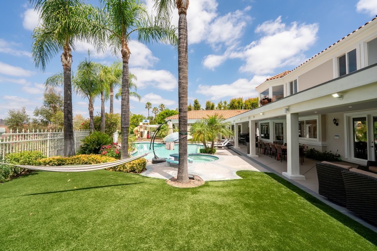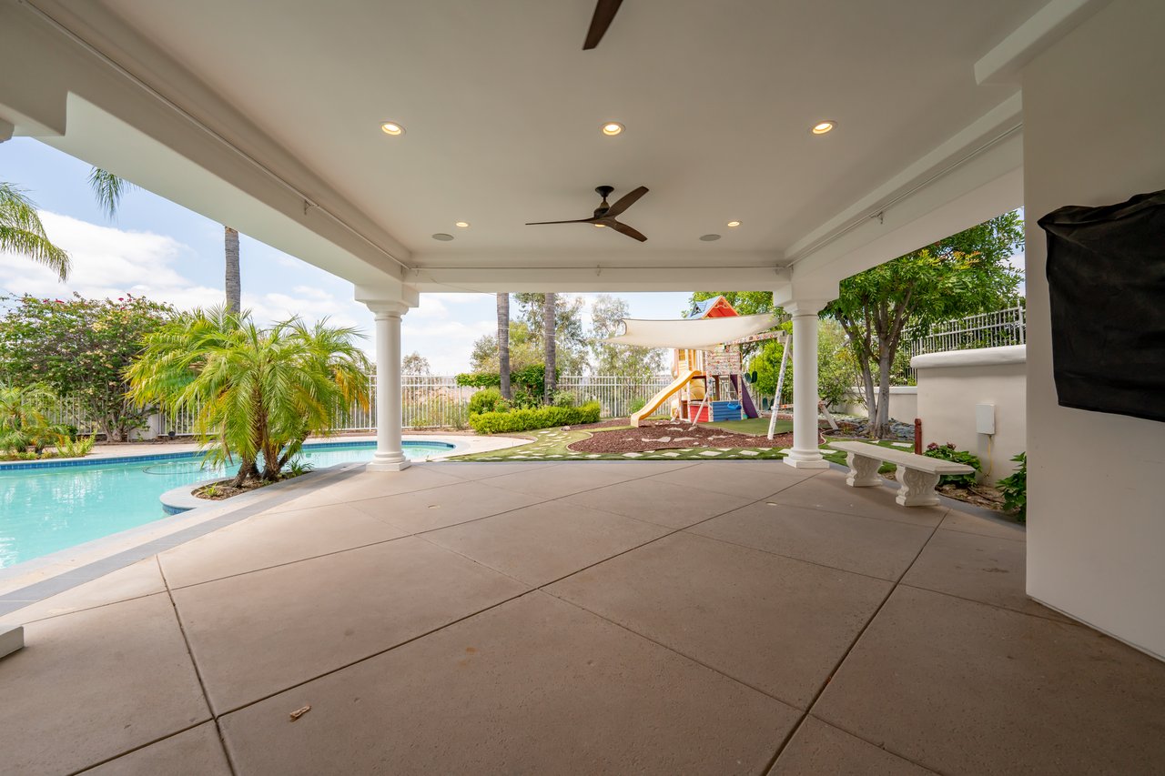 The luxurious primary suite serves as a private retreat with a sitting area, fireplace, dual walk-in closets, and a spa-inspired bath featuring a steam shower. Step outside to a resort-style backyard offering a saltwater pool, outdoor kitchen with BBQ, refrigerator, stove, and warming drawer, multiple covered seating areas, and an outdoor projector—creating the ultimate indoor-outdoor lifestyle.