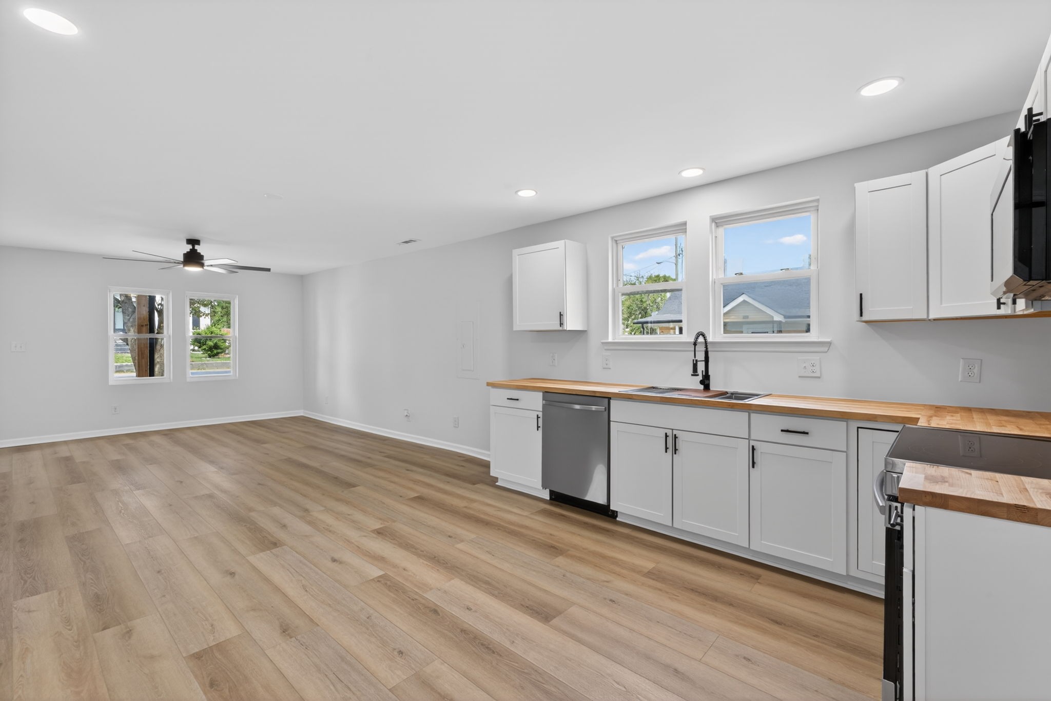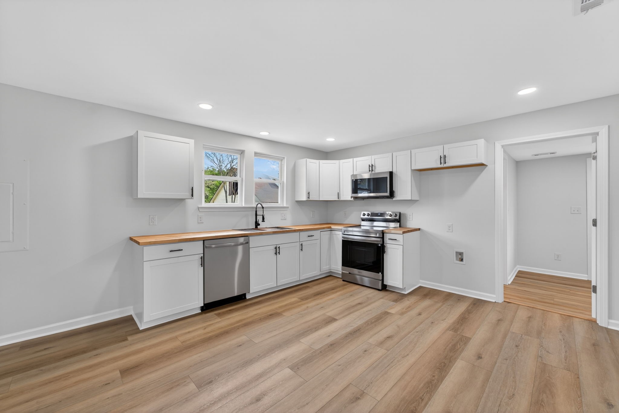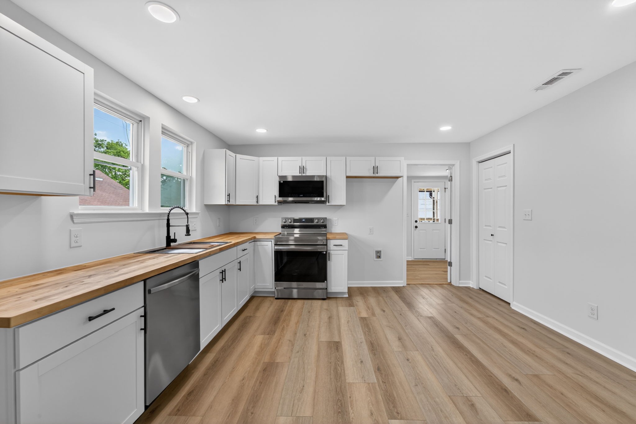 The brand-new kitchen shines with shaker-style cabinets, butcher block countertops, a stainless-steel sink, and new stainless appliances including a range, microwave, and dishwasher. A built-in pantry adds functionality and charm.