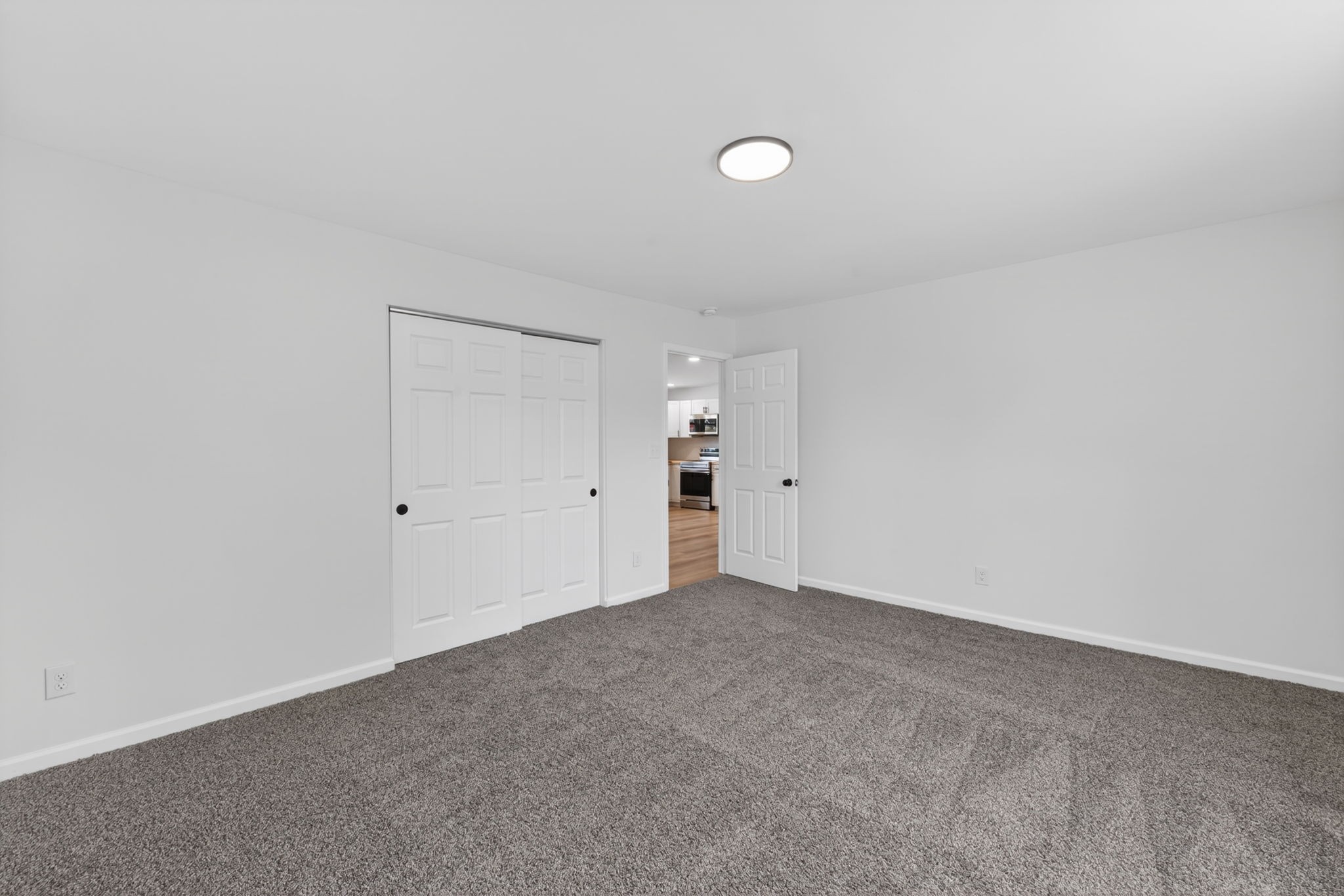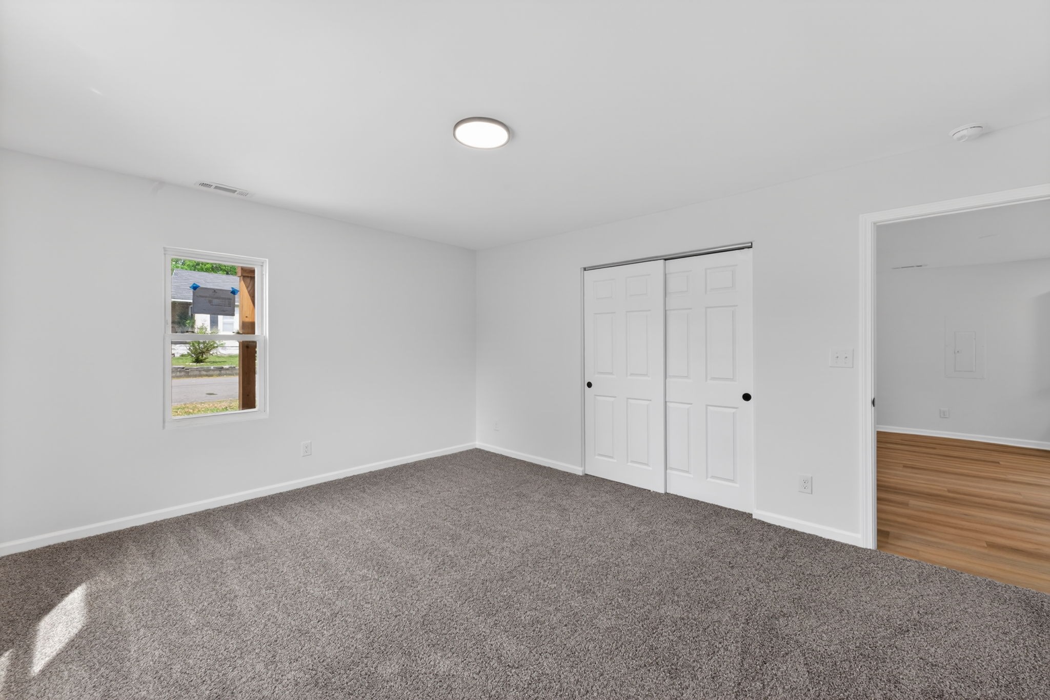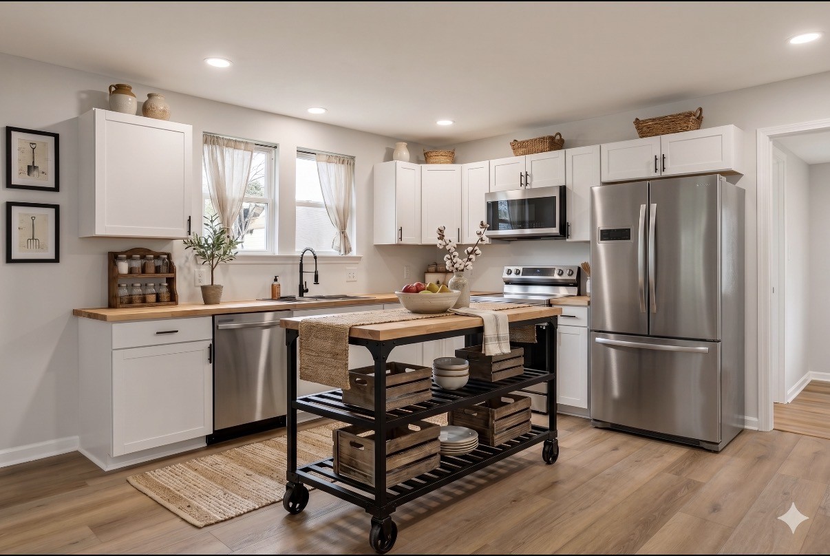 The brand-new kitchen shines with shaker-style cabinets, butcher block countertops, a stainless-steel sink, and new stainless appliances including a range, microwave, and dishwasher. A built-in pantry adds functionality and charm.