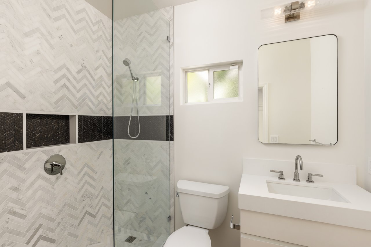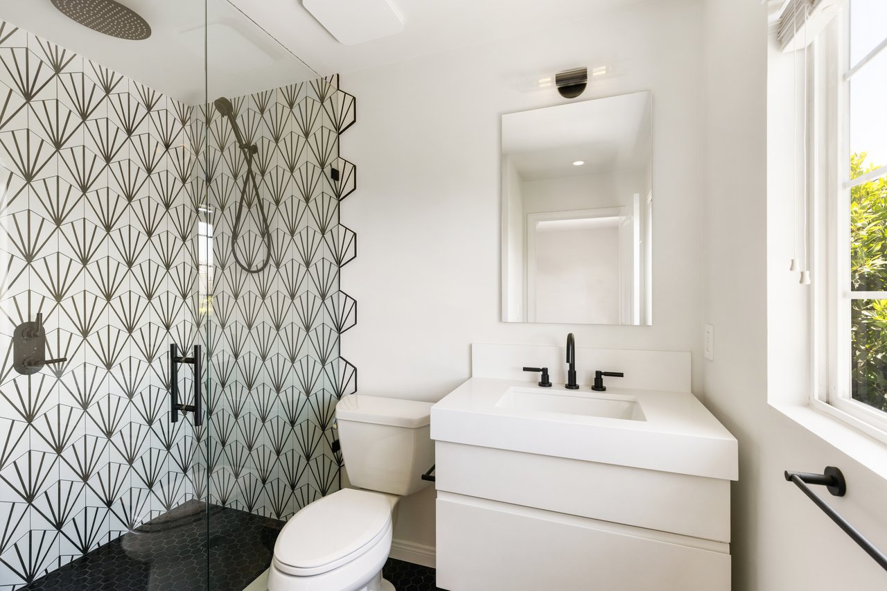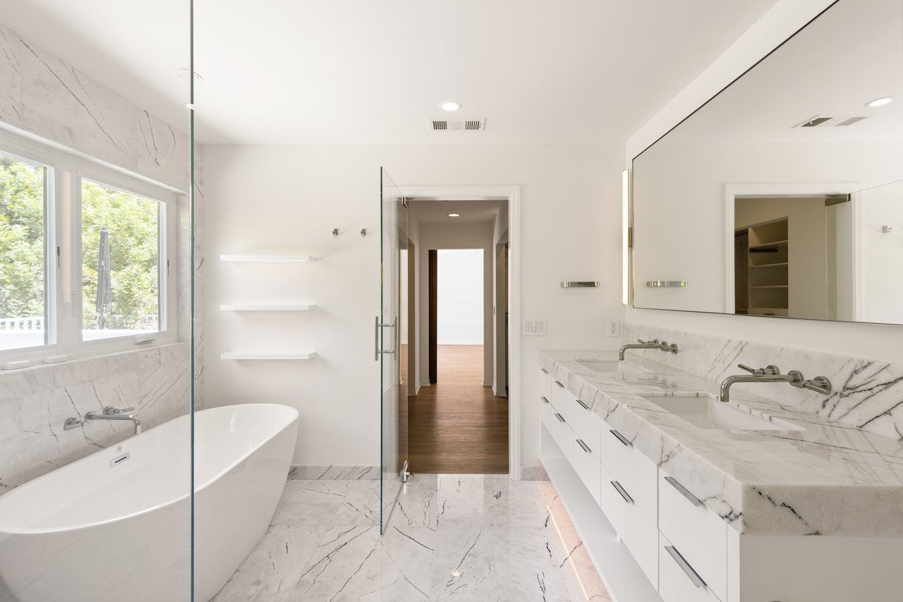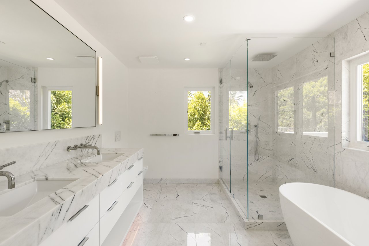 The primary suite is pure decadence: new custom closets, and a spa-inspired bath with Carrera marble, a freestanding soaking tub, dual vanities, and a rain shower. Each additional bathroom has been thoughtfully reimagined, including a powder room adorned with Carrera marble and plaster walls.