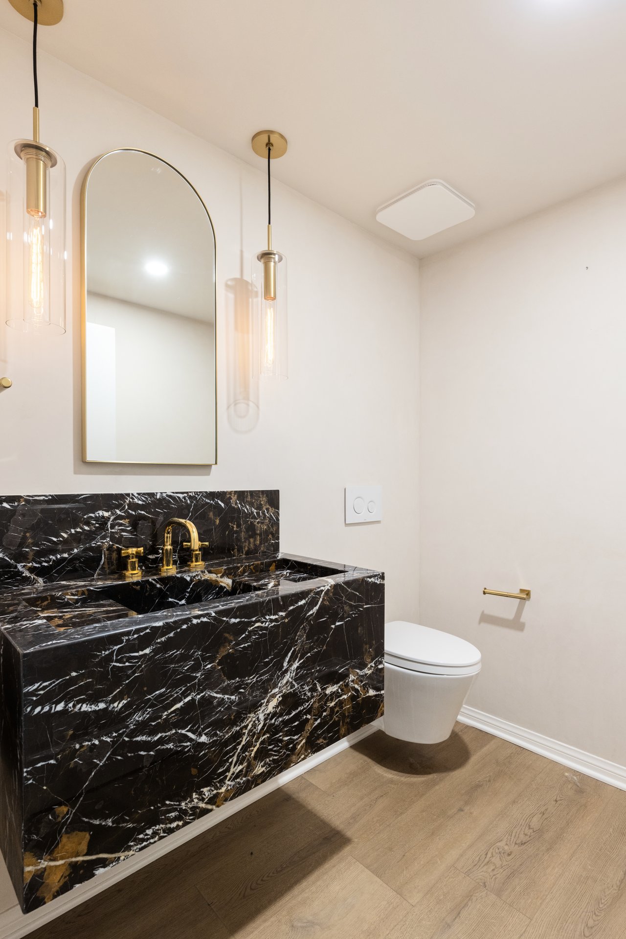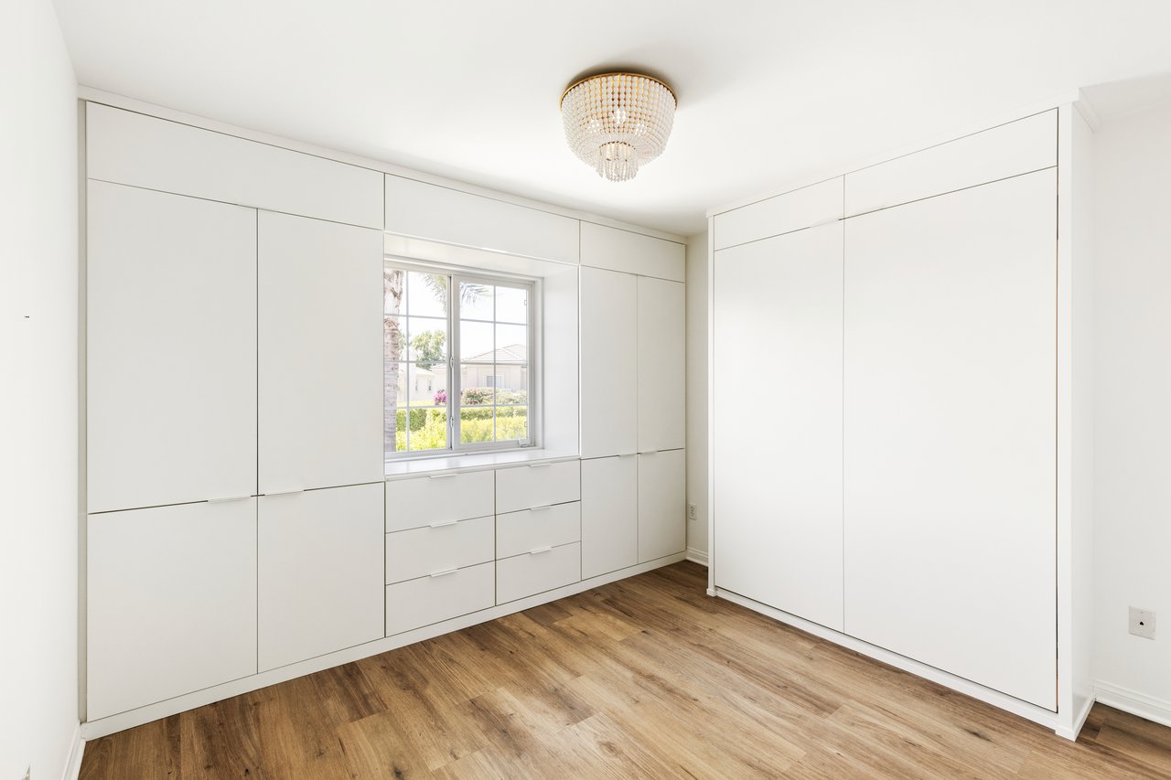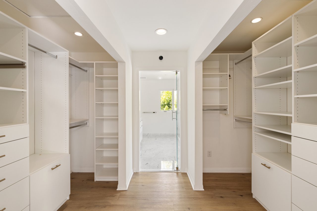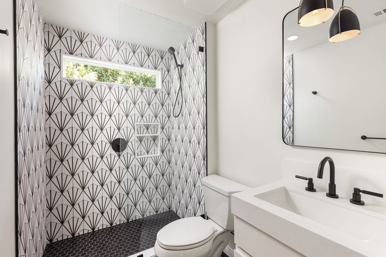 The primary suite is pure decadence: new custom closets, and a spa-inspired bath with Carrera marble, a freestanding soaking tub, dual vanities, and a rain shower. Each additional bathroom has been thoughtfully reimagined, including a powder room adorned with Carrera marble and plaster walls.