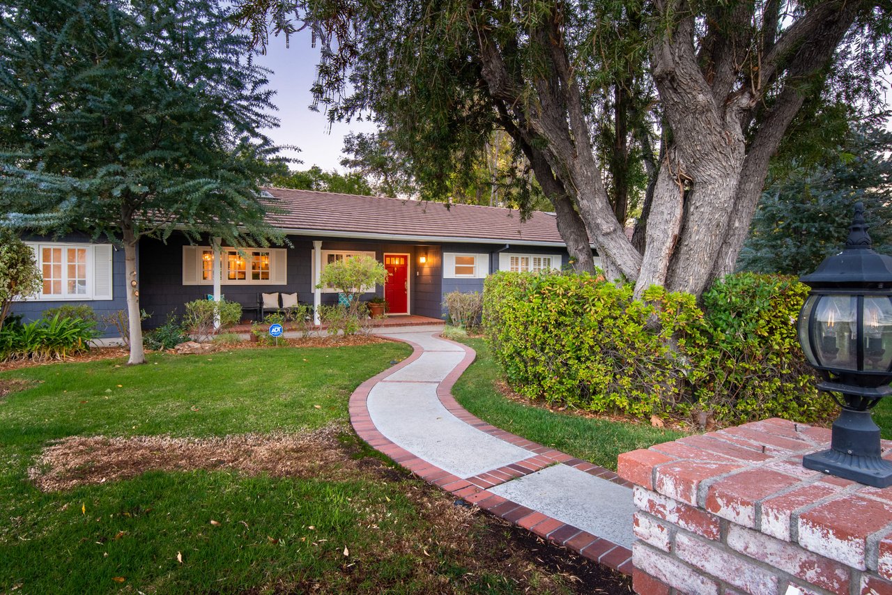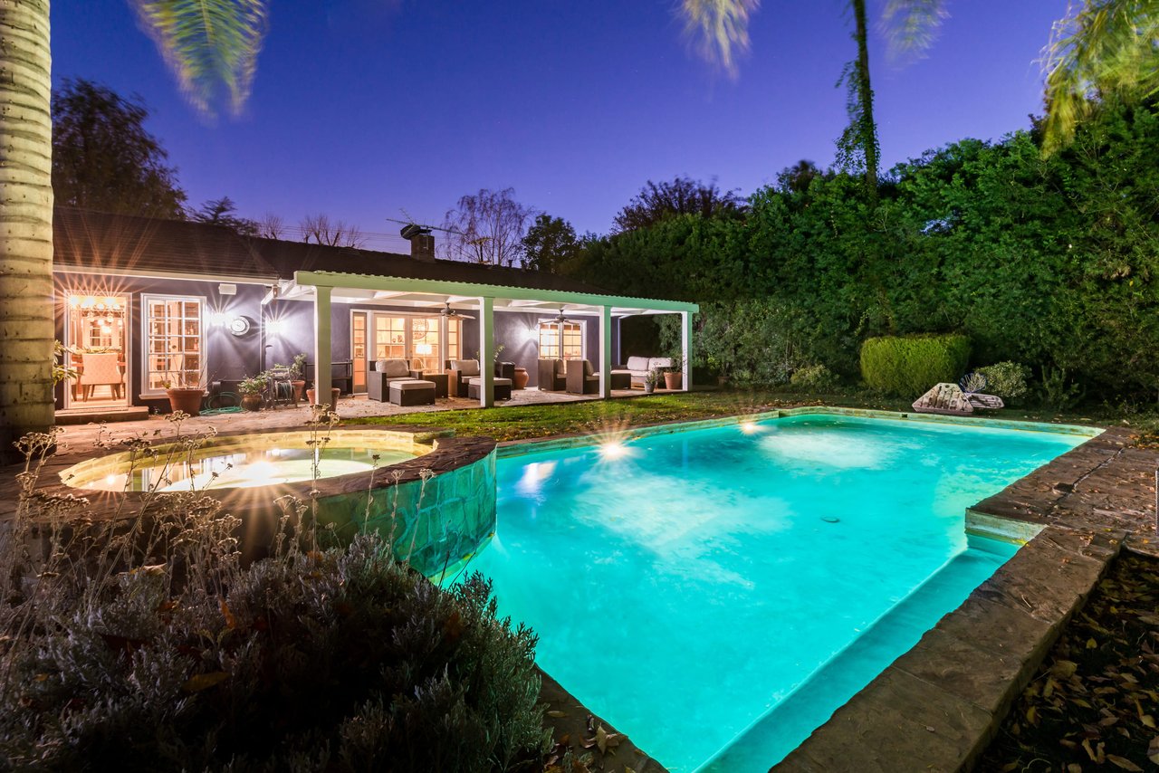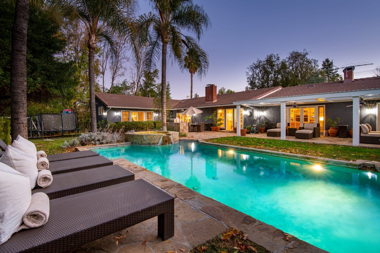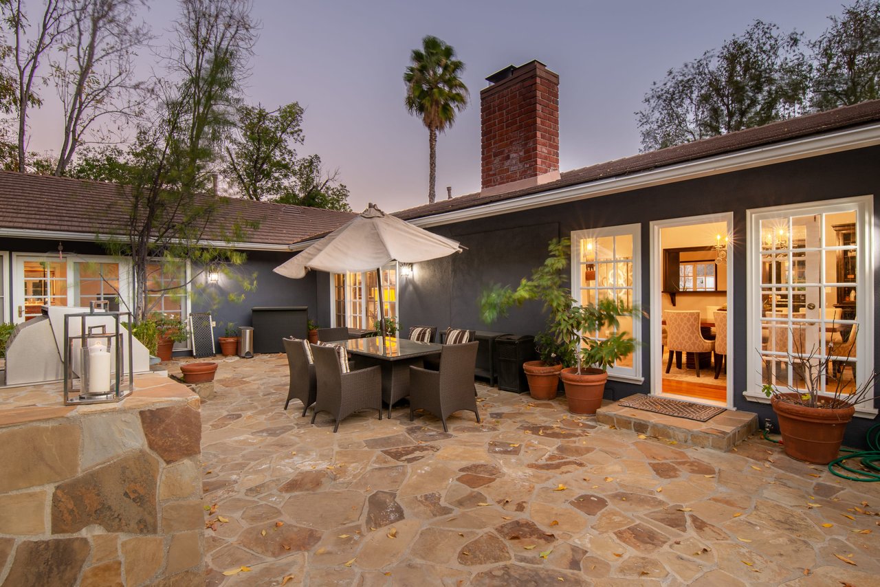 Set on a quiet street south of Ventura Boulevard, this exquisite single story home has style, warmth & charm! Featuring 5 bedrooms, 4 bathrooms, & an inviting backyard w/ classic flagstone patios, a built in BBQ, lounging patio w/ overhead fans, a fountain & resort style spa that cascades into the sparkling pool. Featuring wood & slate floors throughout, the living room offers high vaulted ceilings w/ wood beams, french doors, & has a great flow for entertaining. The family room also has a wood beam ceiling that creates a cozy space that flows to the 5th bedroom & bath that is located on the opposite side of the house - ideal as a maids quarters. The gourmet kitchen boasts a center island, wine cooler, granite counters, a Wolf range, & a Sub-Zero refrigerator. An inviting office/library is located next to the spacious master w/ a view to the beautiful outdoor grounds of mature landscape & greenery. Home is wired for music in various rooms & the yard & has a built in security system.